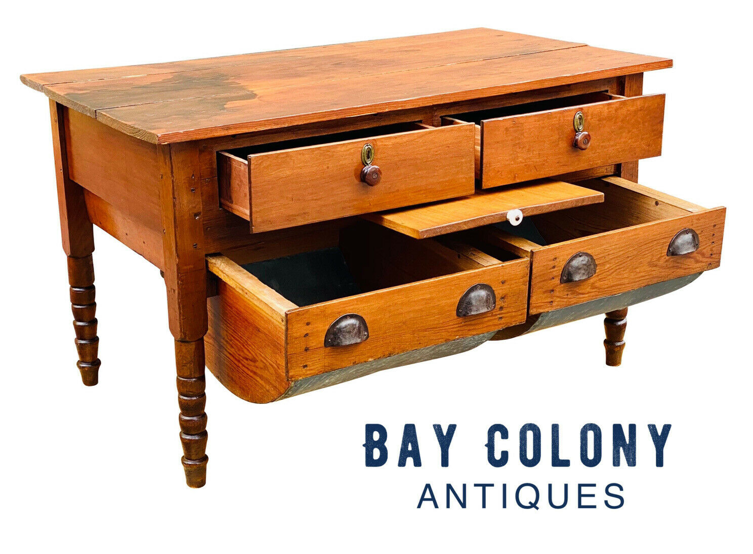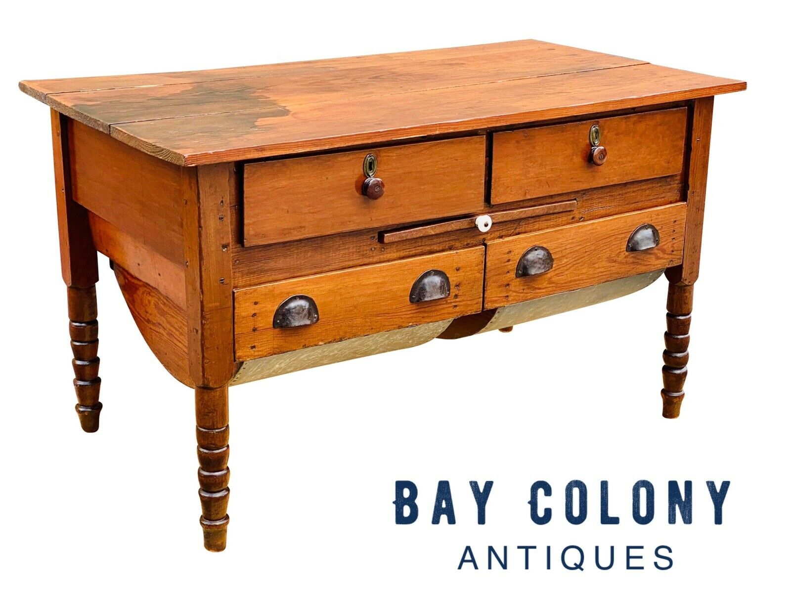 Bay Colony Antiques is proud to offer for sale this fantastic & rare 19th century antique Victorian yellow pine sow belly bakers table. These predate Hoosier cabinets and are really nice to have around the kitchen. The table has four large drawers with the original pull out work tab present. The lower sow belly or possum belly drawers are meant to store flour and other grains with a zinc liner to keep rodents out. The table is crafted from old growth, Southern Yellow Pine and is in great condition with our only condition note being a slight discoloration to the top. The table measures 52 1/4" wide x 28 1/4" deep x 30 1/2" tall. The work tab measures 18 3/4" wide x 24" deep with a height of 22 1/2" at the surface.