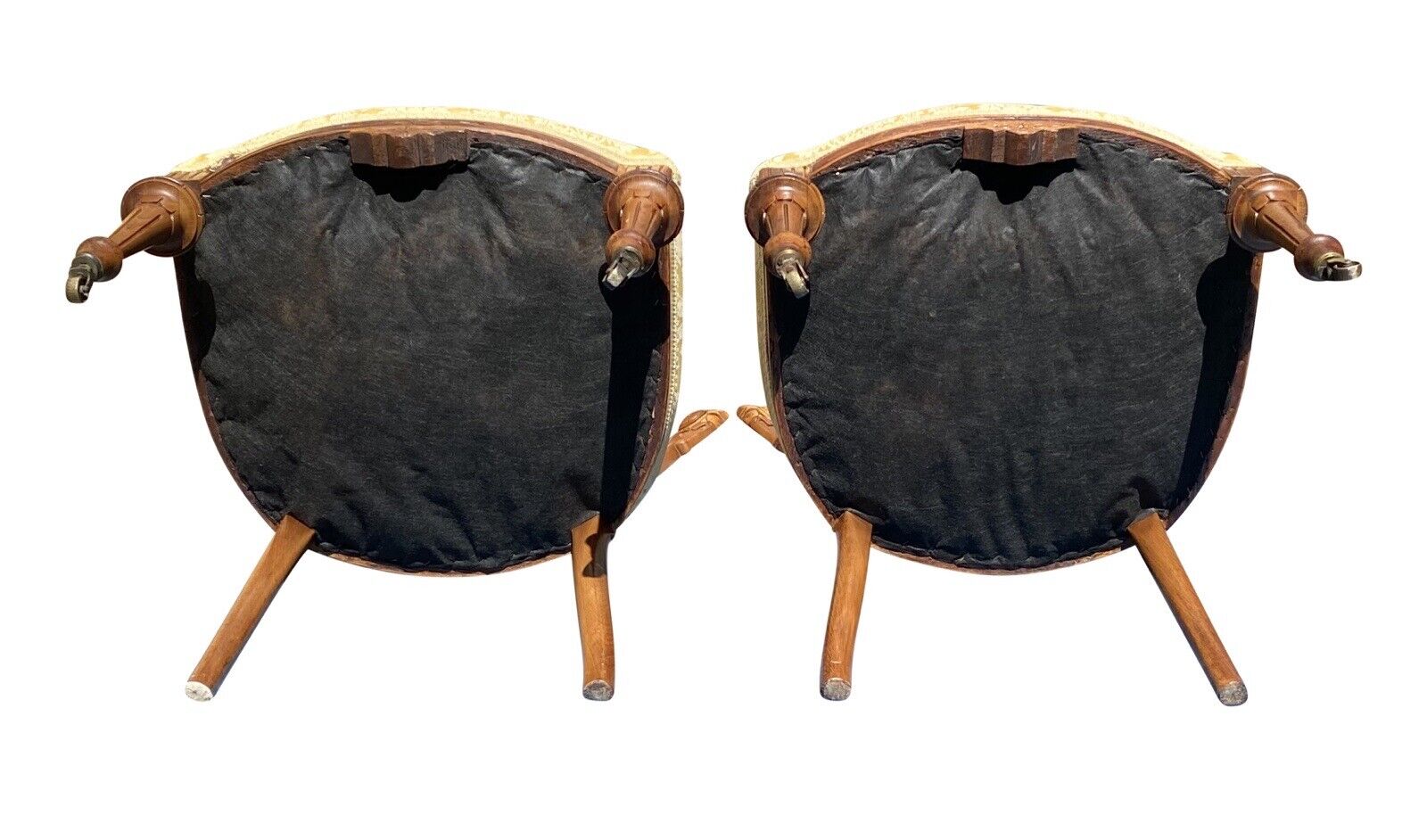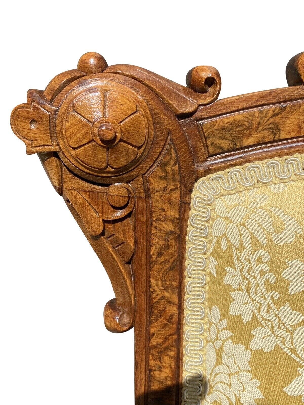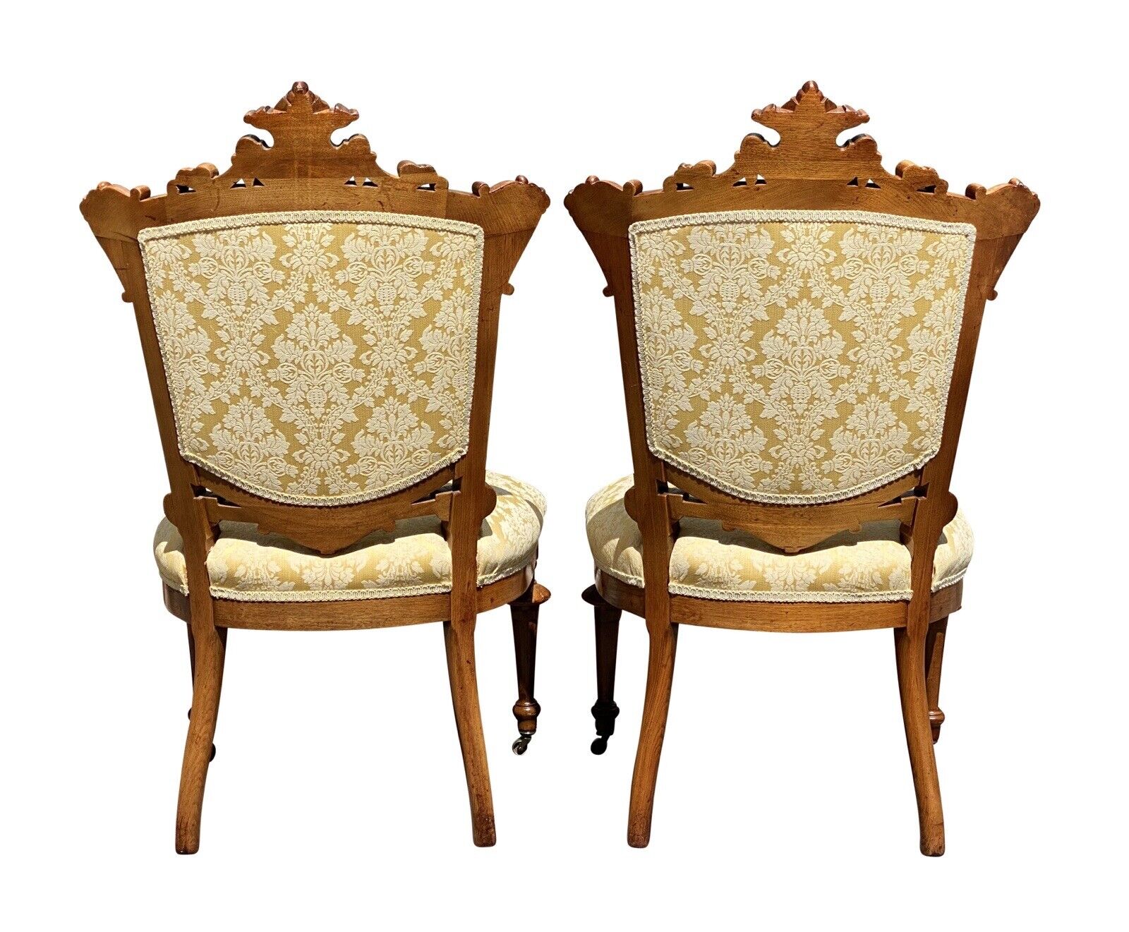 Bay Colony Antiques is proud to offer for sale this fantastic set of 19th century antique Victorian Walnut parlor chairs. Advances in technology during the Victorian era made furniture cheaper to produce and more widely available to families of modest means. The majority of Victorian furniture, while well made, isn’t really worth enough for us to ship around the country. We pass up on so many good Victorian chair & dressers but there was no way we were letting this set go. These were clearly made in a top tier cabinet shop, probably in New York, which was home to some of the most successful cabinet makers of the period including Alexander Roux, John Belter, Thomas Brooks, Herter Brothers, Pottier & Stymus, etc. We’ve handled Roux pieces in the past with very similar carvings on the seat rail, but the crest is more in line with Brooks’ work. The chairs are in the Renaissance Revival style with a yellow brocade fabric. The upholstery is nice & clean and was masterfully done at a great cost to the previous owner. The fabric has a nice sheen to it and we believe it's mercerized cotton. The chair backs have a burled Walnut border with impeccable carving work on the crest. The center has bellflower & scroll carvings with a round cabochon with incised carvings. The ears have geometric flower carvings surround by stylized Acanthus Leafs which make another appearance at the bottom of the chair back. The front legs are turned with a dramatic flared cuff towards the top with petal carvings below. The front legs also have fluted carvings and are capped with brass caster wheels. The chairs are in excellent condition with our only condition notes being a couple of veneer chips on the seat rail of the chair on the far left in our gallery image, and a small veneer loss on the round cabochon on the far-right chair that we have a stand-alone picture of. We’d be happy to ask our restorer to patch the veneers if our end client wishes. The chairs measure 22 1/4” wide x 25 1/2” deep x 39 1/4” tall with a 17 1/2” seat height.