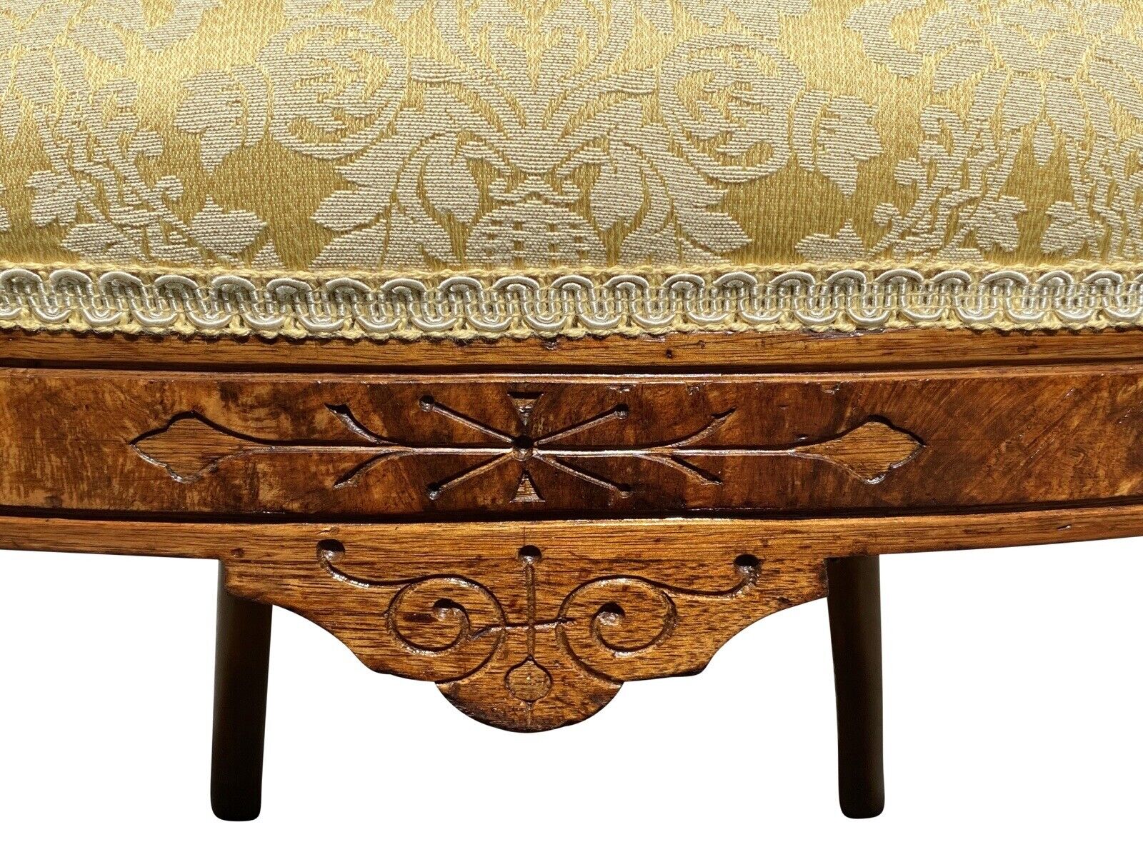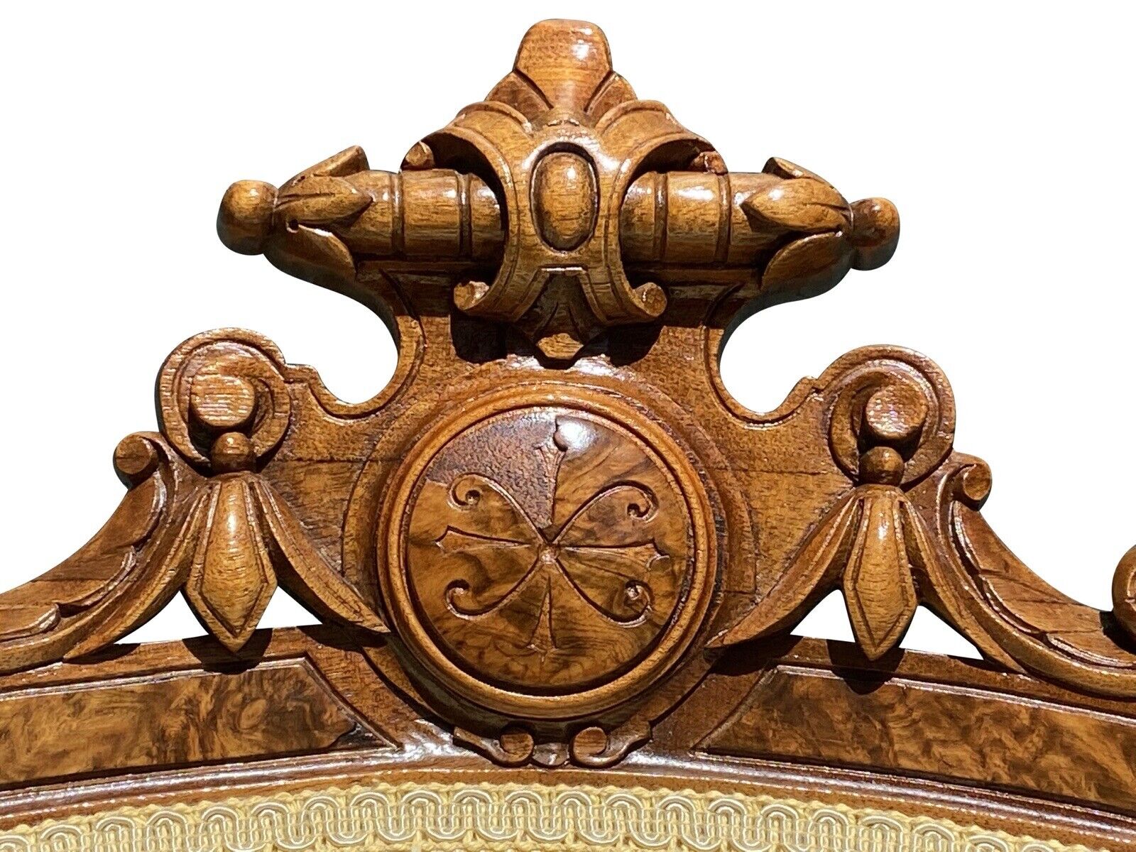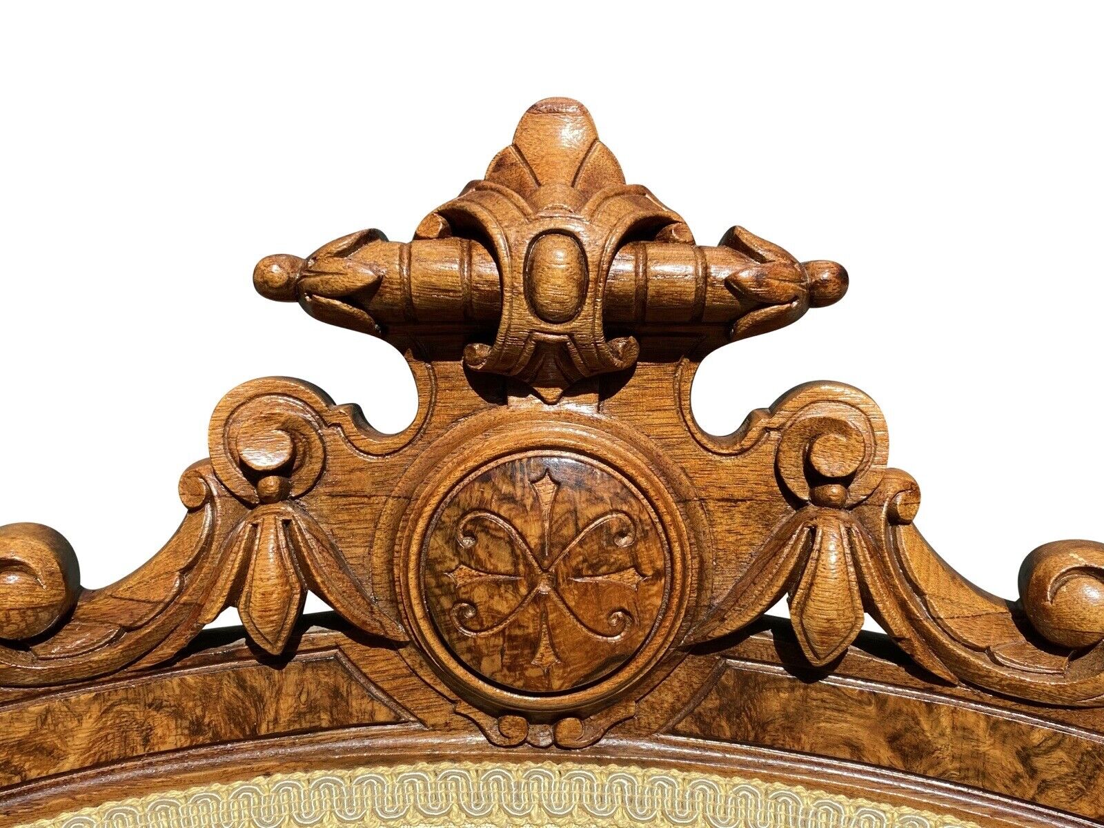 Bay Colony Antiques is proud to offer for sale this fantastic set of 19th century antique Victorian Walnut parlor chairs. Advances in technology during the Victorian era made furniture cheaper to produce and more widely available to families of modest means. The majority of Victorian furniture, while well made, isn’t really worth enough for us to ship around the country. We pass up on so many good Victorian chair & dressers but there was no way we were letting this set go. These were clearly made in a top tier cabinet shop, probably in New York, which was home to some of the most successful cabinet makers of the period including Alexander Roux, John Belter, Thomas Brooks, Herter Brothers, Pottier & Stymus, etc. We’ve handled Roux pieces in the past with very similar carvings on the seat rail, but the crest is more in line with Brooks’ work. The chairs are in the Renaissance Revival style with a yellow brocade fabric. The upholstery is nice & clean and was masterfully done at a great cost to the previous owner. The fabric has a nice sheen to it and we believe it's mercerized cotton. The chair backs have a burled Walnut border with impeccable carving work on the crest. The center has bellflower & scroll carvings with a round cabochon with incised carvings. The ears have geometric flower carvings surround by stylized Acanthus Leafs which make another appearance at the bottom of the chair back. The front legs are turned with a dramatic flared cuff towards the top with petal carvings below. The front legs also have fluted carvings and are capped with brass caster wheels. The chairs are in excellent condition with our only condition notes being a couple of veneer chips on the seat rail of the chair on the far left in our gallery image, and a small veneer loss on the round cabochon on the far-right chair that we have a stand-alone picture of. We’d be happy to ask our restorer to patch the veneers if our end client wishes. The chairs measure 22 1/4” wide x 25 1/2” deep x 39 1/4” tall with a 17 1/2” seat height.