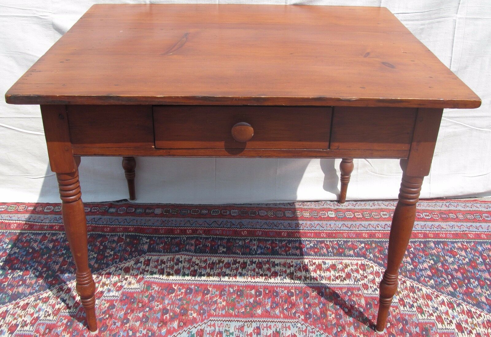 We are pleased to offer you this very nice early 19th Century Pine Ohio River Valley Sheraton Tavern Table. As far as the discipline of American period Tavern Tables goes, this is a very large specimen and a wonderful representation of the charming American Furniture of the Ohio River Valley. It is joined by mortise, tenons, proud pegs and features finely defined turned legs. It is equipped with a large generous center drawer that is 26" in depth. The table is 40 3/4" long, 34 3/4" wide and 30 1/4" tall giving a wide multitude of uses.