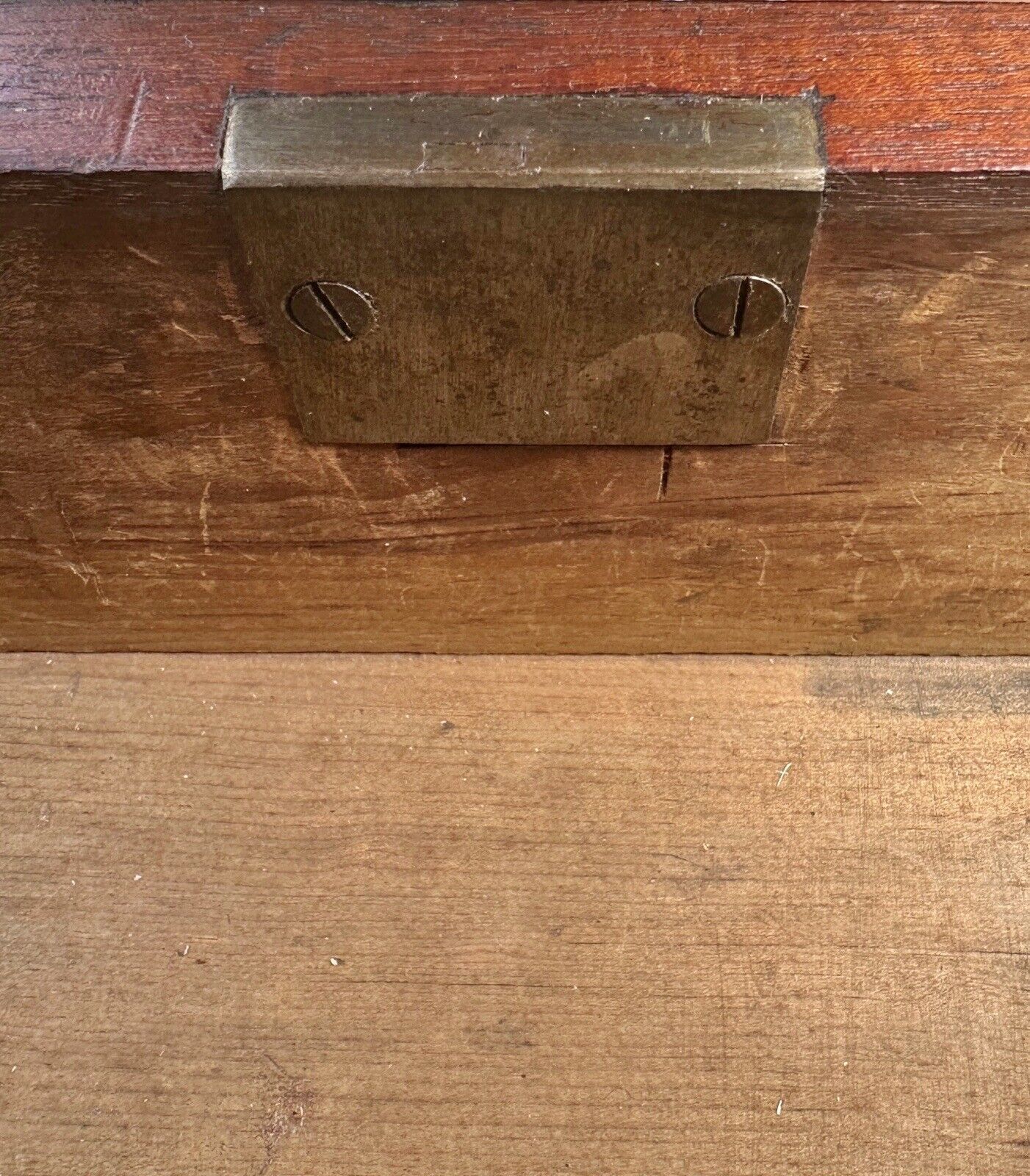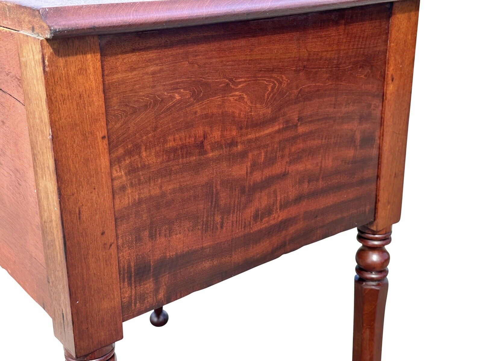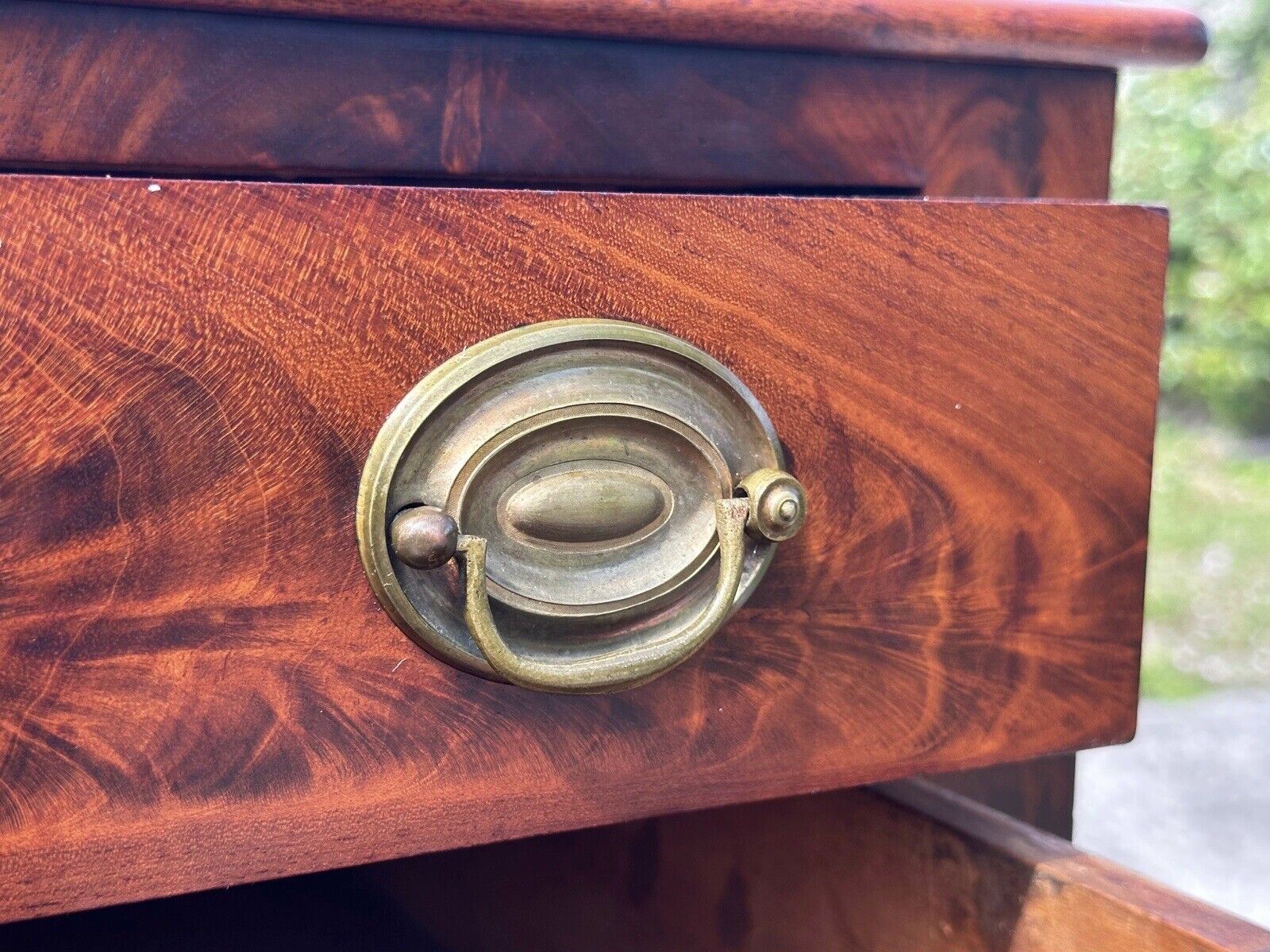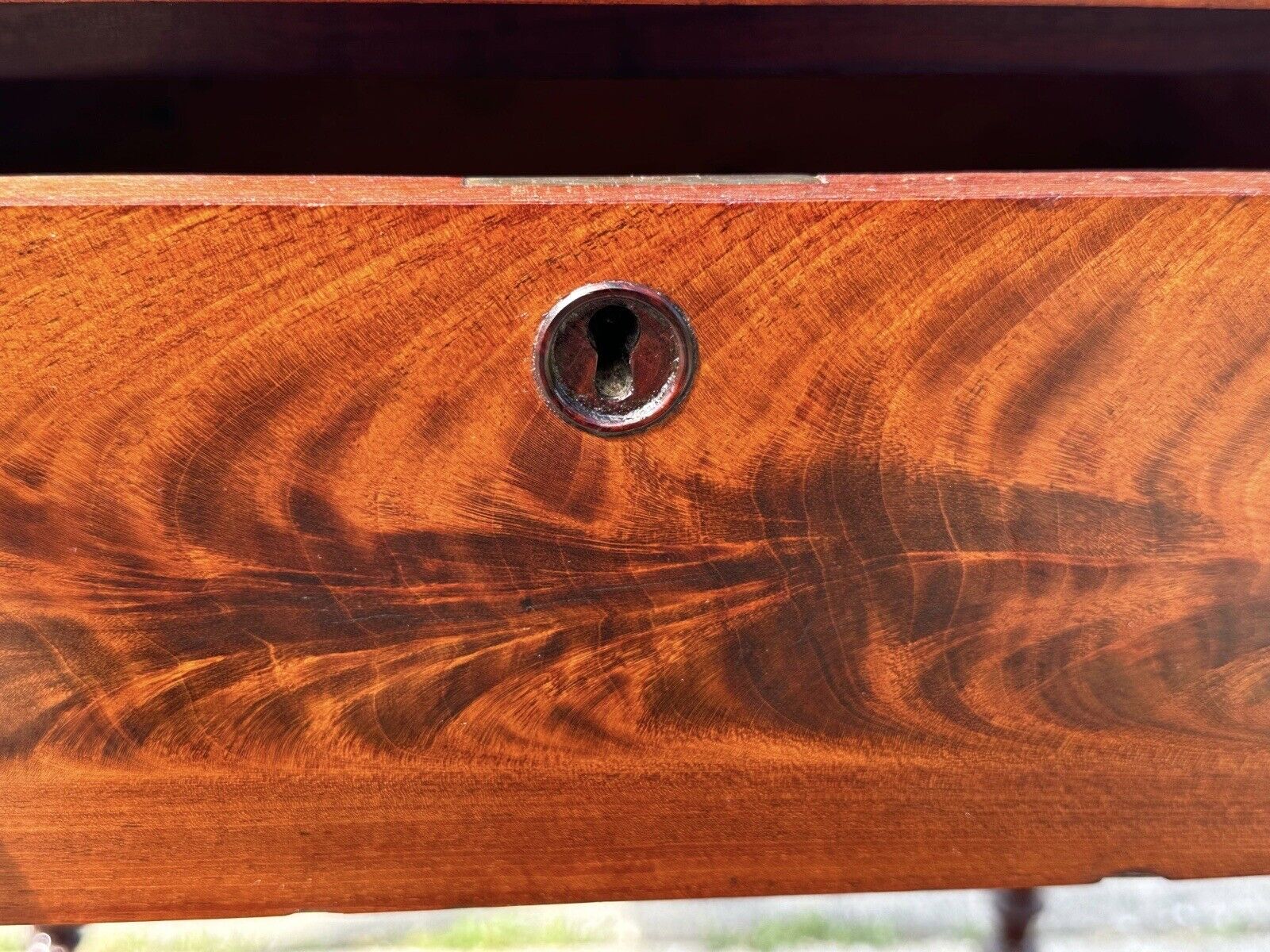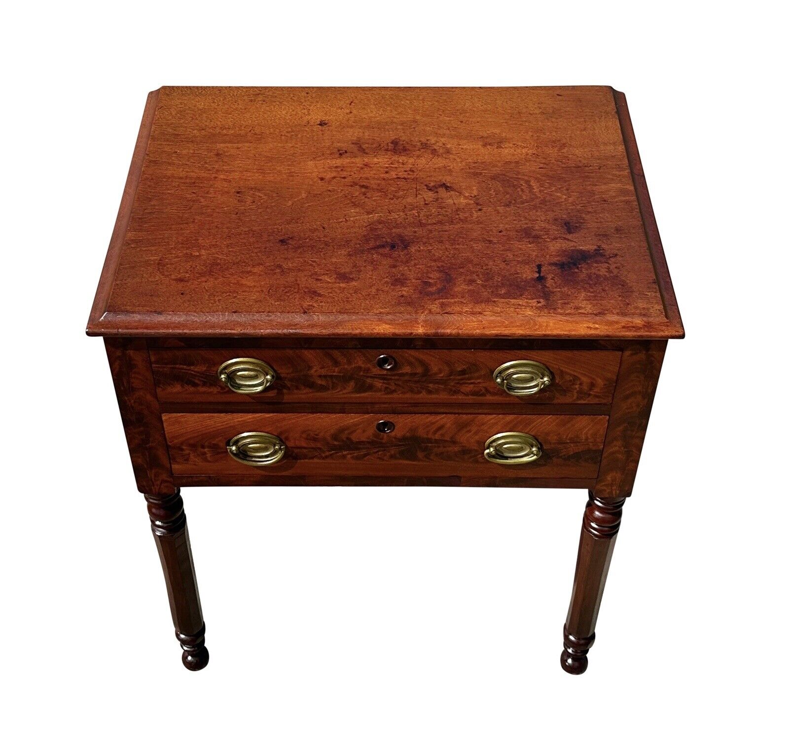 Bay Colony Antiques is proud to offer for sale this fantastic early 19th century antique New England Sheraton Mahogany worktable / nightstand. The worktable has two drawers with exceptionally beautiful crotch Mahogany veneers used for the faces and leg blocks. Oftentimes referred to as Flame Mahogany, Crotched Mahogany is rare because it can only be found where the limbs of a Mahogany tree split and form a “V” shape. The drawers were constructed with pine secondaries and have really nice embossed brass pulls and carved wood escutcheons. The original locks are still present, but this didn’t come to us with a key. The table has a Mahogany top with a thumb molded edge and the sides were also constructed with high grade Mahogany. In addition to being in excellent condition, what truly makes this a remarkable worktable is the octagonal form of the legs. We strongly believe this was made in or around Boston, but to err on the side of caution, we have this advertised as a New England stand. This is one of the prettiest stands we’ve encountered in some time, and we’re excited to offer this to our clients around the country. If condition and originality are important to you, we would recommend this stand without hesitation.