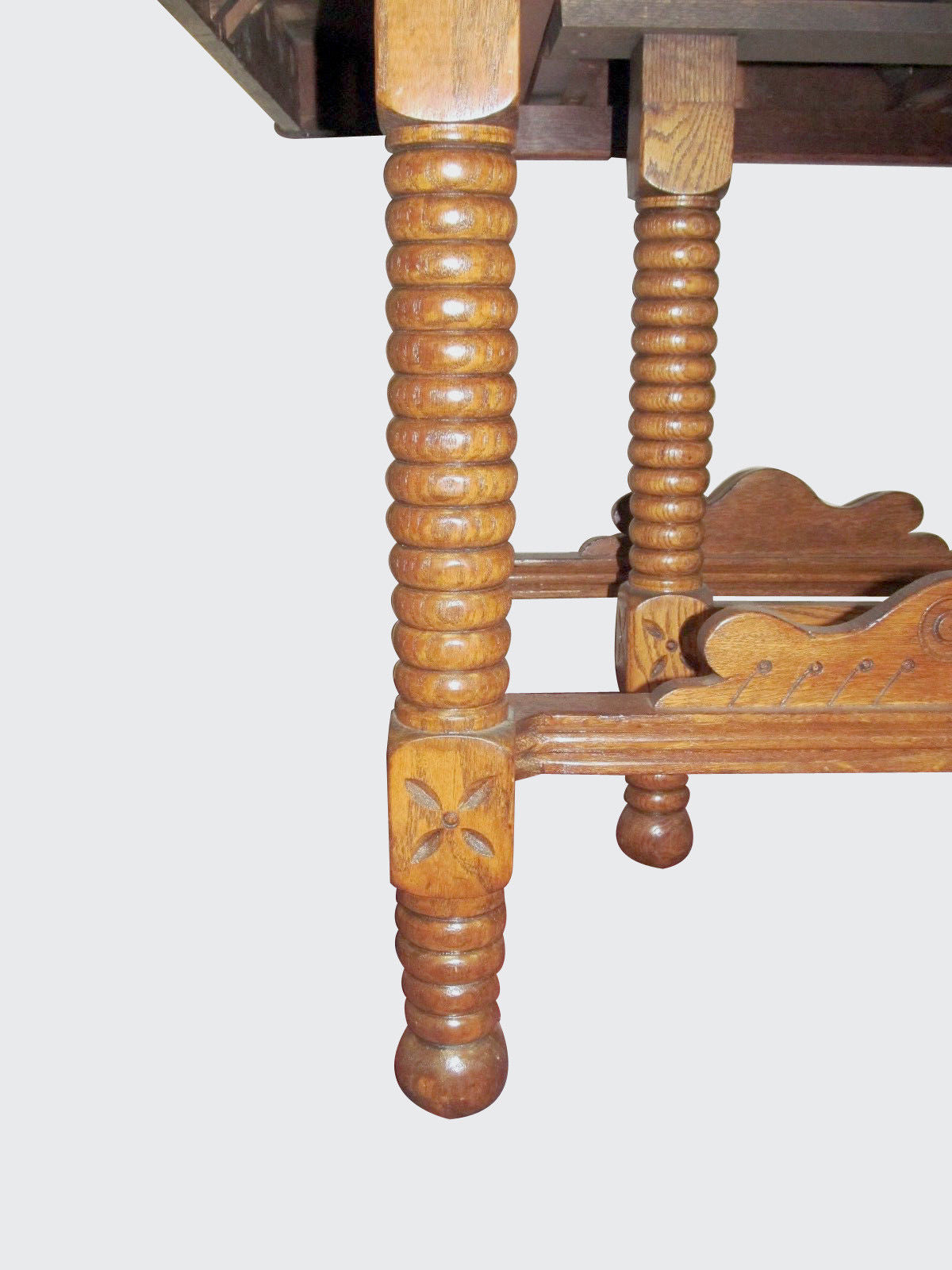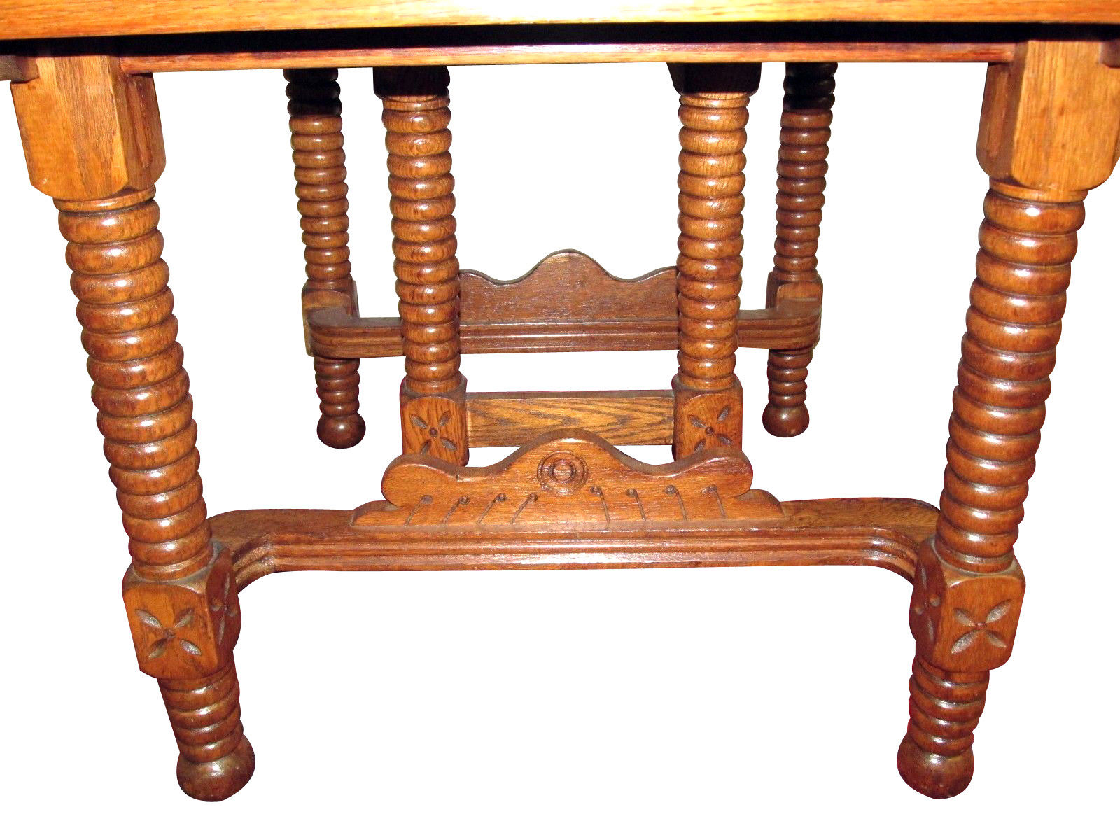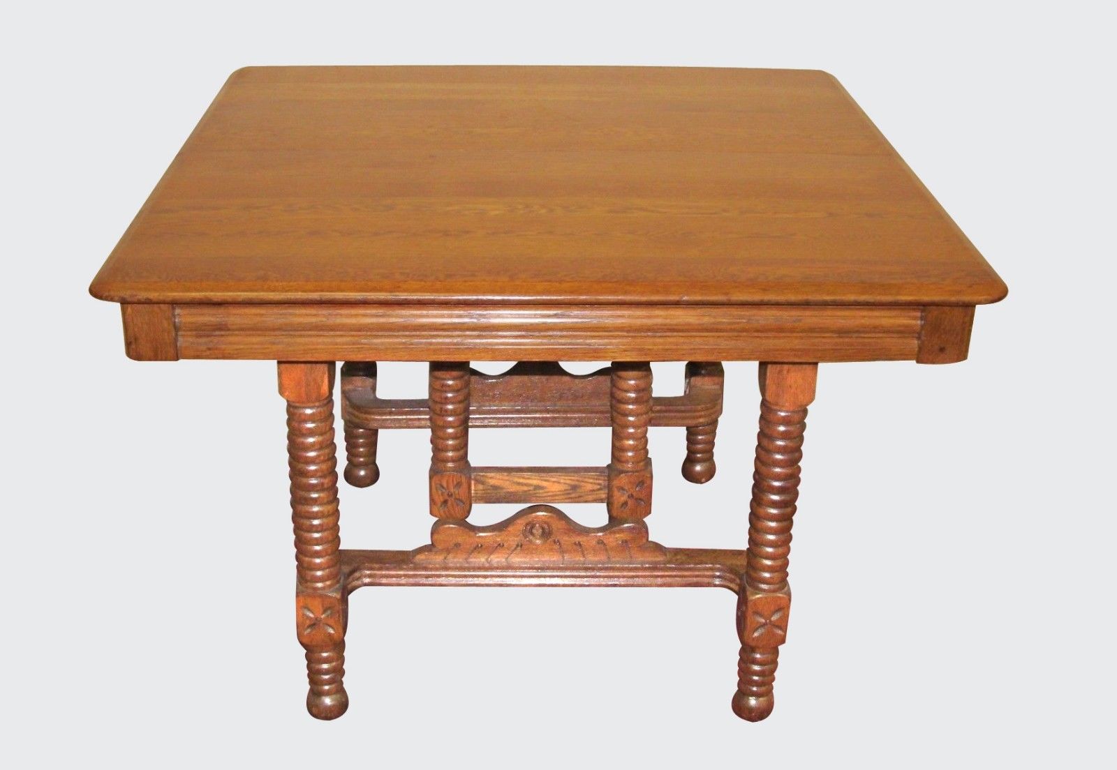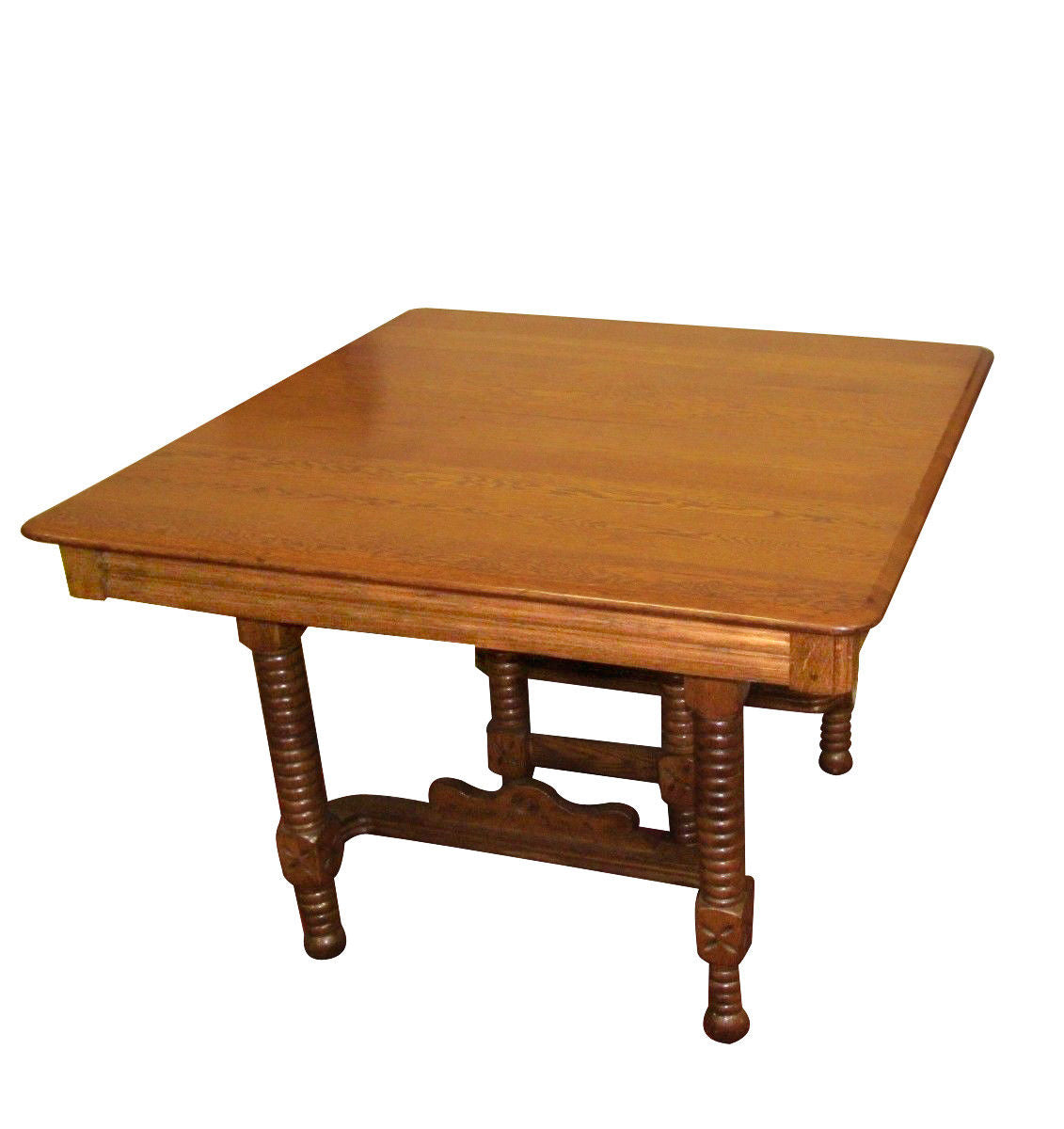 We are honored to offer you this superb late 19th Century Eastlake Victorian solid oak dining table. We just obtained this exceptionally wonderful table after it had been totally professionally restored at a cost far exceeding our sale price on it. Its extension slides work effortlessly with crisp precise action, it has 3 skirted apron leaves that come with custom made felt cozy bag that 11 3/4" leaves & received fantastic attention to original detail down to being expertly milled, excellent caster wheels that make moving this table the utmost ease. The table's base is particularly noteworthy with an inverted yoke stretcher, super spool carved legs& its original set of middle legs with twin faced carved rosette panels on each leg. We are active buyers of fine quality oak furniture and this is one of the best smaller scale tables we've handle over the last year. It measures 42" long, 42" wide, 78" with its 3 leaves installed and 30" tall.