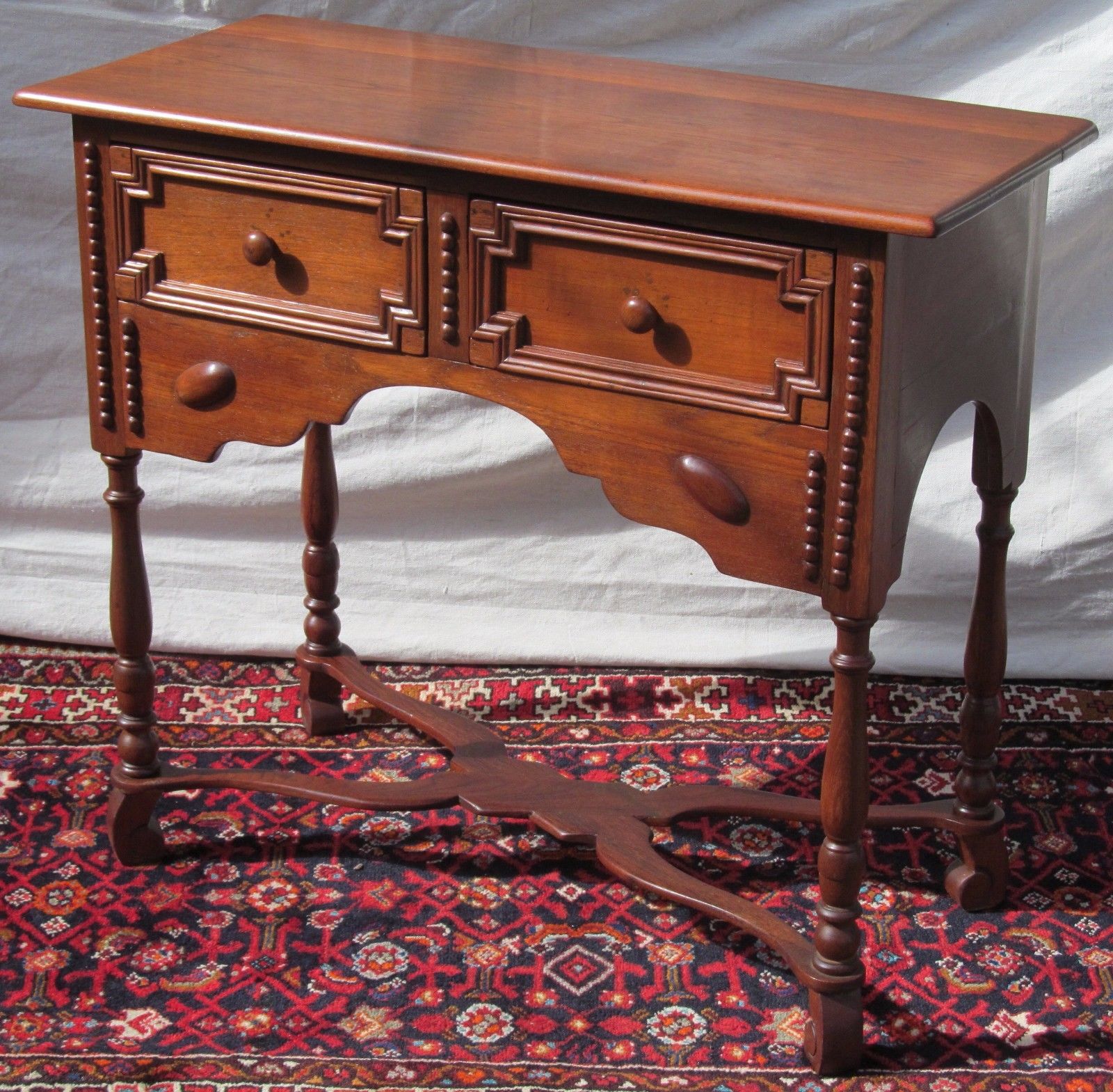 We are delighted to offer you this very rare and unusual 19th century William & Mary styled double split drawer walnut console/sofa table/server. Our staff is torn in calling this 19th century as opposed to 18th century. Some of us believe its 18th century that has been nicely refinished with polished varnish. The others believe its a Wallace Nutting type copy. So we air to caution and will call its 19th century. It possesses an ancient very well oxidized secondary panels and the top's bottom side, applied carved turtle back bosses (cabochons), sausage & bead carved moldings along with framed drawer faces. The legs are nicely turned terminating in Flemish carved feet all joined by a wonderful figured base X stretcher with a flat profile. Its body has big cut sides and a graceful arch in the front of its case. It is 36" long, 16" wide and 31 1/2" tall. Perfectly sized for a large variety of accent uses.