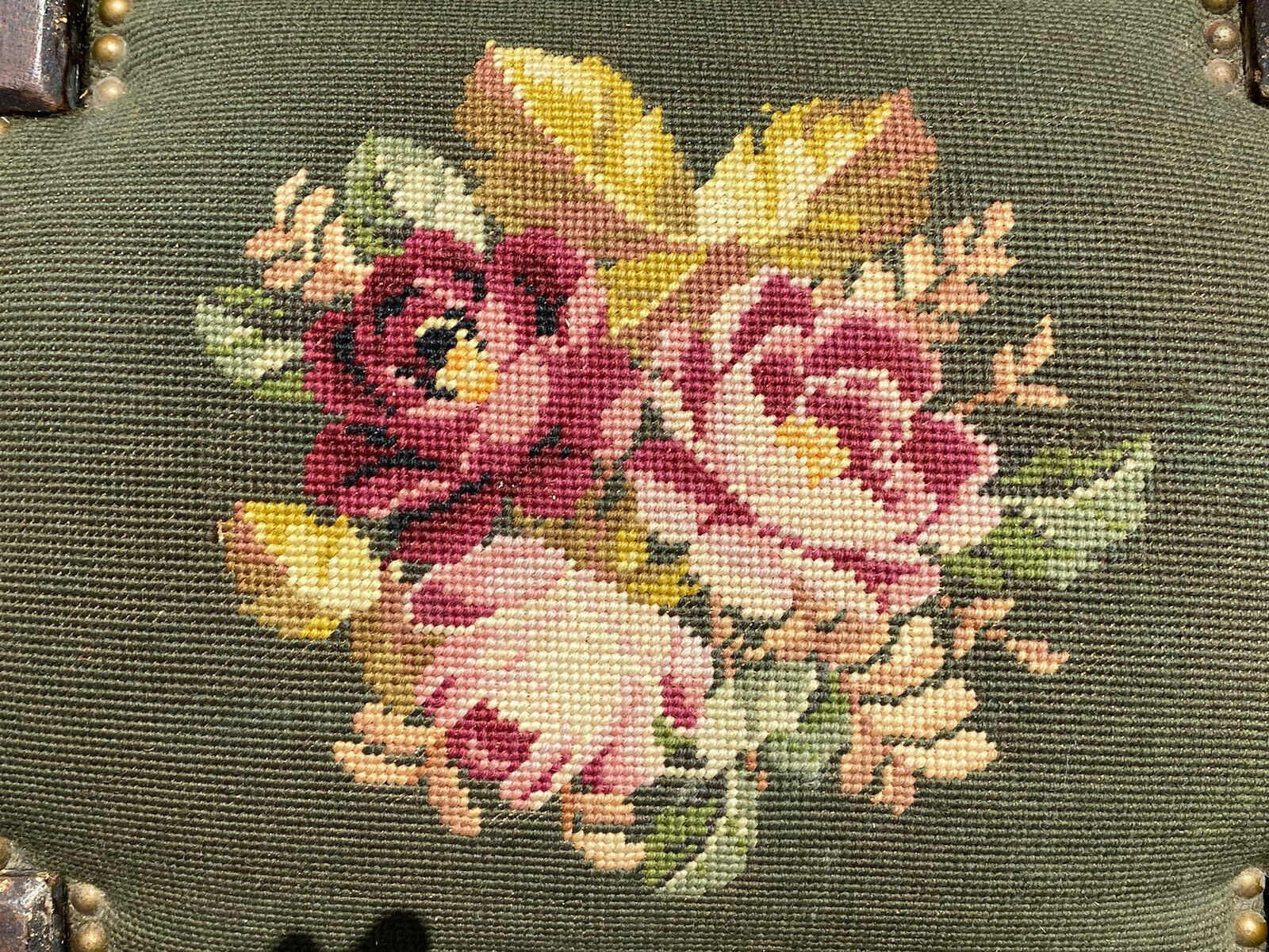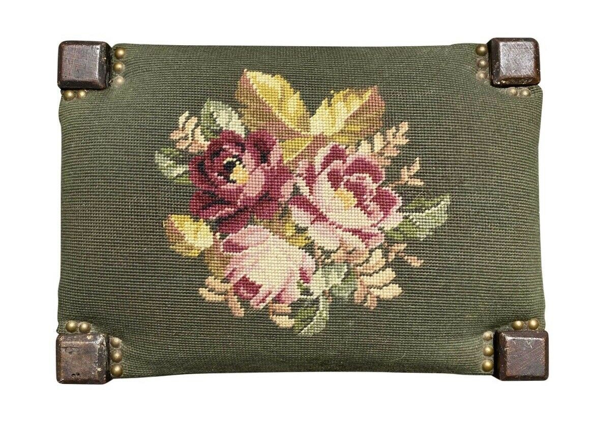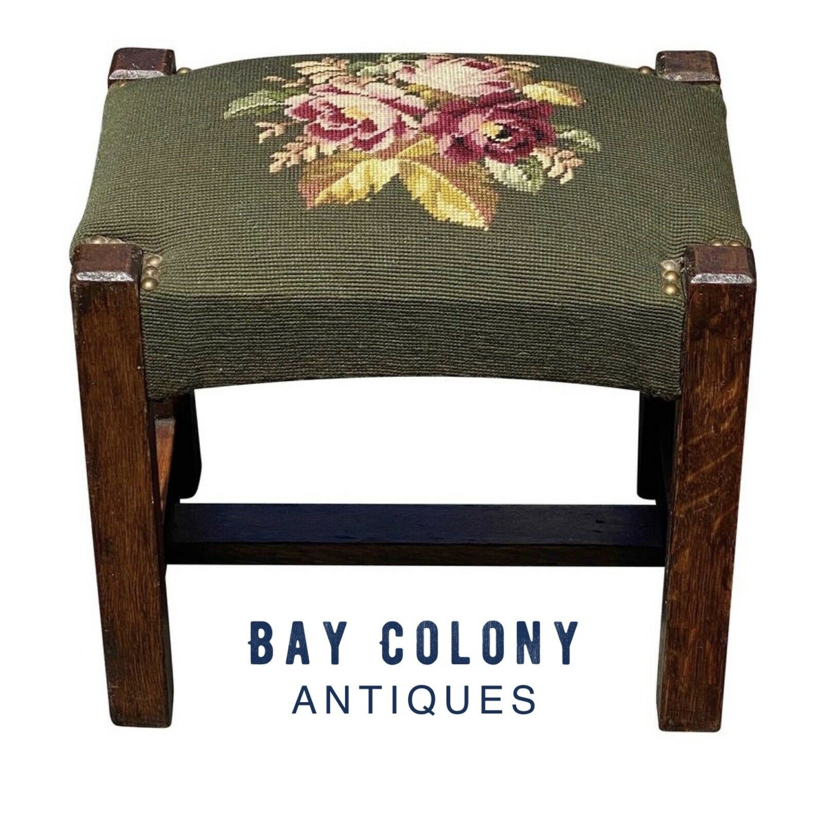 Bay Colony Antiques is proud to offer for sale this fantastic early 20th century antique Arts & Crafts / Mission Oak footstool. The footstool has a green needlepoint seat with a multi colored floral design and brass tacks around the edges. The seat box has a nice subtle curve and the stool is in excellent condition. We couldn't locate a makers mark but have seen a few near identical examples signed Stickley Bros. The stool measures 16 3/4” wide x 12” deep x 16” tall.
