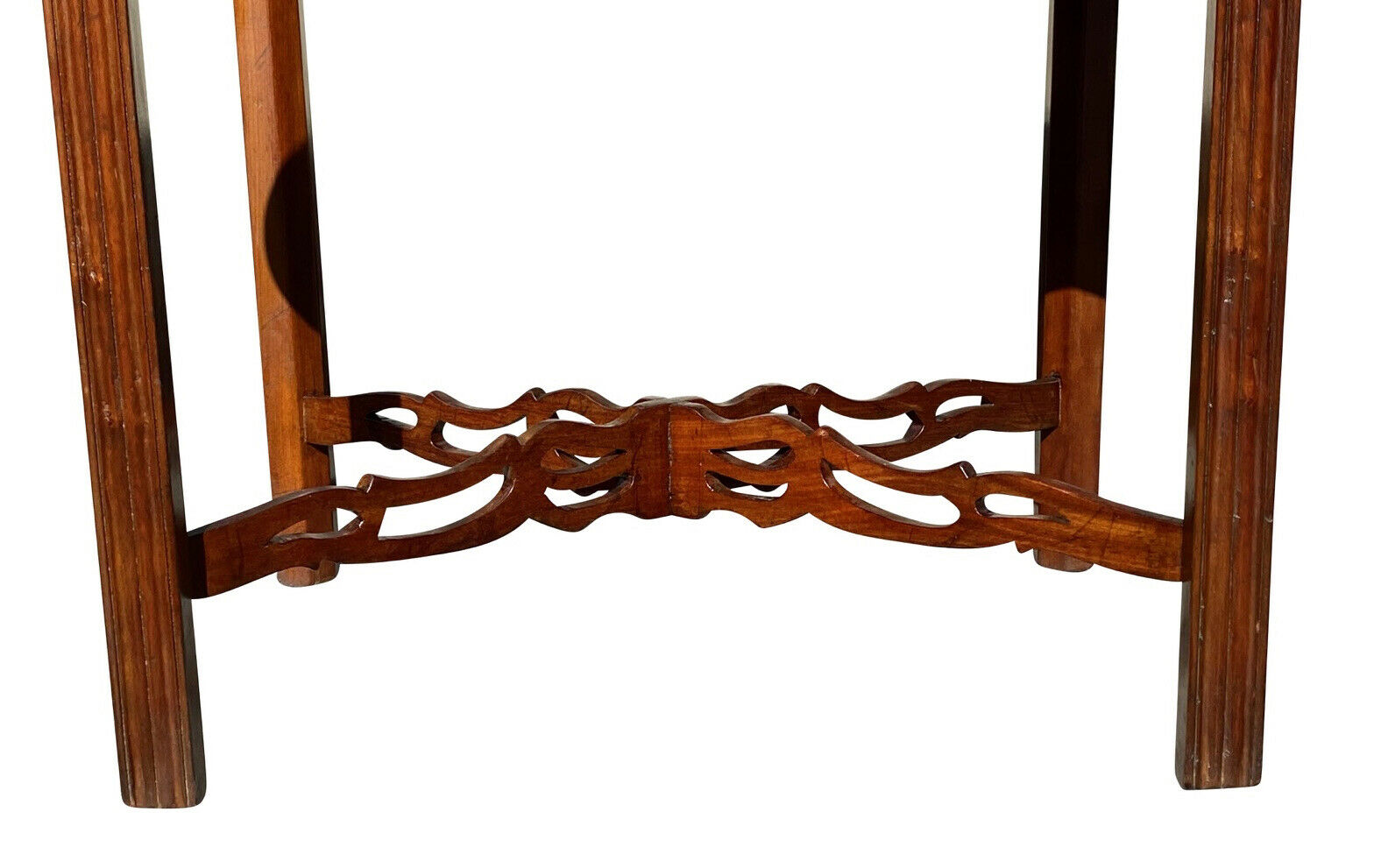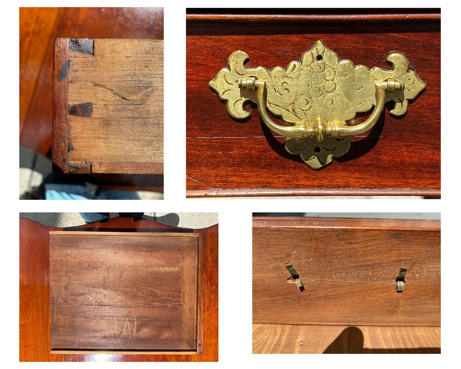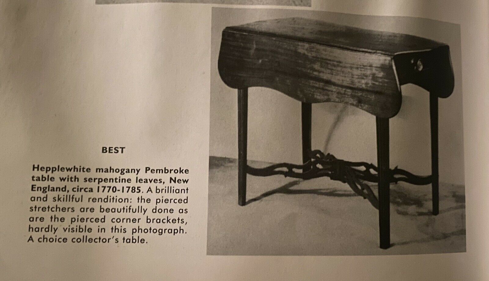 Bay Colony Antiques is delighted to offer for sale this fantastic early 20th century Chippendale antique style mahogany Pembroke table. We purchased this from a lovely couple who we sold a period example to and they were gracious enough to allow us to purchase their long loved table now that they have the period twin. The family was originally from Swampscott Massachusetts and told us they purchased this & another table from Israel Sack. We whole heartedly believed this was a period table and refused to believe otherwise until we got our hands on it and checked out the construction. This table was made in the early 20th century to the exact proportions and standards of the finest 18th century cabinet shops and was probably made around Boston based on how good the table is and how early in the 20th century it was made. The Sack family was instrumental to building the antique industry into what it is today and their publications are still the gold standard. We have multiple copies of their literature and our father knew the Sacks and we will attach a photo from Albert Sack’s “Fine Points of Furniture” showing a near identical Pembroke table as a best example. Israel Sack was an outstanding buying agent and truly understood and cared for every nuance of fine American furniture. The table has a serpentine top with drop leaves and has a large single drawer with an etched brass pull. The table has a complex pierced stretcher and finely formed molded Marlboro legs. The table measures 20 1/2" wide x 29" long x 29" tall. When the leaves are locked up the table measures 38 1/2" wide x 29" long.