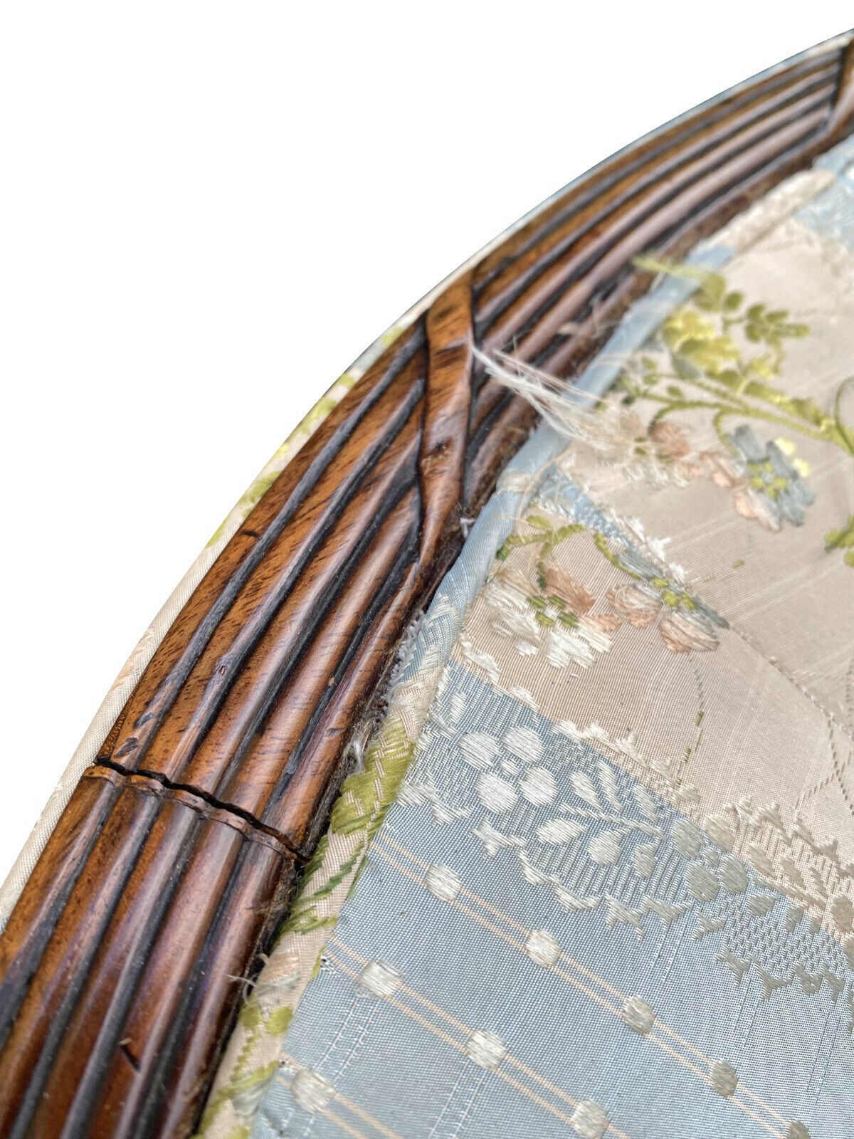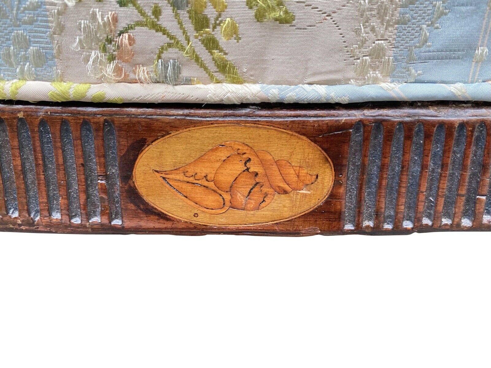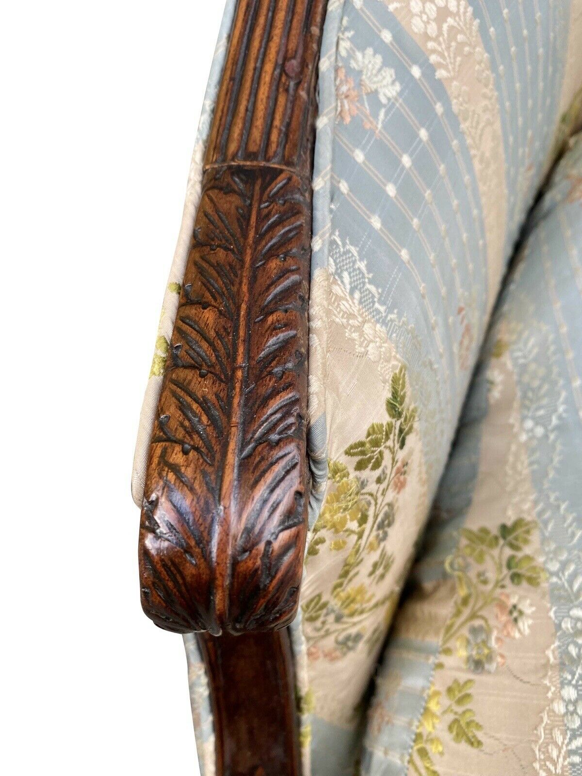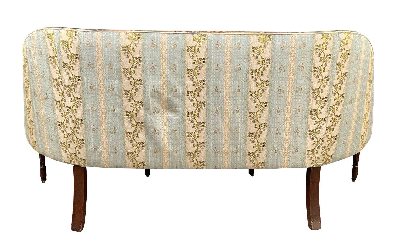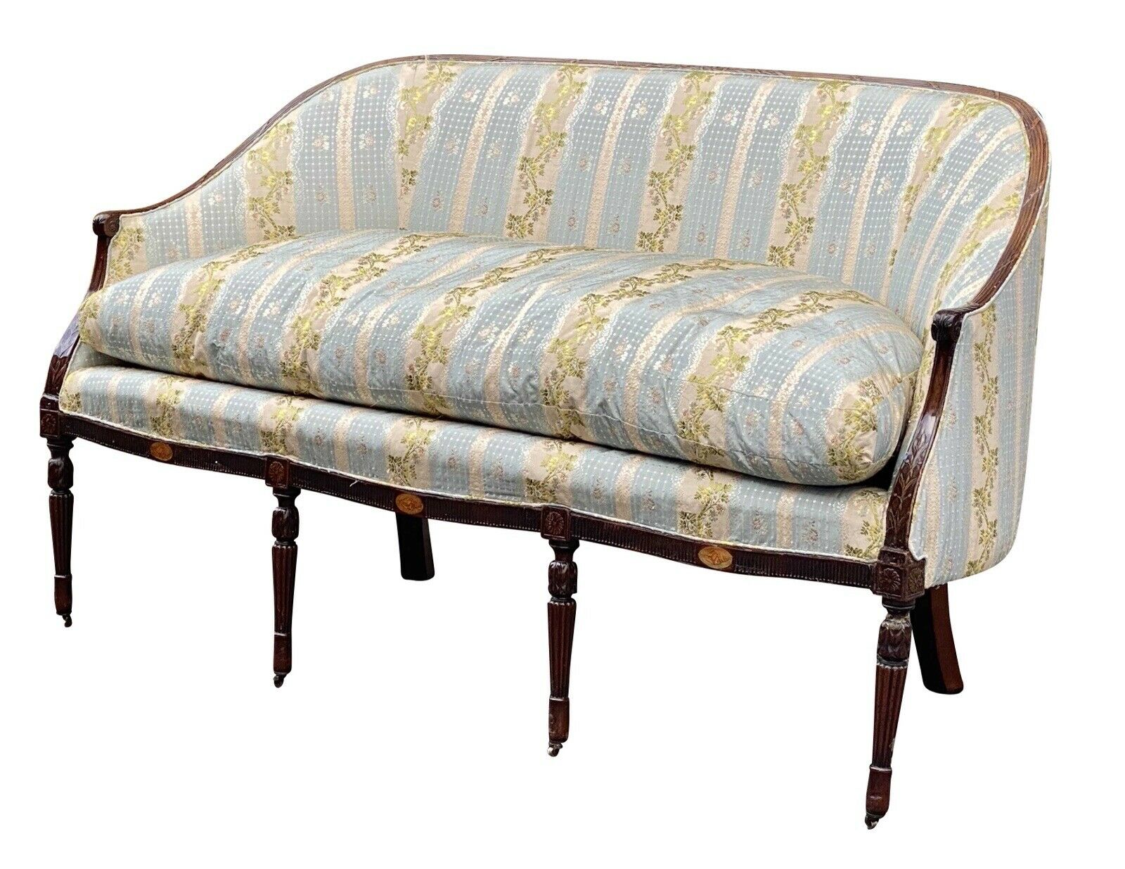 Bay Colony Antiques is delighted to offer for sale this fantastic early 20th century Sheraton antique style mahogany sofa. We really don’t handle many sofas because of how much warehousing space they require but there was no way we were leaving this in the estate. This is a superior formed sofa with a curved crest rail that is reed carved with a carved ribbon running up the frame. The sofa has acanthus carved arms with carved bellflowers on the arm panels and carved pinwheels at the corner blocks. The seat rail has fluted carvings with 3 inlaid conch shells on the front edge. The silk damask upholstery is in great condition and is of superior quality. The silk is mainly blue with white stripes and green accents with light dashes of pink in the flowers. The damask on the silk can be best seen in photo #5. There are a few white specks visible in the photos and these are just tiny pieces of Styrofoam that we use to ship things that fell onto the sofa. We've carefully looked over the upholstery with our only condition notes being a slight depression in the back where the silk has stretched a little. This would comfortably fit 3 but could probably seat up to 4. The sofa measures 66" wide x 26" deep x 36 3/4" tall. The seat has a down filled cushion, and the seat alone measures 60" wide x 23" deep with a seat height of 19 1/2" tall. Due to the delicate nature of the legs two of them have old repairs but the restorations were done properly and the sofa is still nice & stable.