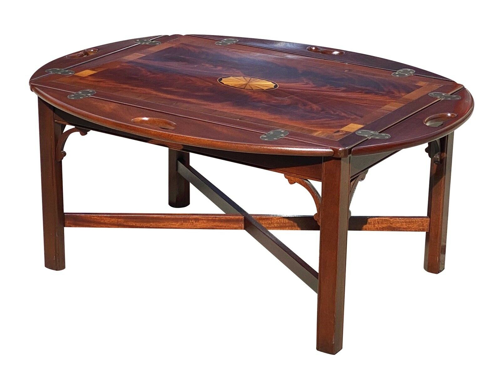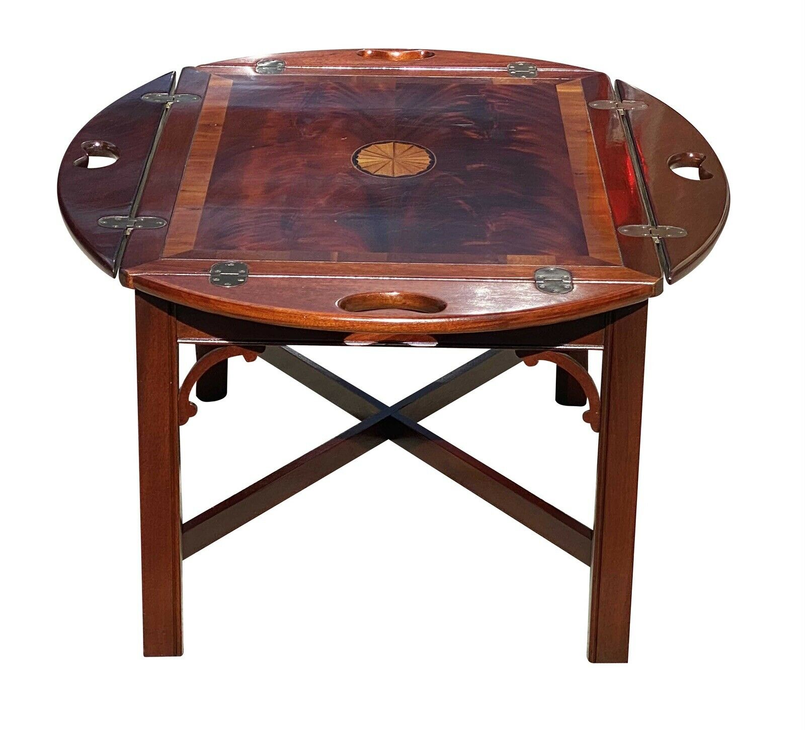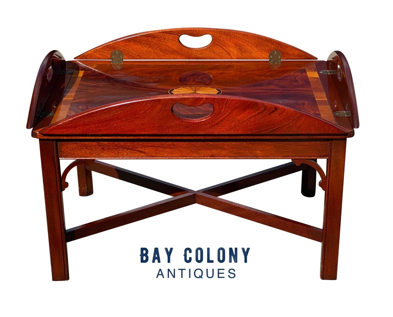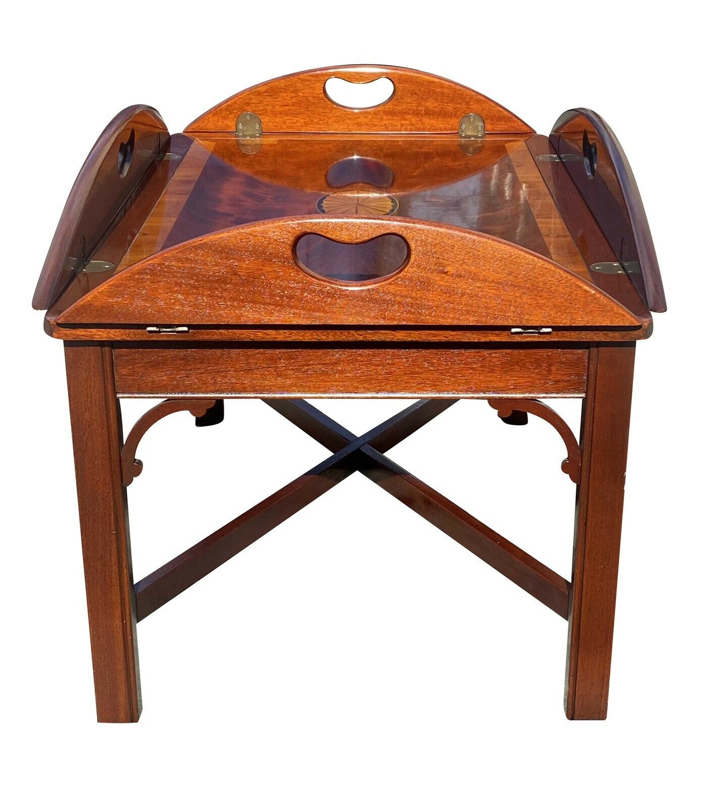 Bay Colony Antiques is pleased to offer for sale this fantastic 20th century Chippendale antique style Mahogany butlers table. The table has a beautiful crotch Mahogany top with a paterae inlay at the center and a cross banded inlay around the edge. The table was made by Hekman Furniture of North Carolina and has a high gloss finish similar to a French polish. The table has molded Marlboro legs and an x shaped cross stretcher for added stability. The table is in wonderful condition with our only notes being minimal surface wear and light scratching to the top. With high gloss finishes like this we usually ask our restorer to apply a fresh overcoat to refresh the surface for the next owner. The table measures 33 1/2” wide x 23 1/2” deep x 22” tall with the ends up. When the ends are folded down the table measures 40 1/2” wide x 31” deep x 18 1/4” tall.