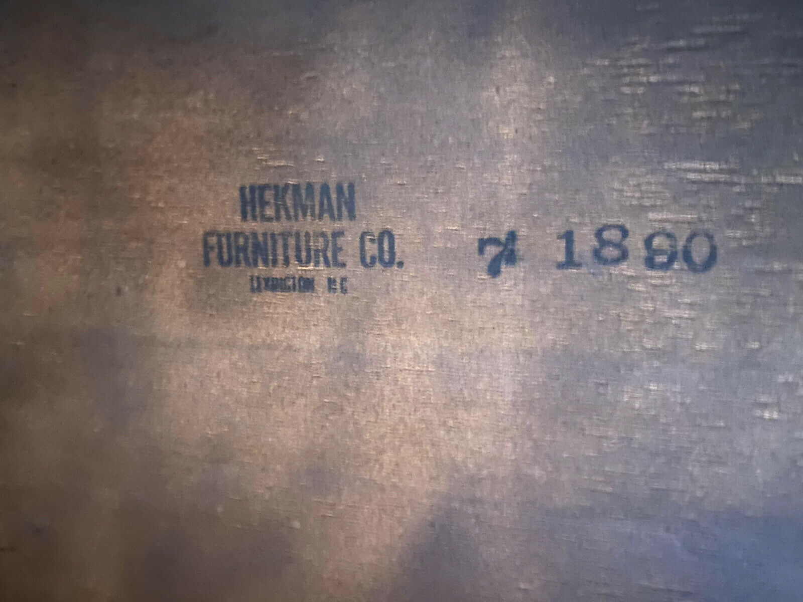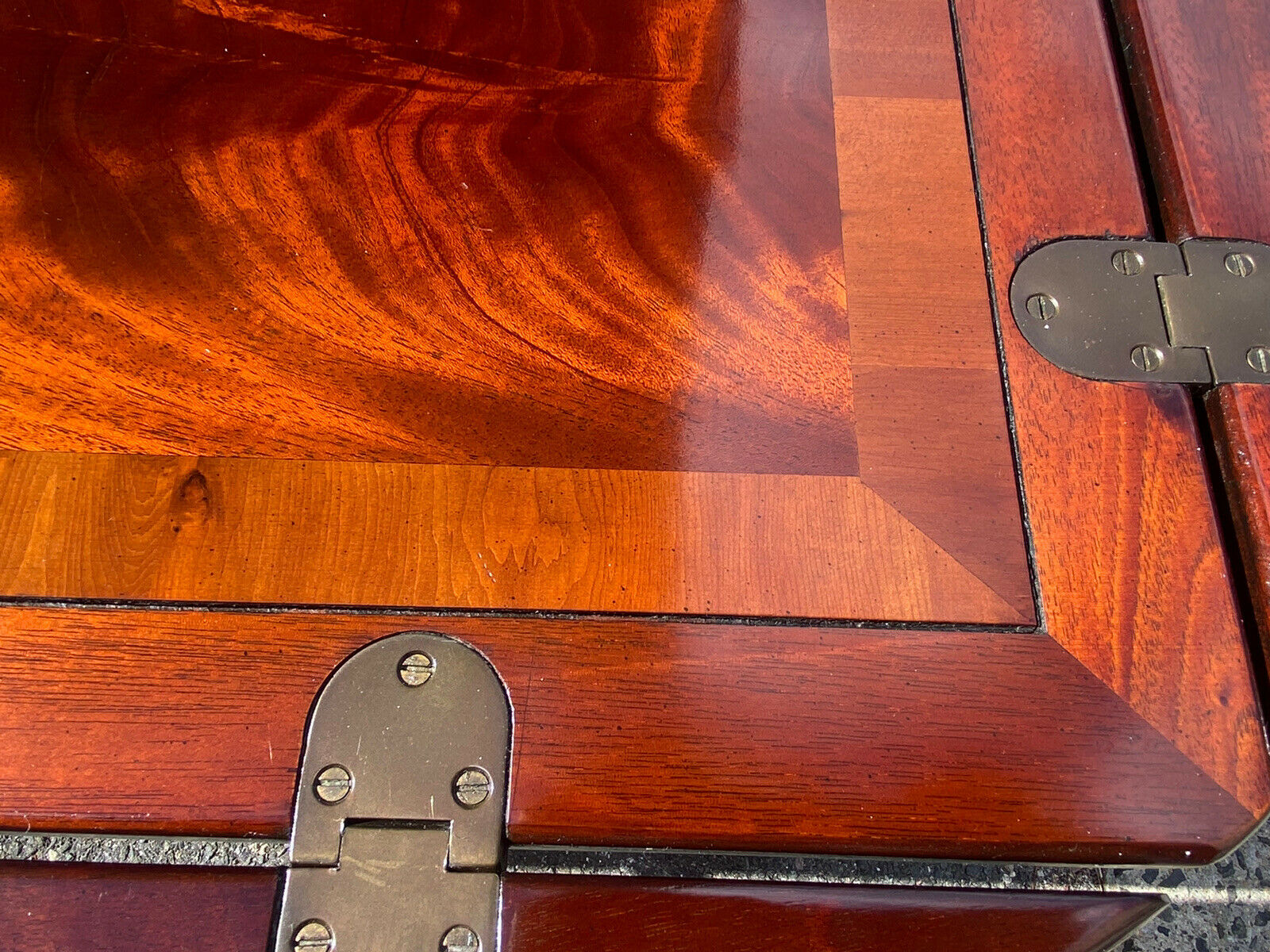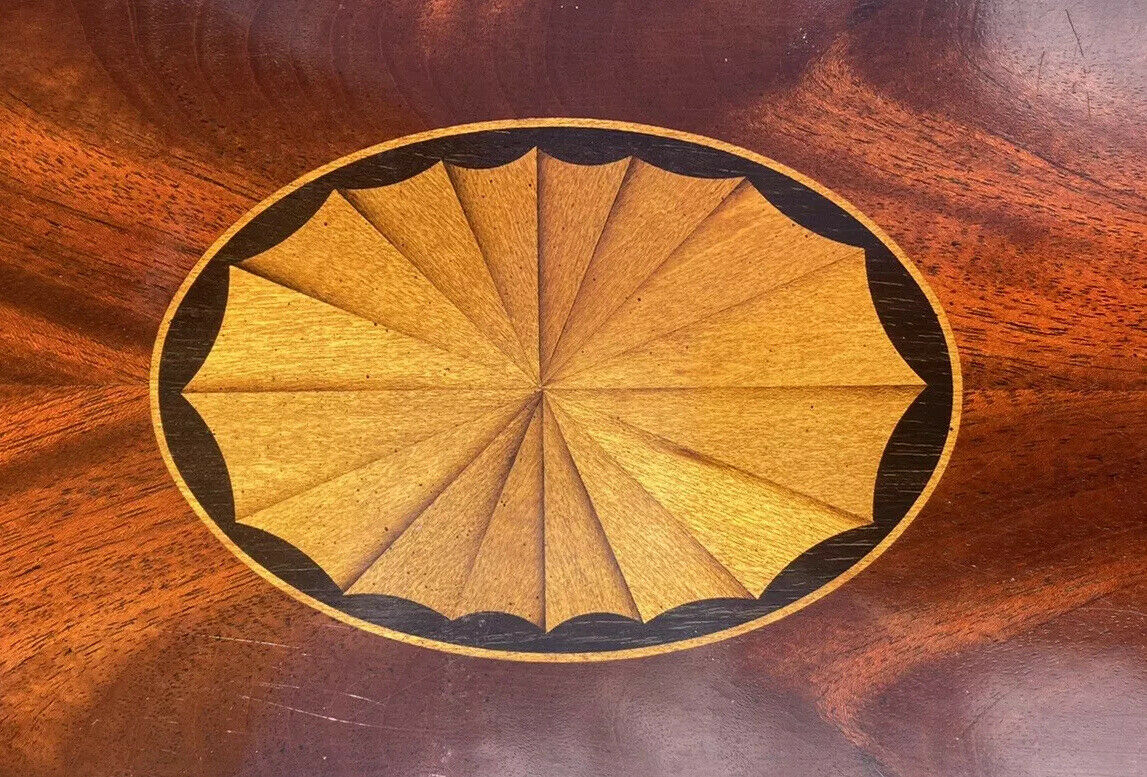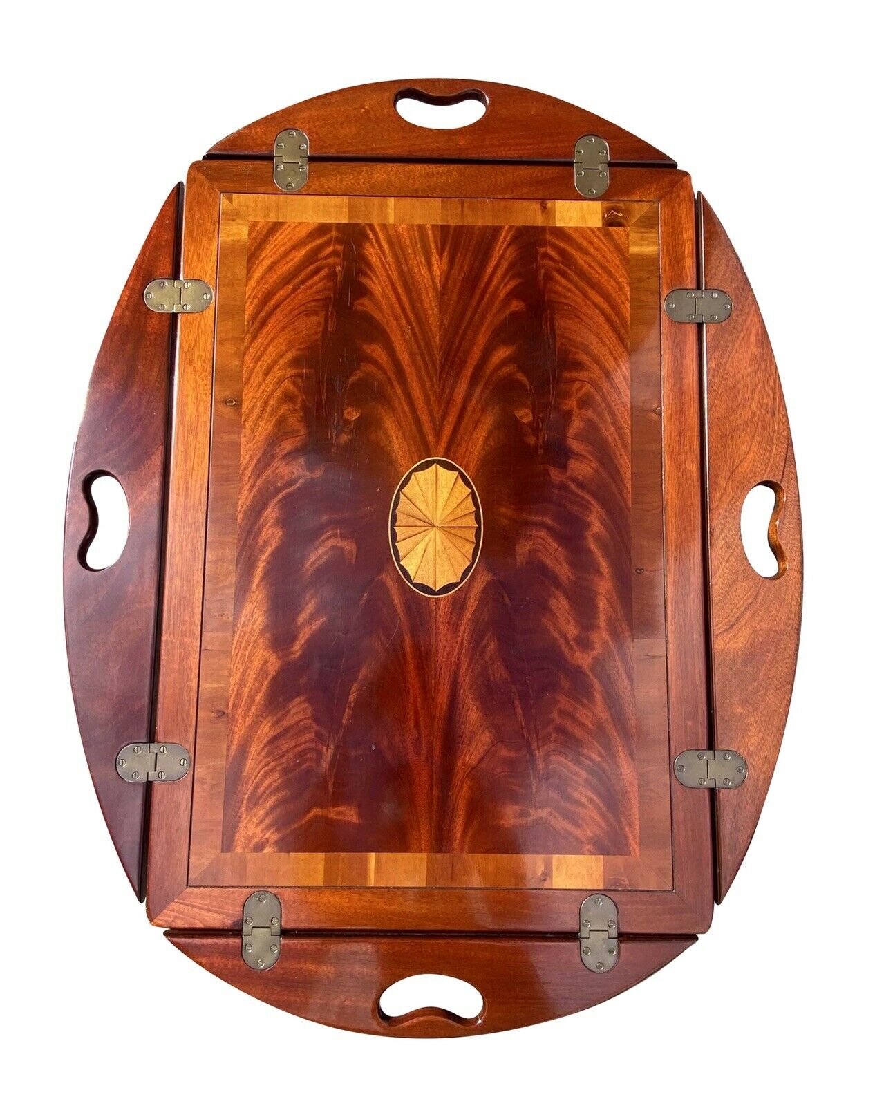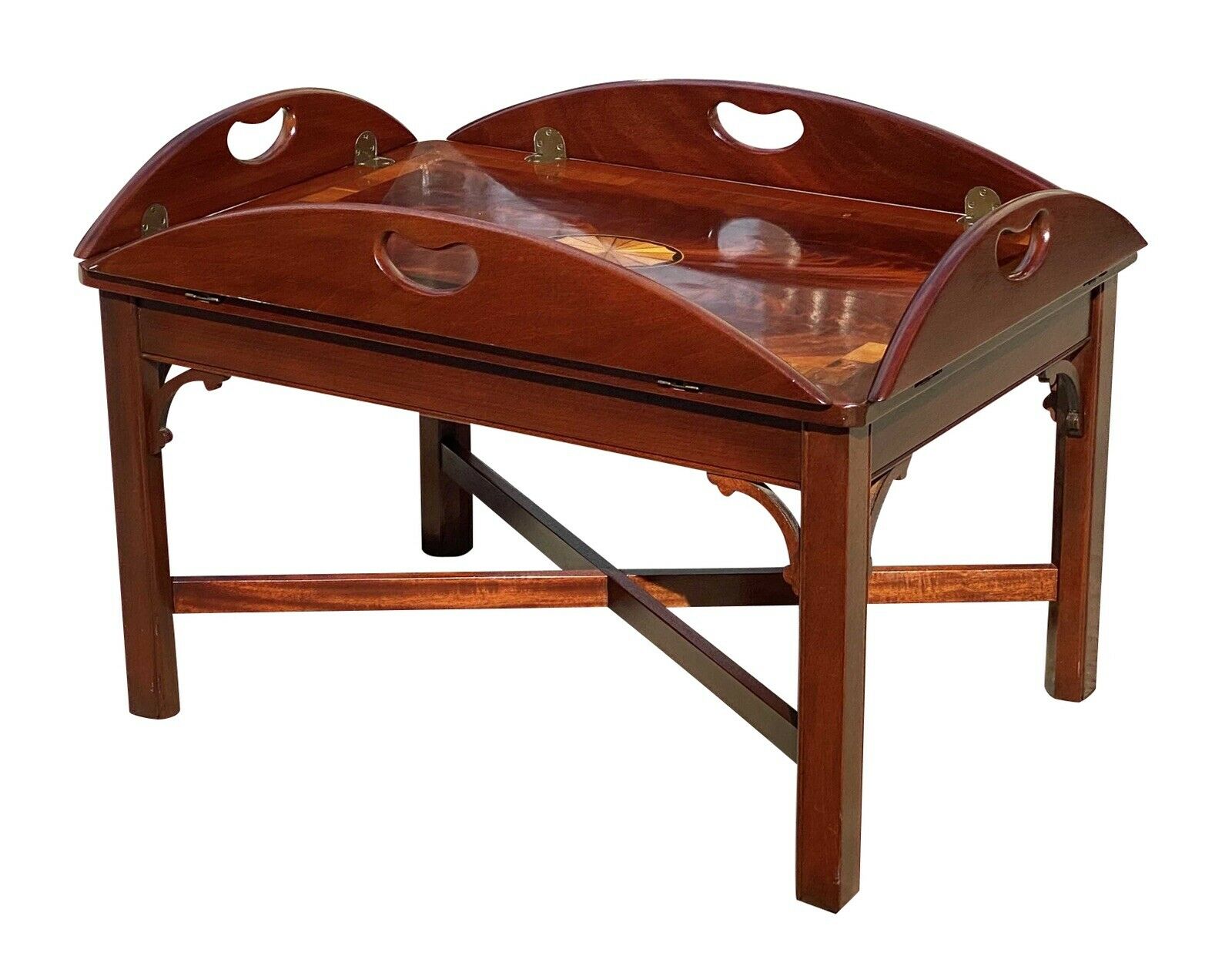 Bay Colony Antiques is pleased to offer for sale this fantastic 20th century Chippendale antique style Mahogany butlers table. The table has a beautiful crotch Mahogany top with a paterae inlay at the center and a cross banded inlay around the edge. The table was made by Hekman Furniture of North Carolina and has a high gloss finish similar to a French polish. The table has molded Marlboro legs and an x shaped cross stretcher for added stability. The table is in wonderful condition with our only notes being minimal surface wear and light scratching to the top. With high gloss finishes like this we usually ask our restorer to apply a fresh overcoat to refresh the surface for the next owner. The table measures 33 1/2” wide x 23 1/2” deep x 22” tall with the ends up. When the ends are folded down the table measures 40 1/2” wide x 31” deep x 18 1/4” tall.