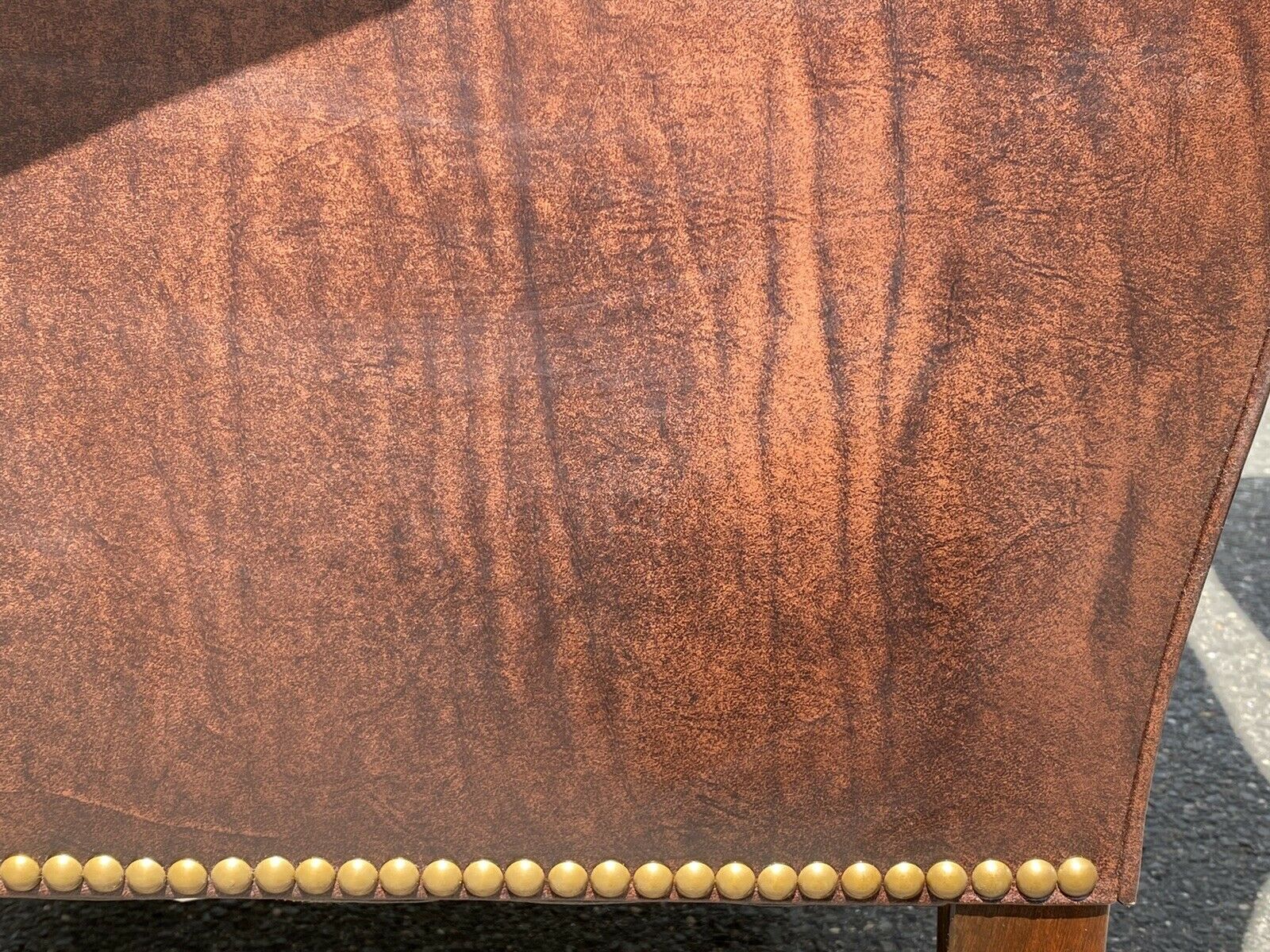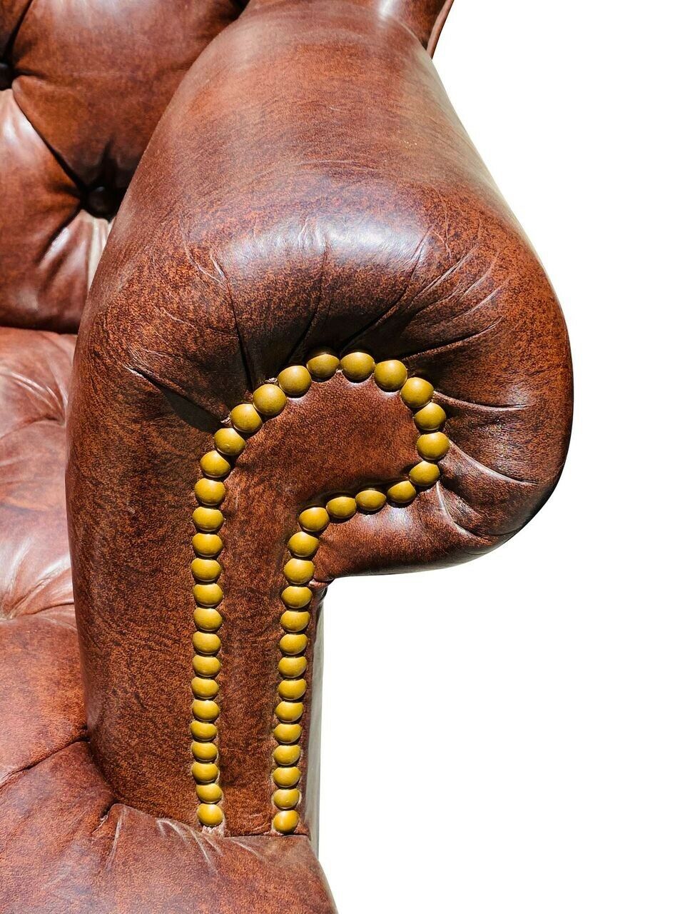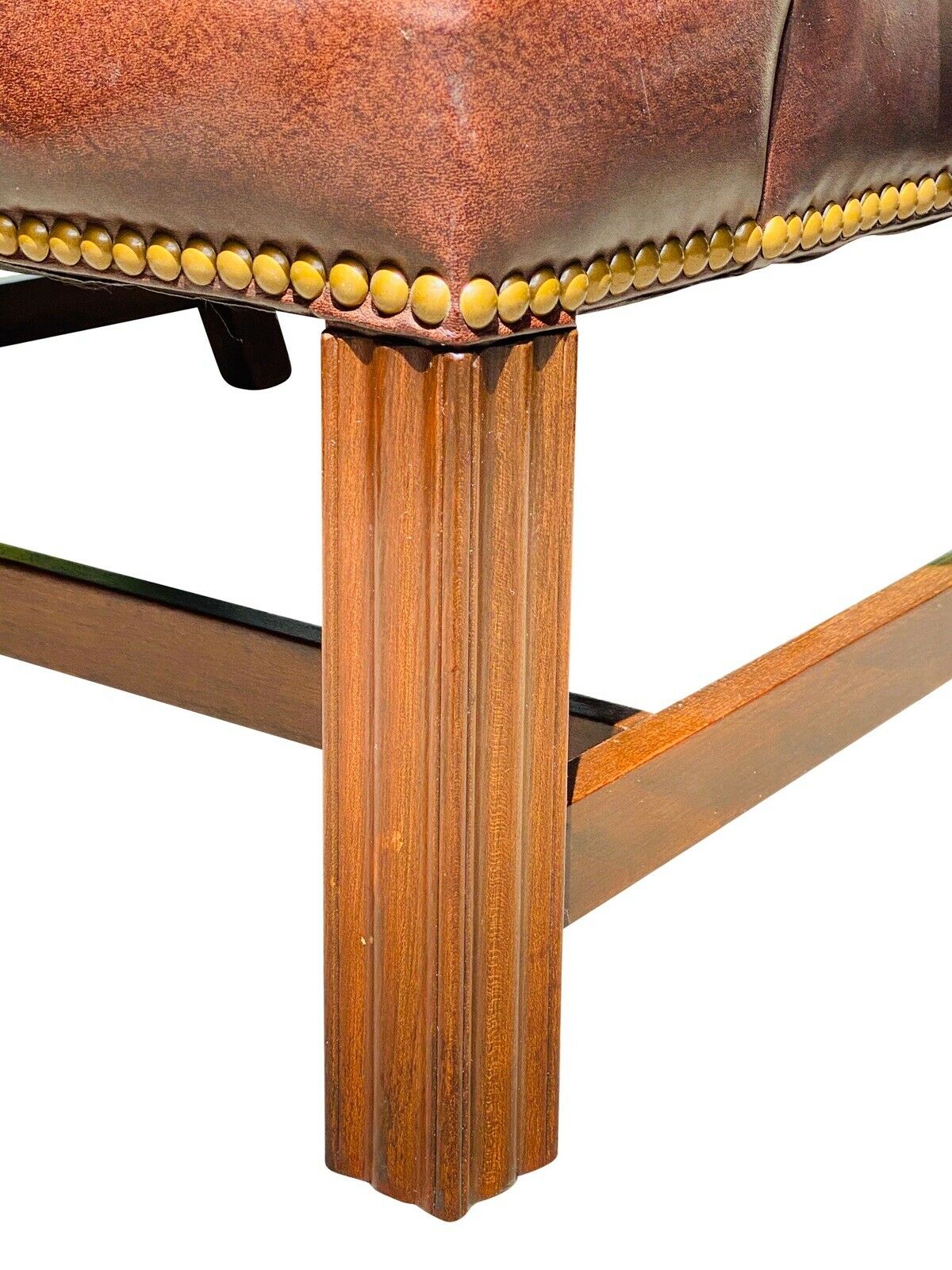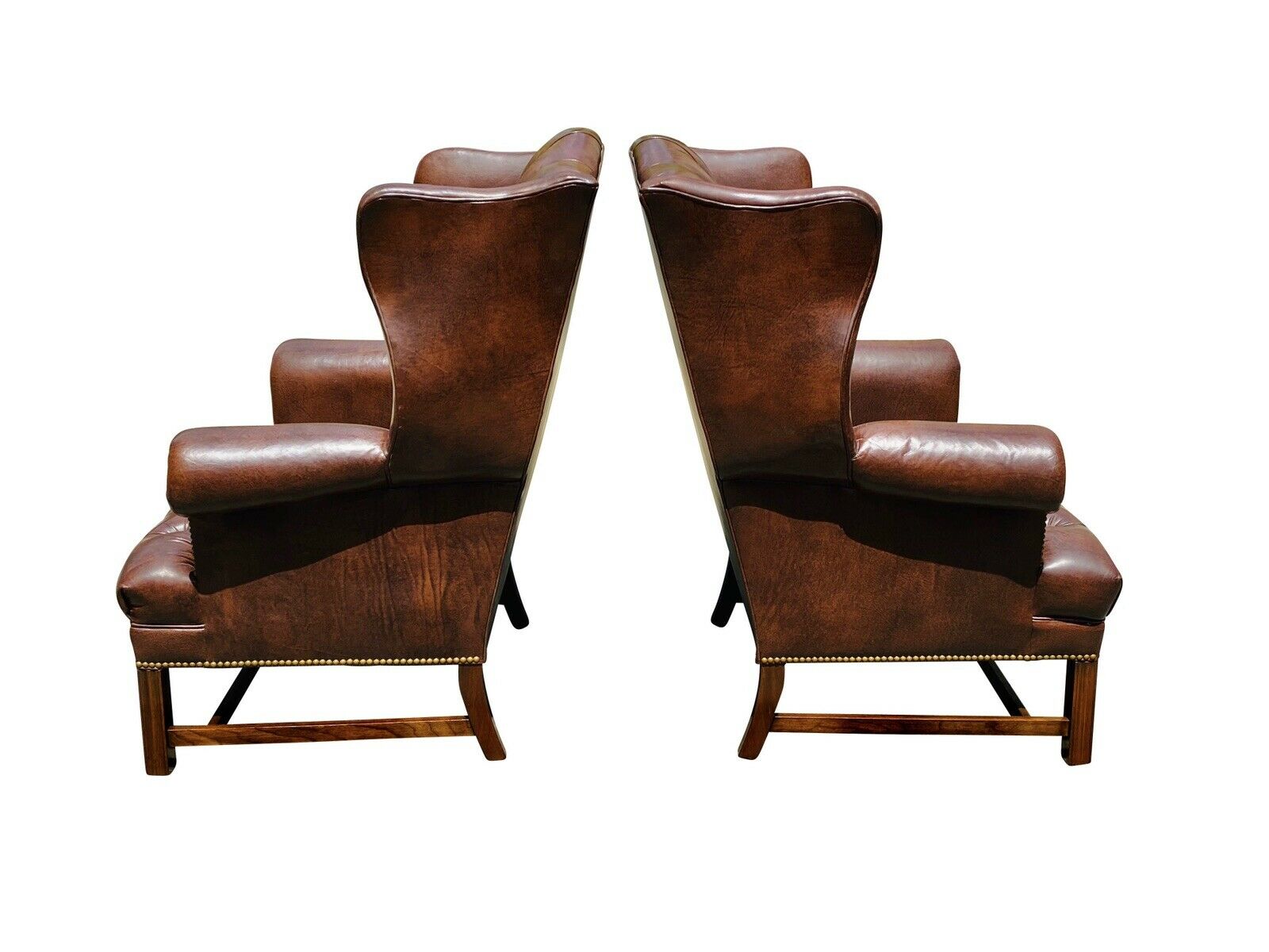 With our highest compliments we're proud to offer for sale this wonderful pair of Chippendale antique style leather wing chairs. These are large comfortable chairs with really nice and sophisticated formed backs and are in exceptional condition. The natural beauty and markings of the hide can be seen under the warm oxblood red color. The chairs have large rolled arms for optimal comfort and are nicely tufted & decorated with brass tacks. The chairs measure 35" wide arm to arm x 30" deep x 45" tall with a seat height of 18".