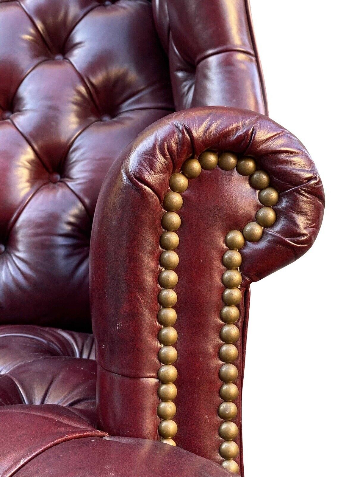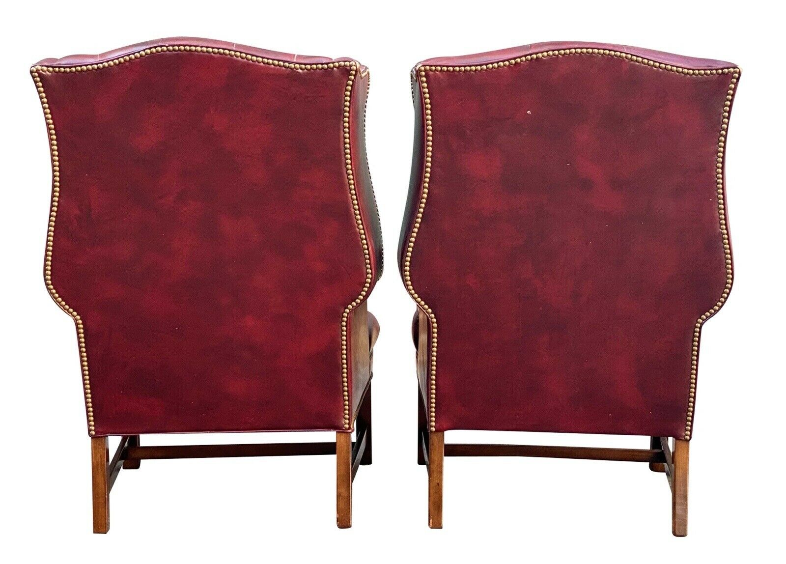 20th C Chippendale Antique Style Pair Of Tufted Red Leather Wing Back Arm Chairs