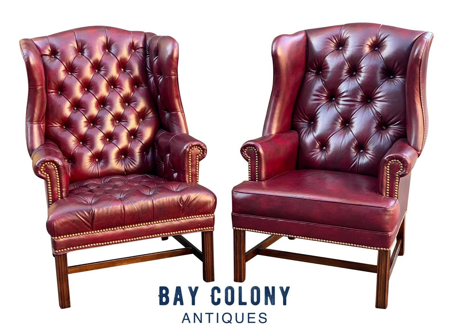 Bay Colony Antiques is proud to offer for sale this fantastic pair of Chippendale antique style his & hers tufted red leather arm chairs. Chippendale wing back chairs are extremely desirable and this pair by Schafer Brothers of High Point NC are of the utmost quality. Schafer Bros was founded around 1940 and these chairs are dated August 2nd, 1984, on the label. The chairs have molded Marlboro legs and the arms and seat rail are accented with decorative brass tacks. The chairs are very comfortable and are in great condition with our only notes being very minor wear on the lower front panel of the gentleman’s chair and a very small hole on the back of the lady's chair that we have a standalone picture of. We’ve been bothered by not having a pair of leather armchairs, but they’ve been harder to find the last couple of years because people have been spending more time at home and there are fewer being imported which drove the demand for vintage leather chairs up. These chairs have a very nice red leather that has a wide array of tones present that can be best seen in our photos of the larger panels on the sides & back. The chairs measure 30” wide x 35” deep x 44” tall. Both chairs' seats are 20” wide between the arms x 20” deep with a seat height of 18”.