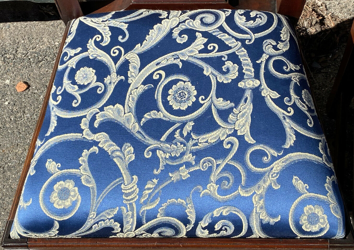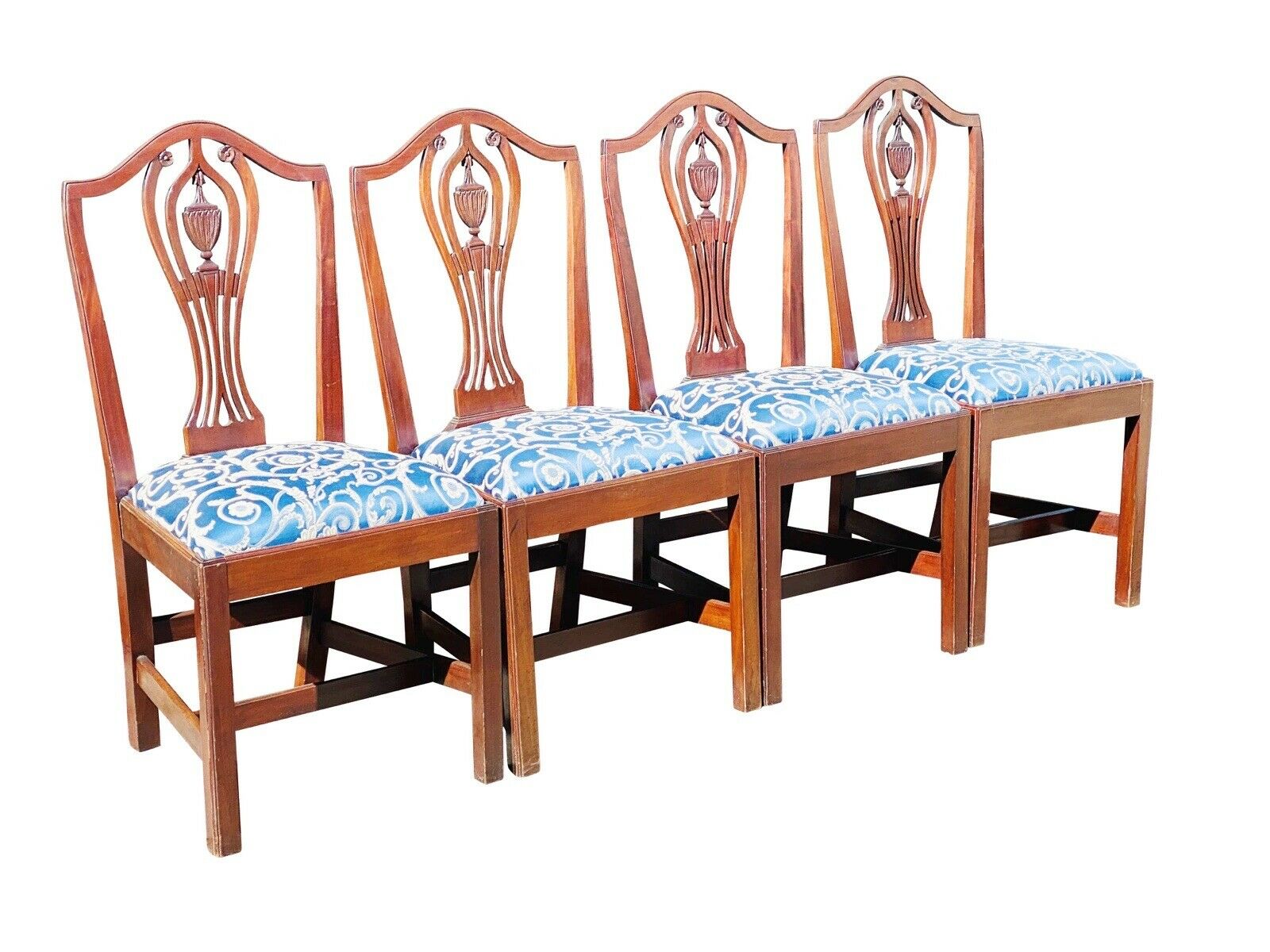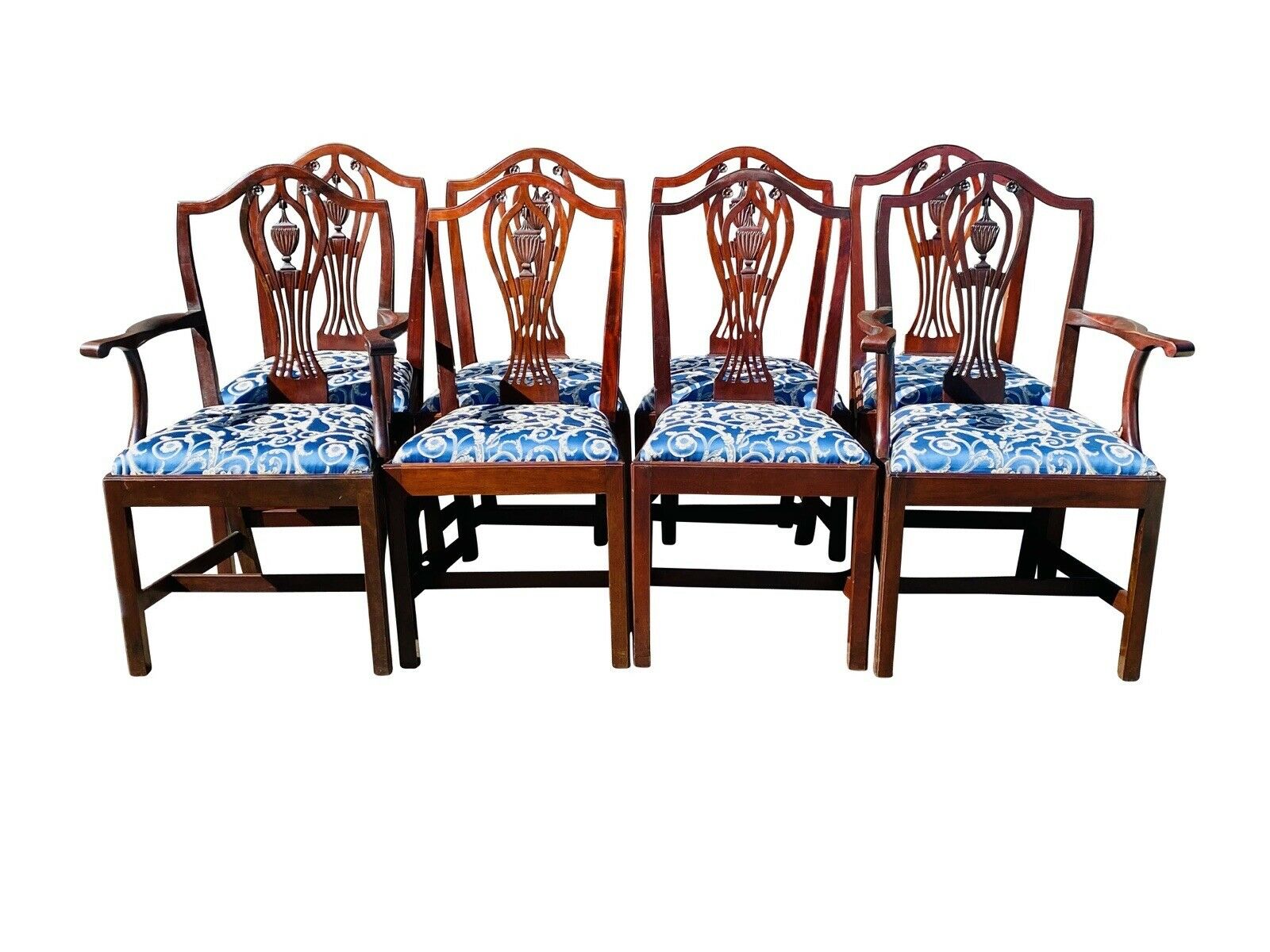 Bay Colony Antiques is pleased to offer for sale this wonderful set of 8 Hepplewhite antique style cherry dining chairs. The chairs have pierced splats with a carved urn & floral rosettes. The chairs have clean blue seats with white embroidered acanthus decorations and are free of any rips, stains, and odors. The chairs are in great condition with our only notes being some light sun fading in the finish and minimal surface wear. We didn’t polish these before taking our pictures because they looked so clean but now that we have the photos back we see a few minor nicks and light spots that would have colored in. We always give everything a thorough inspection and cleaning before sending it out the door and we will carefully polish these without soiling the seats. The side chairs measure 20 1/2” wide x 19” deep x 40” tall with a seat height of 19”. The arm chairs measure 26 1/4” wide x 20 1/2” deep x 41” tall with a seat height of 19” the seat alone measures 19” wide between the arms x 17” deep.