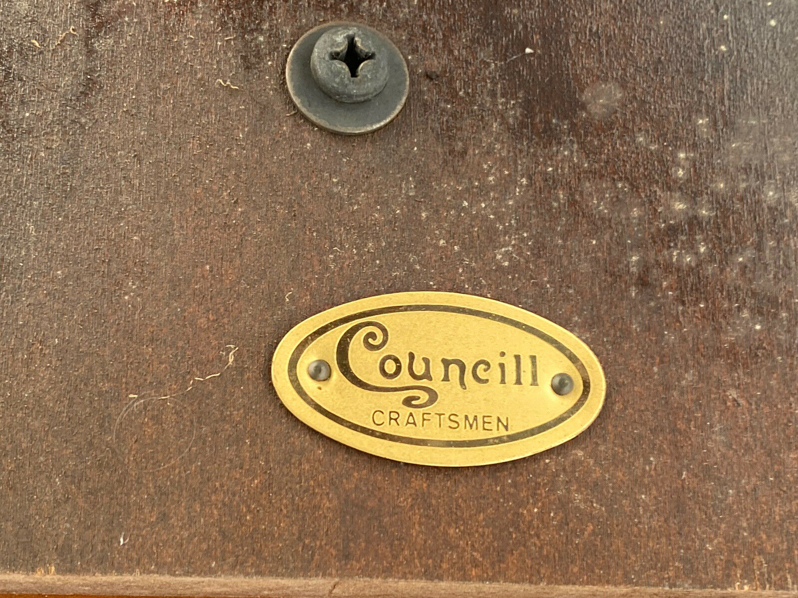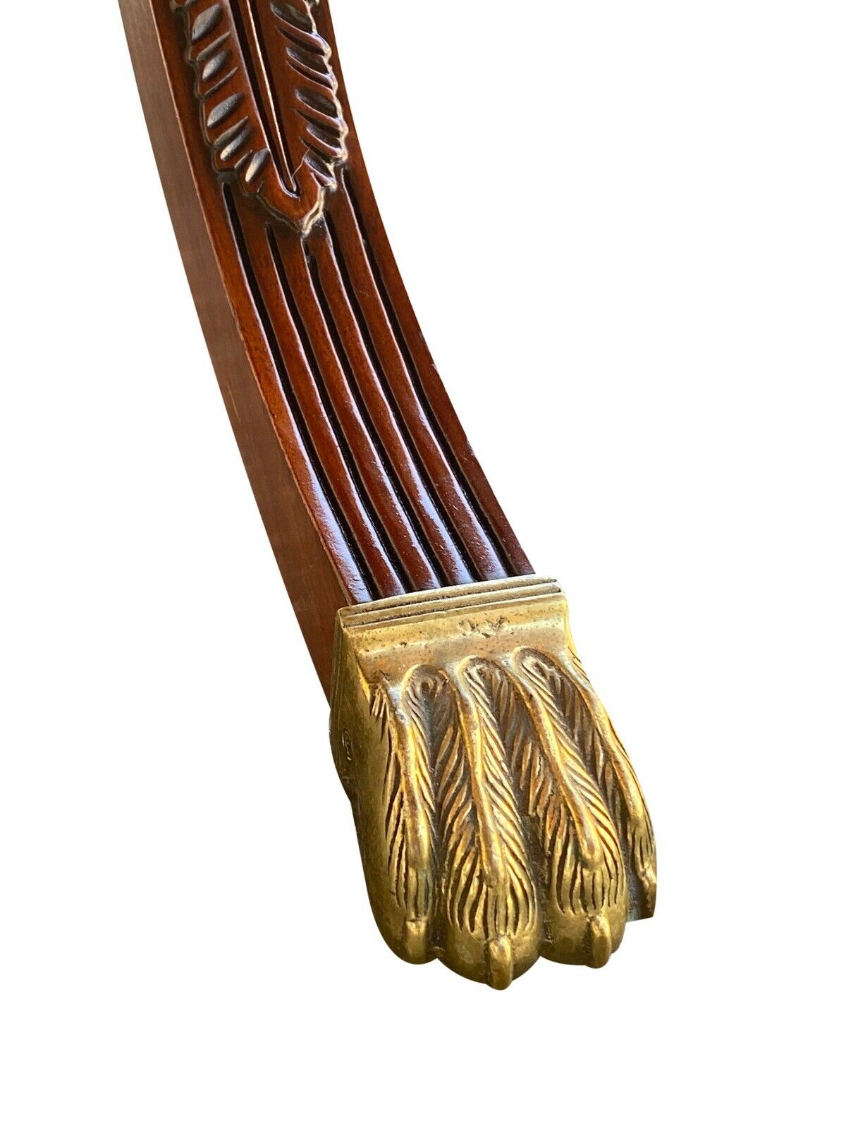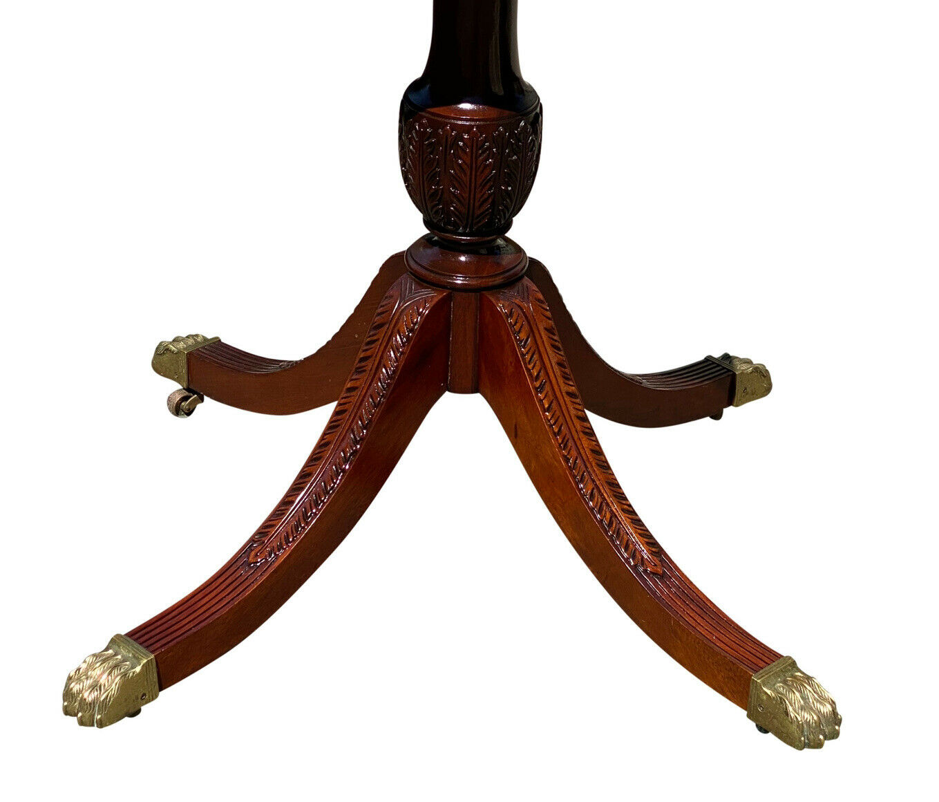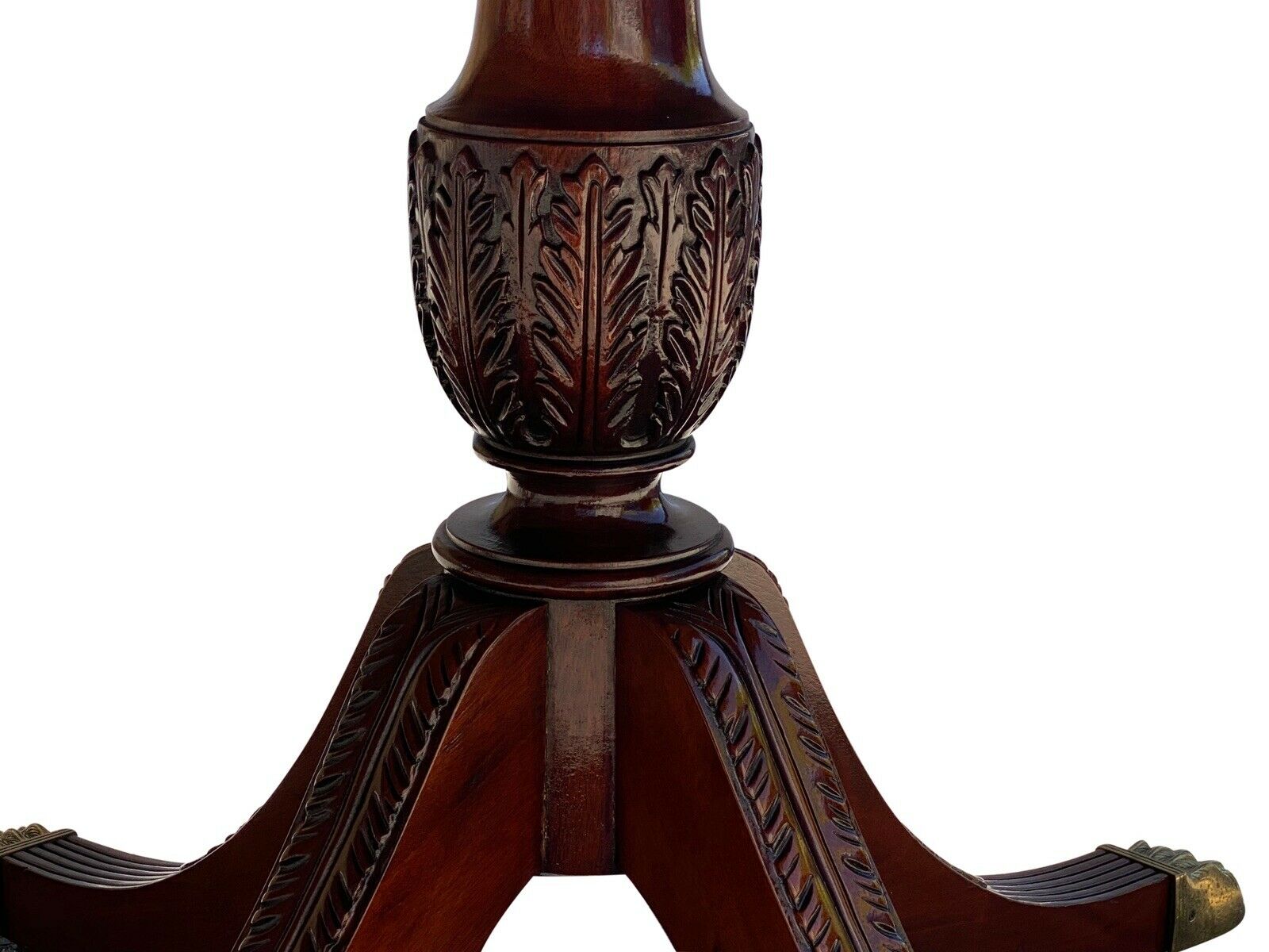We're delighted to offer for sale this fantastic 20th century Federal antique style mahogany banquet table by Councill Craftsmen. Councill Craftsmen was founded in 1973 and continues to produce some of the finest home furnishings available today. The table has a rectangular crotched mahogany top with rounded corners and a beautiful satinwood banding around the edge with holly & ebony to further accent the contrasting woods. The runners actuate with ease and the table has (3) 20" leaves. The table alone measures 72" long x 46" wide x 29 1/2" tall. When the three leaves are installed the table measures 132" long (11 feet). We purchased this from a historic MA home where it was very gently used by the family. When dealing with other resellers they'll just sell you a used table with the imperfections they disclose. We take a lot of pride in our business and have each table surface professionally refreshed by our master restorer before photographing & offering them to our clients. The table pedestals are highly carved with acanthus leaves & terminate in brass lion paw caps with caster wheels.