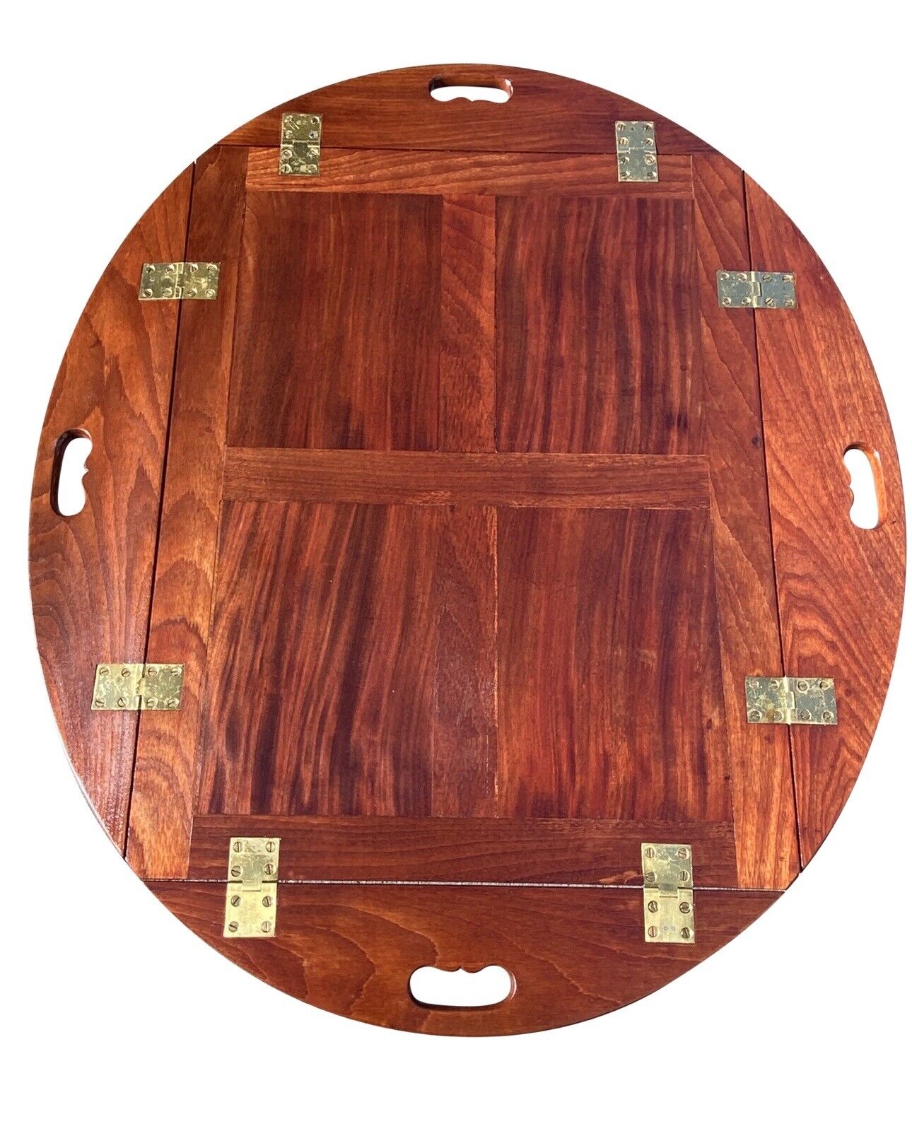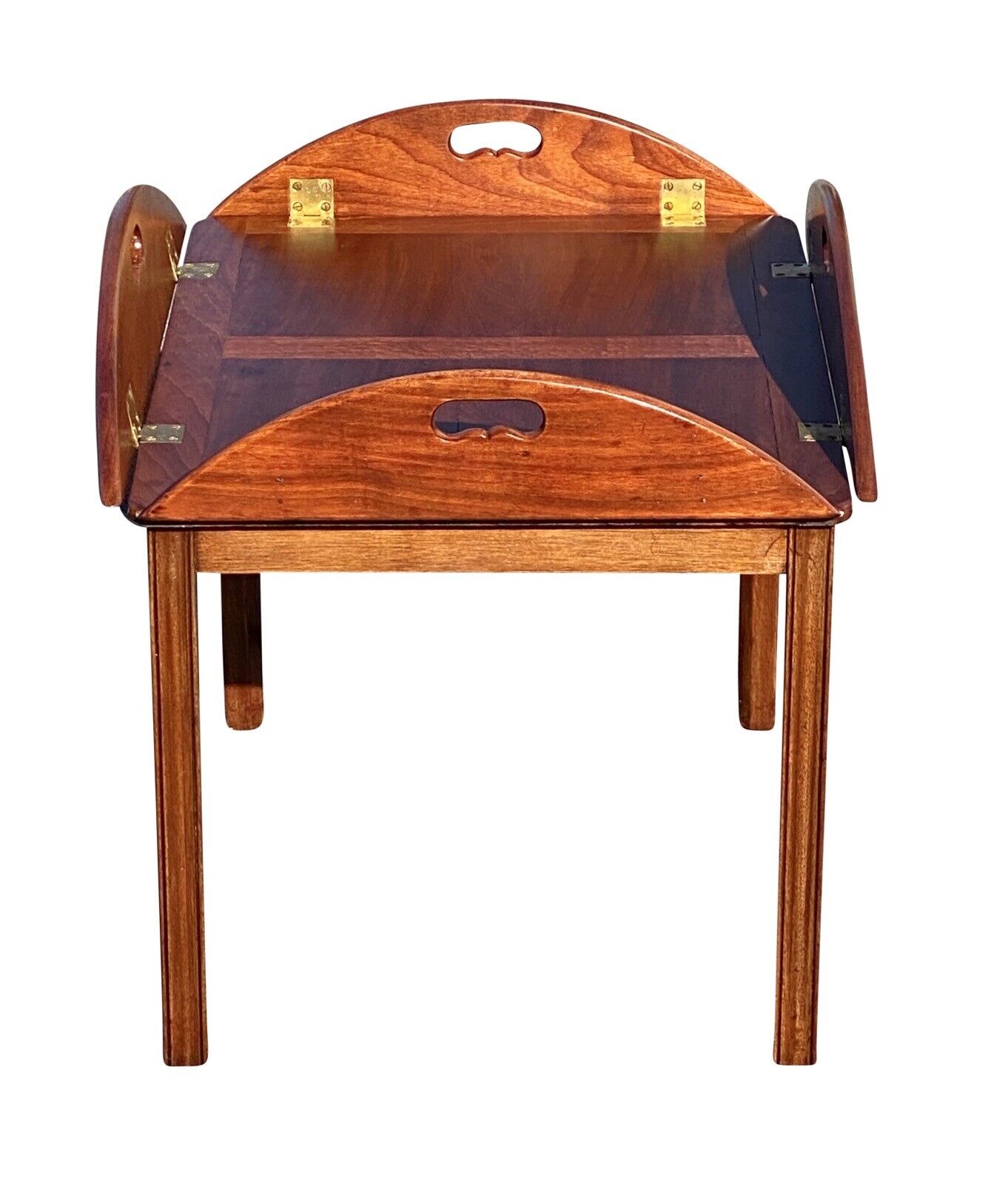 Bay Colony Antiques is proud to offer for sale this wonderful 20th century Chippendale antique style Mahogany butlers table. The table has a beautiful Mahogany top with pierced ends that are hinged and can fold up and down. These make great coffee tables, and this example is in very good condition. The table measures 28 1/4” wide x 22 1/4” deep x 23 1/4” tall with the flaps up. When the flaps are down the table measures 36” wide x 30 1/2” deep x 18 1/2” tall.