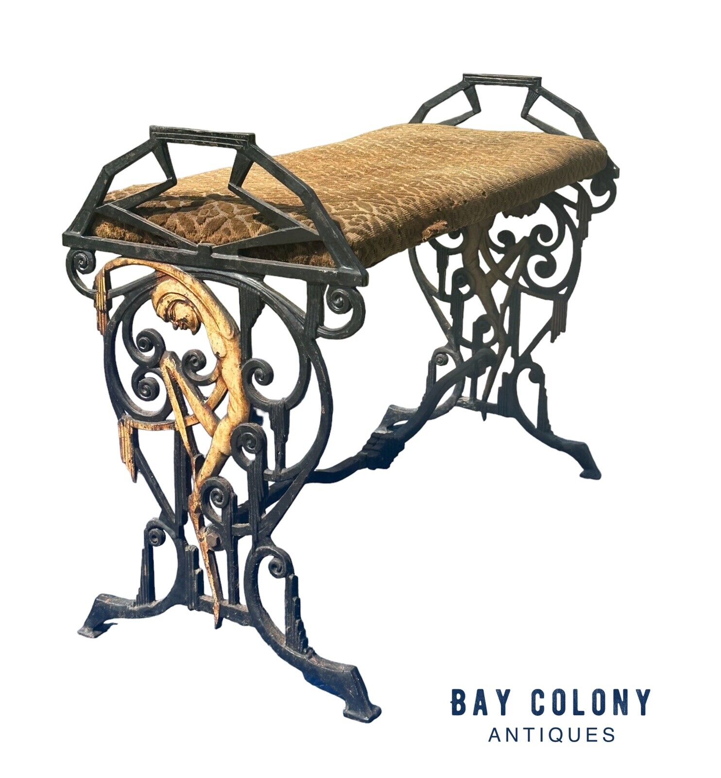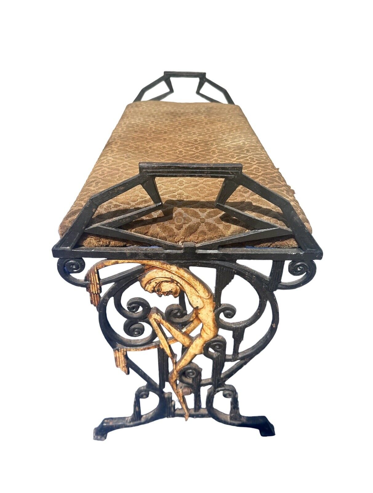 With our absolute highest compliments Bay Colony Antiques takes the utmost pleasure in offering this wonderful antique vanity bench. This bench is an exciting and rare example of Art Deco period design and features theatrical dancing figures amidst a field of spiraling curled ironwork. Particular detail is worked into the iron creating a sense of movement stemming from the dancing figures along with exaggerated anatomical proportions that enhance the tone of the work lending to a sense of despair. The original white paint still remains decorated over the dancing figures allowing for contrast and additional vibrancy. The upper side ends of the bench exhibit the geometric forms of traditional art deco design found often in architecture and decorative art. The bench is made complete with four well executed and finely styled feet and a well-formed stretcher which spans the distance between both side supports. The seat appears to have the original upholstered fabric which can be left alone or updated if so desired. This example is one of the finest antique art deco items we have been fortunate enough to encounter and we have no doubt it will ultimately be well loved by a collector of this spectacular design movement. This bench measures 24 1/4" long x 12 1/2" wide at the base x 19" tall overall.