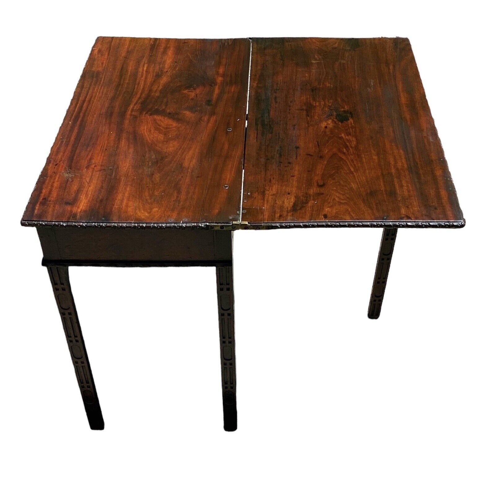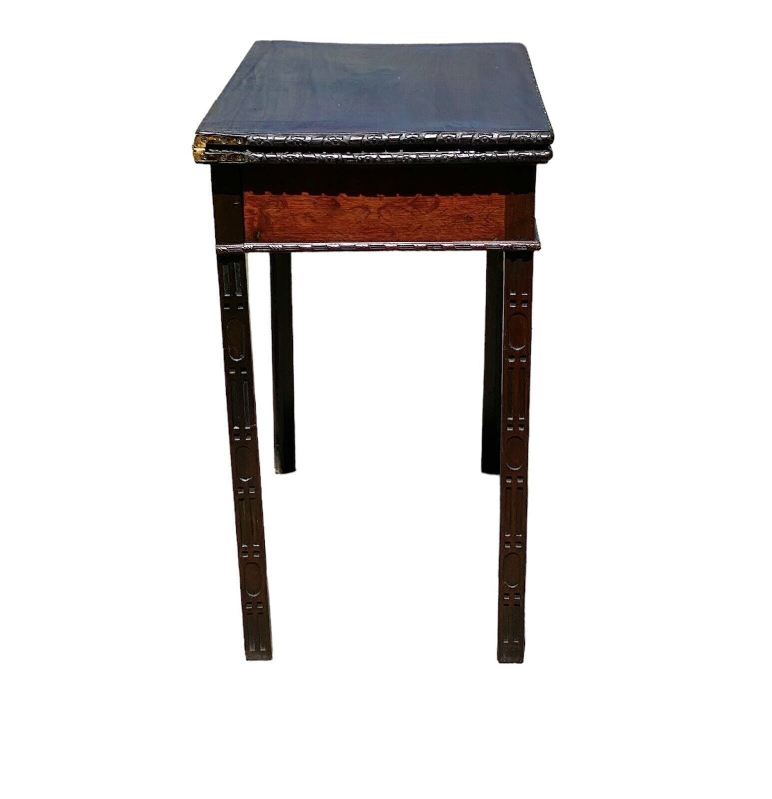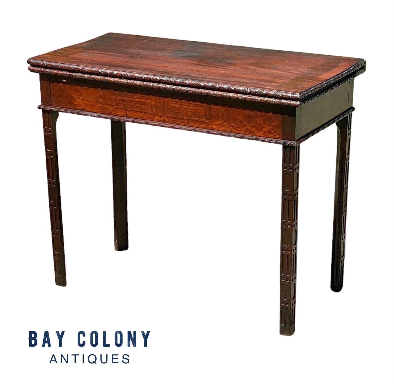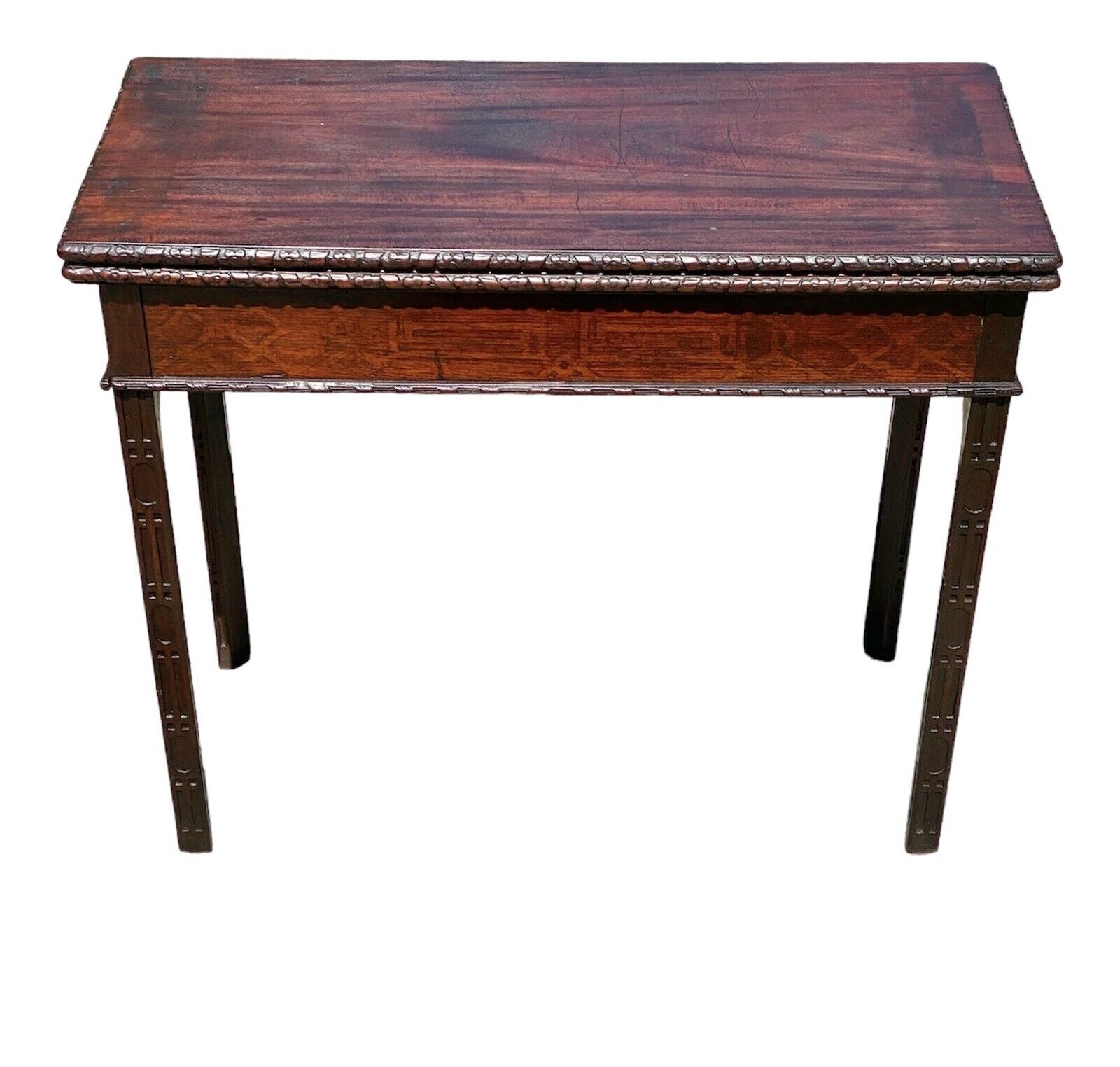 18TH CENTURY ANTIQUE CHINESE CHIPPENDALE MAHOGANY CARD TABLE WITH FOLIATE CARVED EDGE & COUNTER-RELIEF CARVED LEGS CA 1760