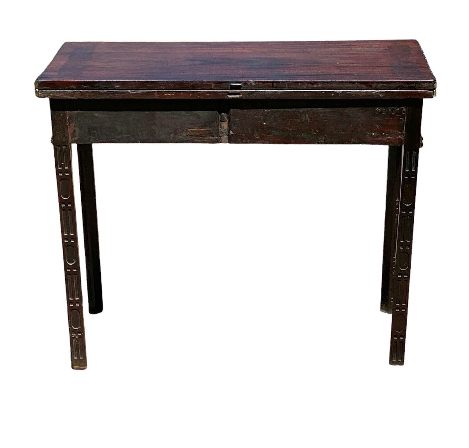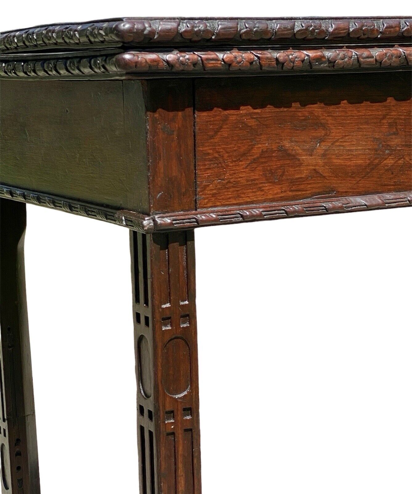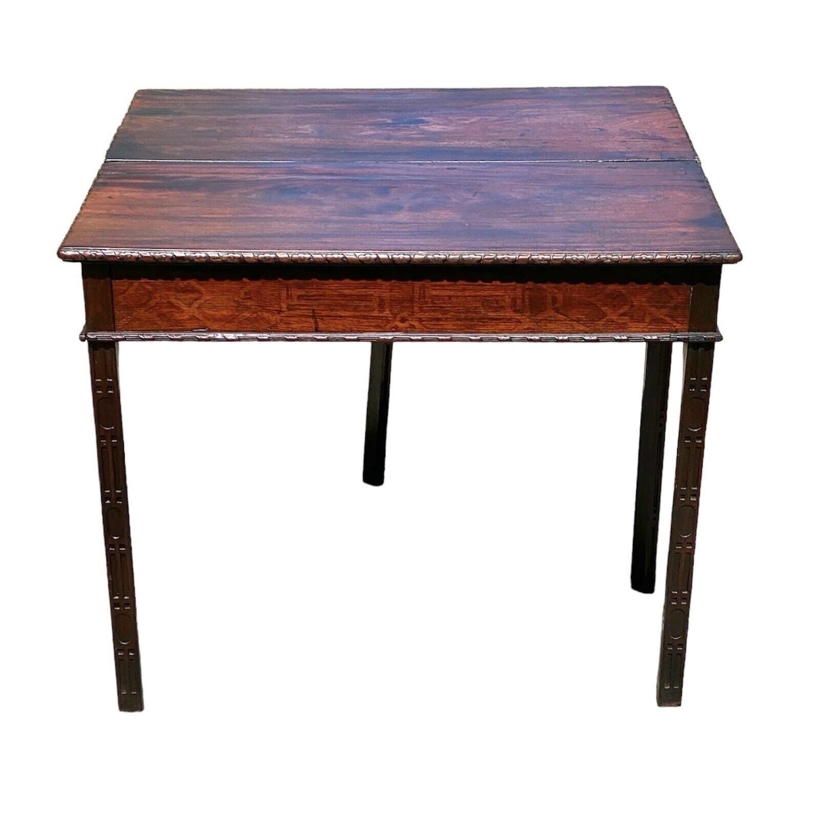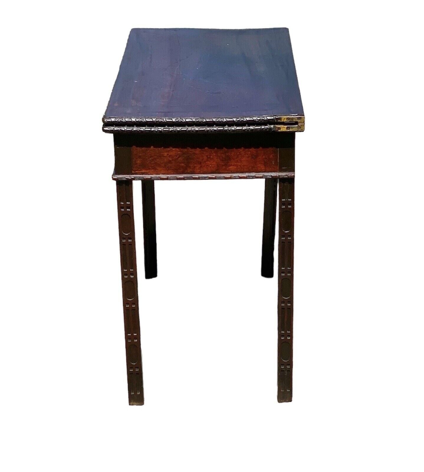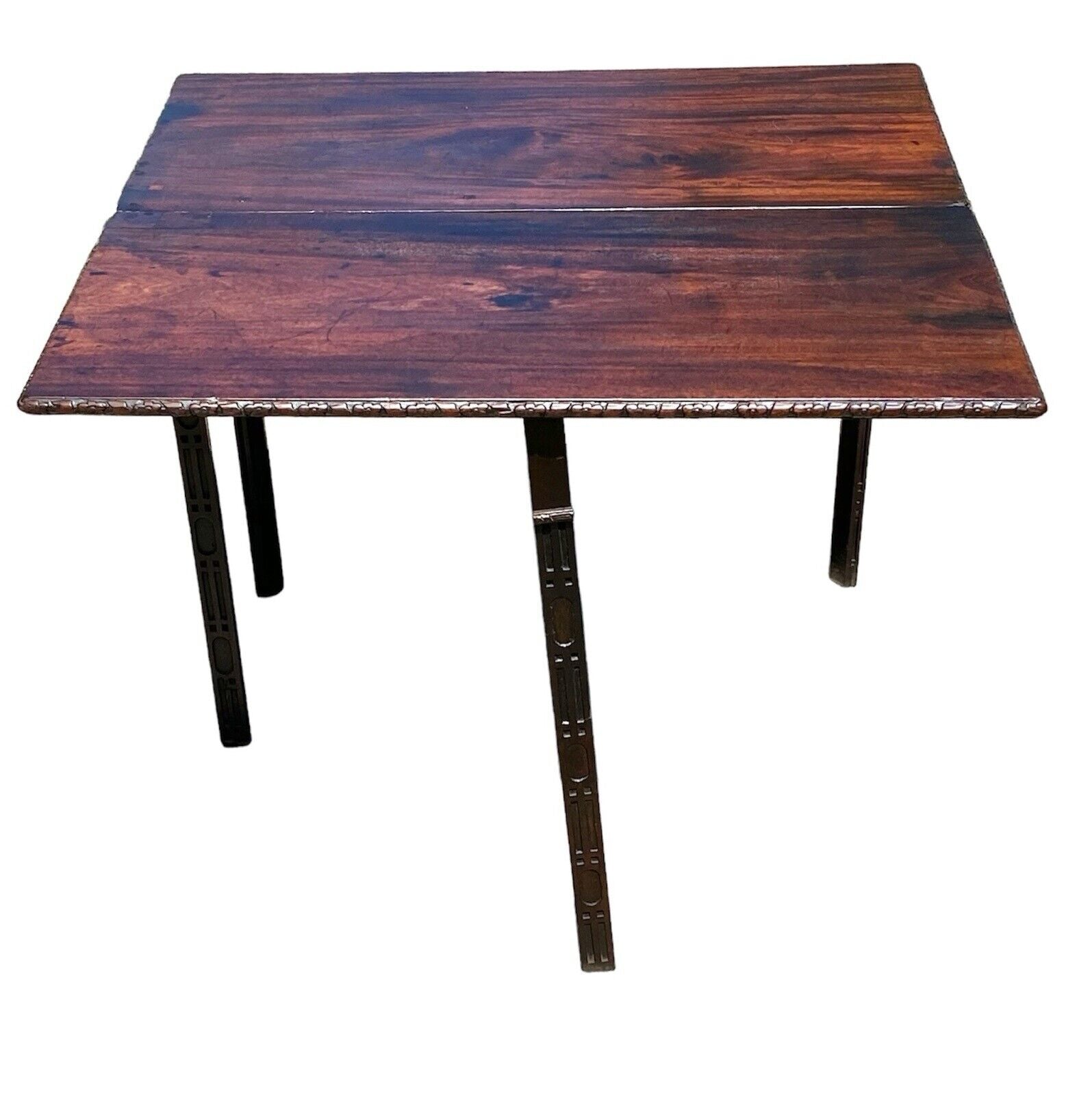 18TH CENTURY ANTIQUE CHINESE CHIPPENDALE MAHOGANY CARD TABLE WITH FOLIATE CARVED EDGE & COUNTER-RELIEF CARVED LEGS CA 1760