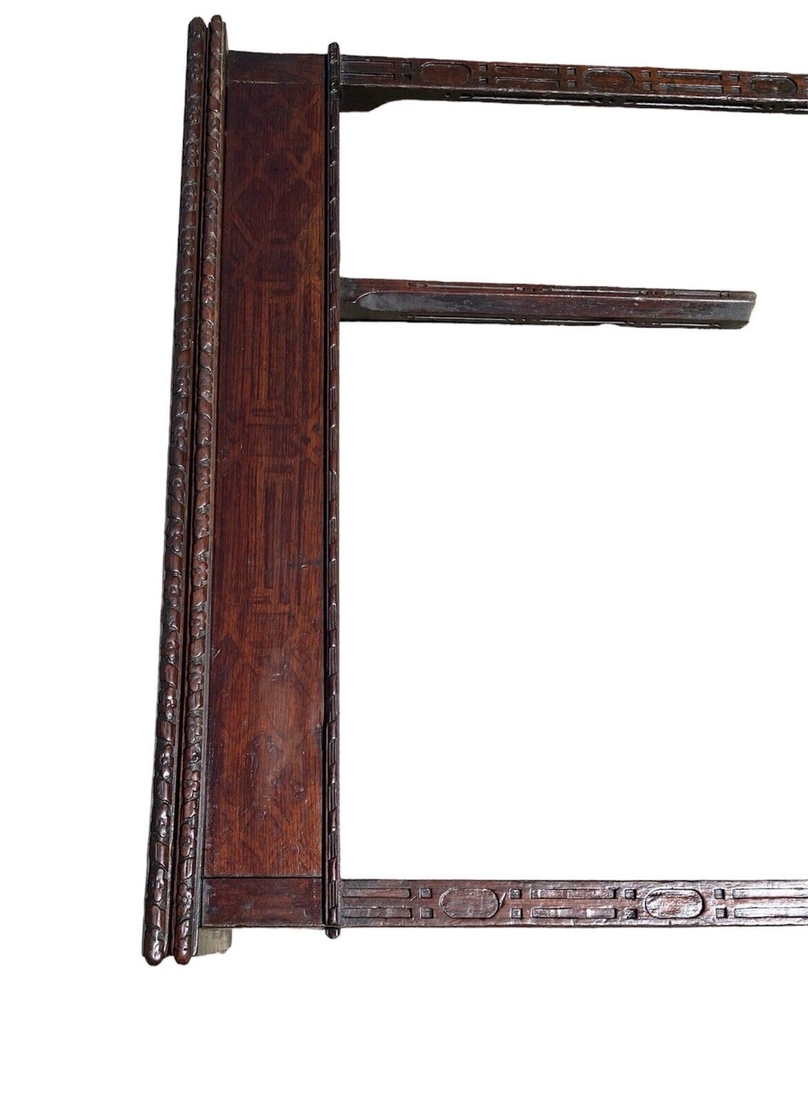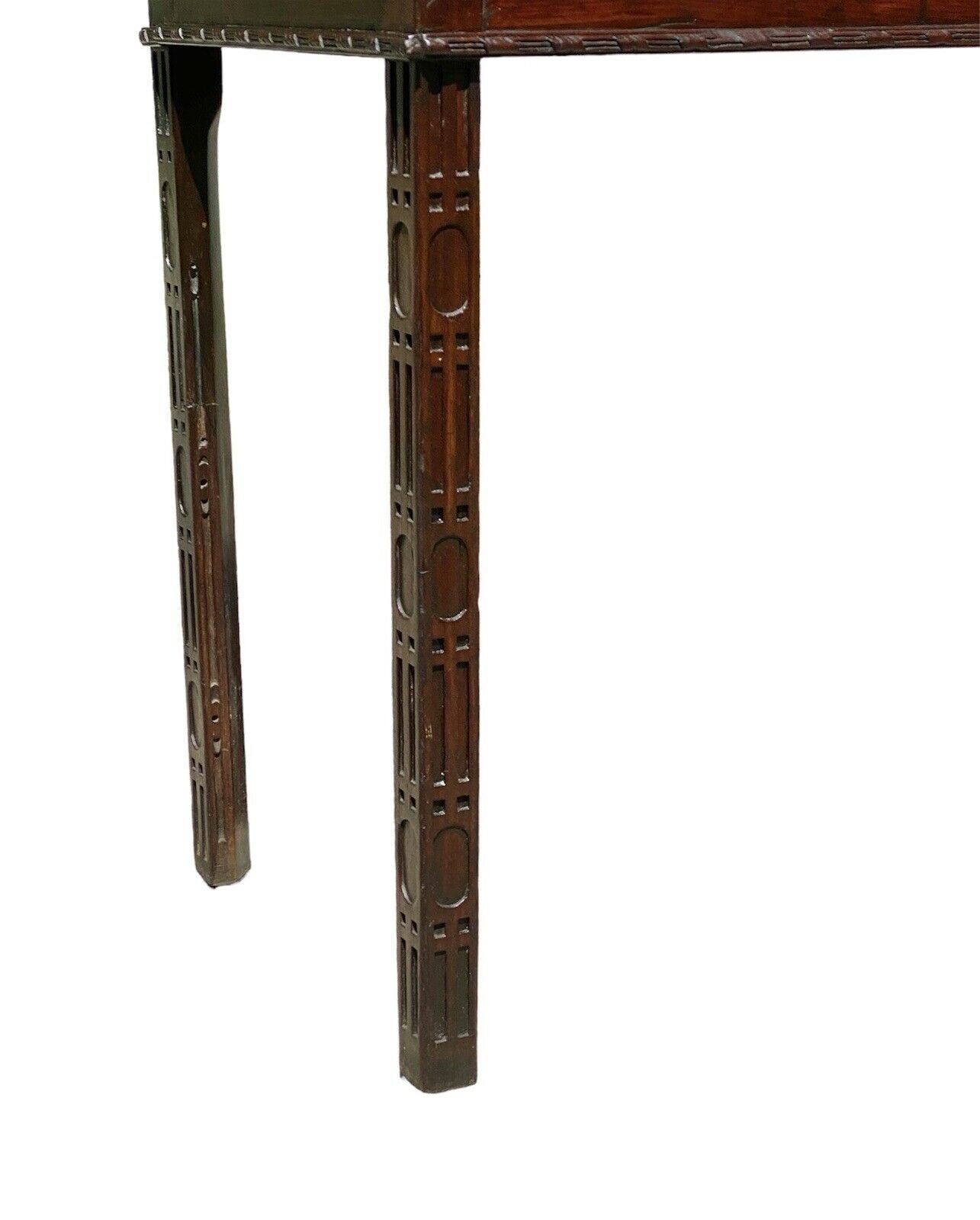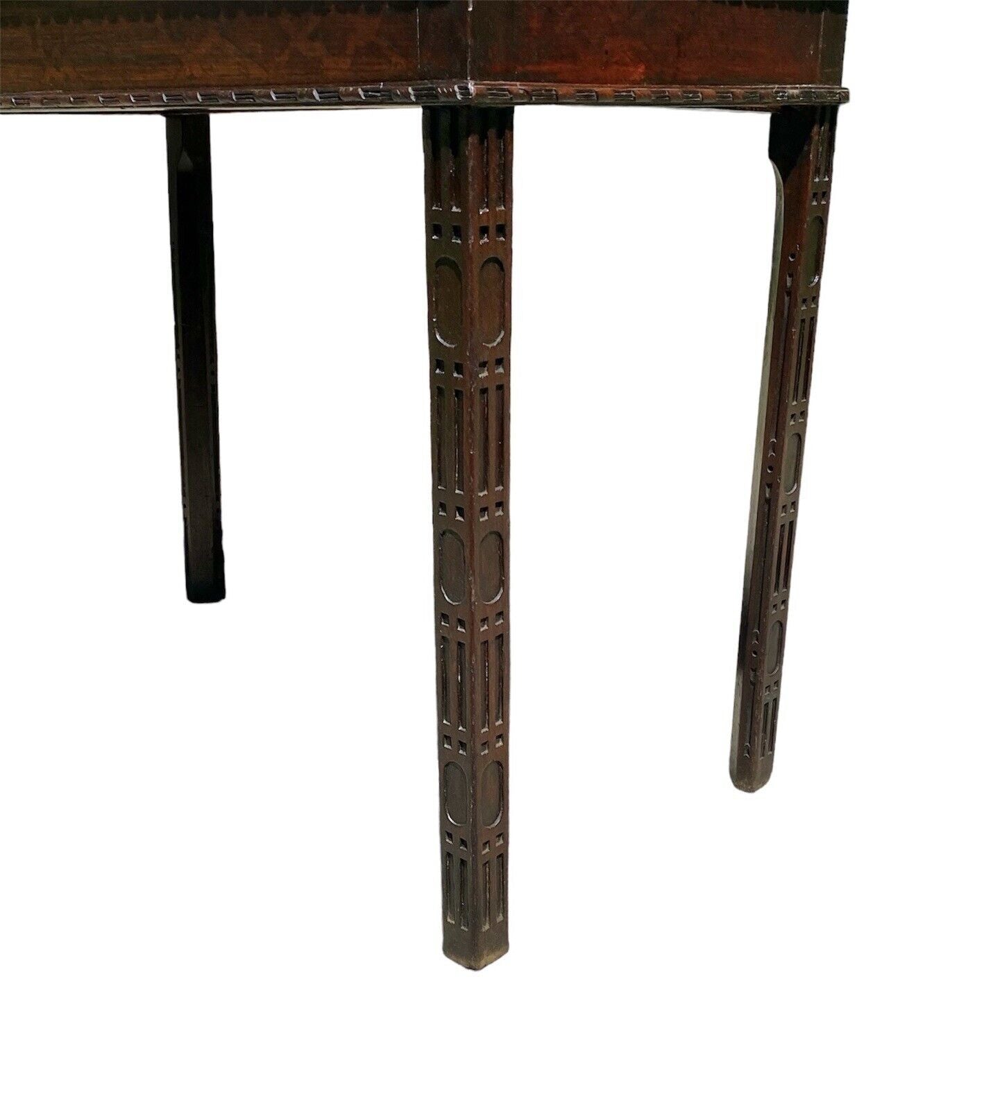 The table has an oblong rectangular top comprised of two solid Mahogany boards that open to a square. The Mahogany exhibits a beautiful grain pattern and it’s quite remarkable given the density and size of the boards that they haven’t developed any major age splits or significant warping after 250+ years. The top does have some moderate scratching & wear, but we wouldn’t recommend refinishing the piece as the surface is very old, likely original. The top and corresponding leaf have an exquisite foliate carved edge with a repeating pansy pattern. The table has a straight apron with either the silhouette of an applied fretwork decoration or the remnants of a painted Chinese Chippendale fretwork design. The fretwork pattern is noticeably different than the more common designs and was undoubtedly influenced by the novel patterns published in Thomas Chippendale’s “The Gentleman And Cabinet-Makers Director”.