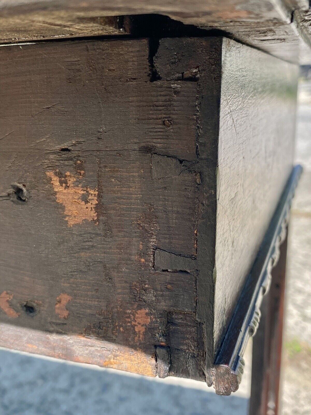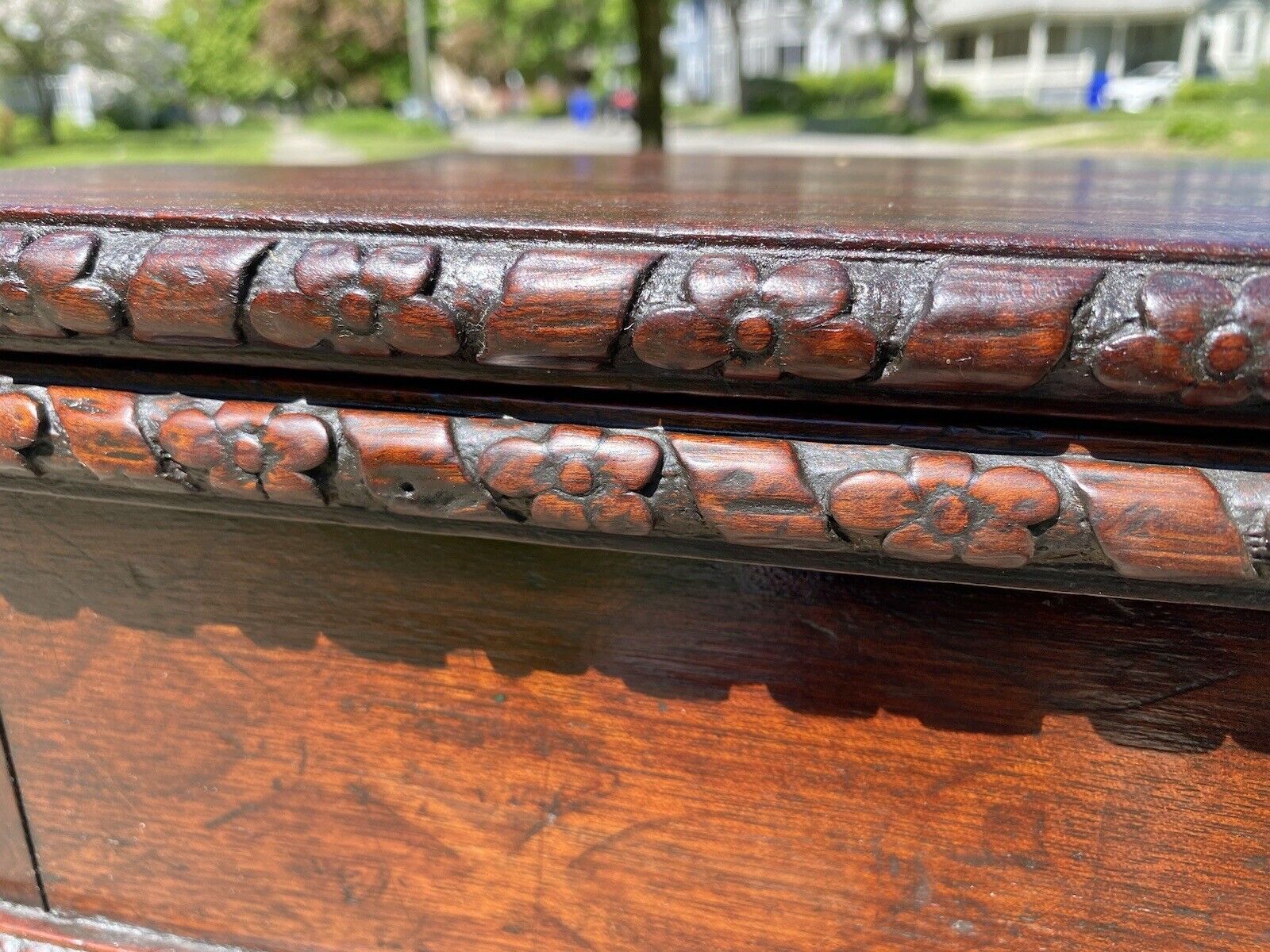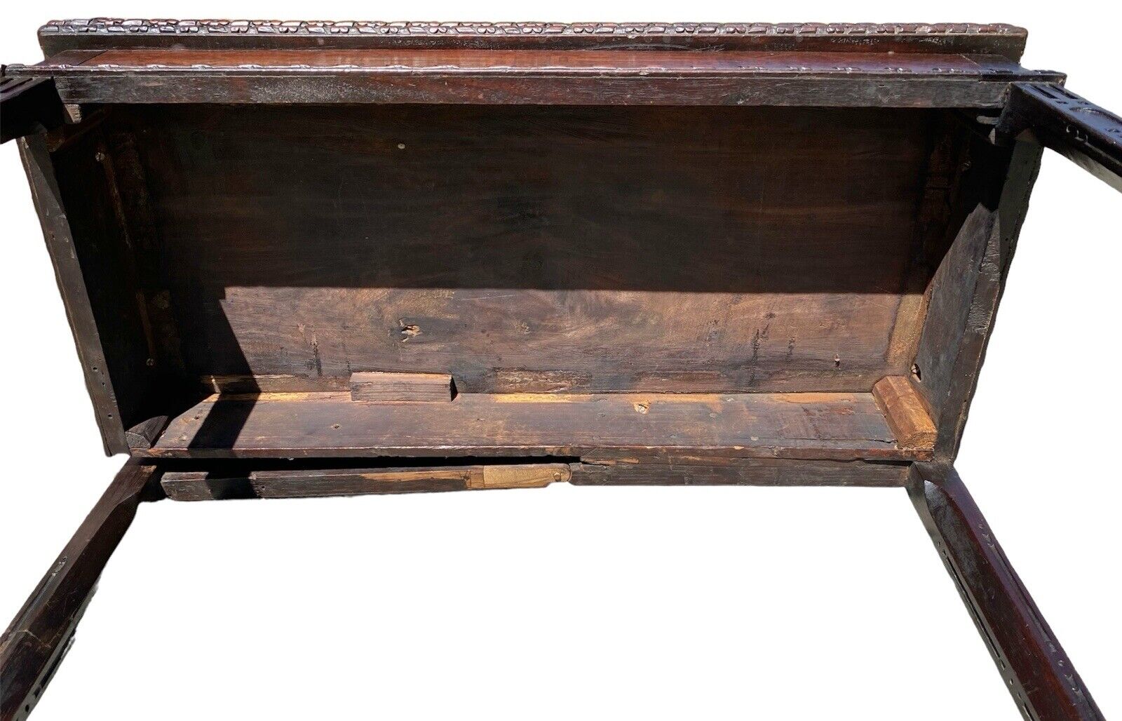 The table has an oblong rectangular top comprised of two solid Mahogany boards that open to a square. The Mahogany exhibits a beautiful grain pattern and it’s quite remarkable given the density and size of the boards that they haven’t developed any major age splits or significant warping after 250+ years. The top does have some moderate scratching & wear, but we wouldn’t recommend refinishing the piece as the surface is very old, likely original. The top and corresponding leaf have an exquisite foliate carved edge with a repeating pansy pattern. The table has a straight apron with either the silhouette of an applied fretwork decoration or the remnants of a painted Chinese Chippendale fretwork design. The fretwork pattern is noticeably different than the more common designs and was undoubtedly influenced by the novel patterns published in Thomas Chippendale’s “The Gentleman And Cabinet-Makers Director”.