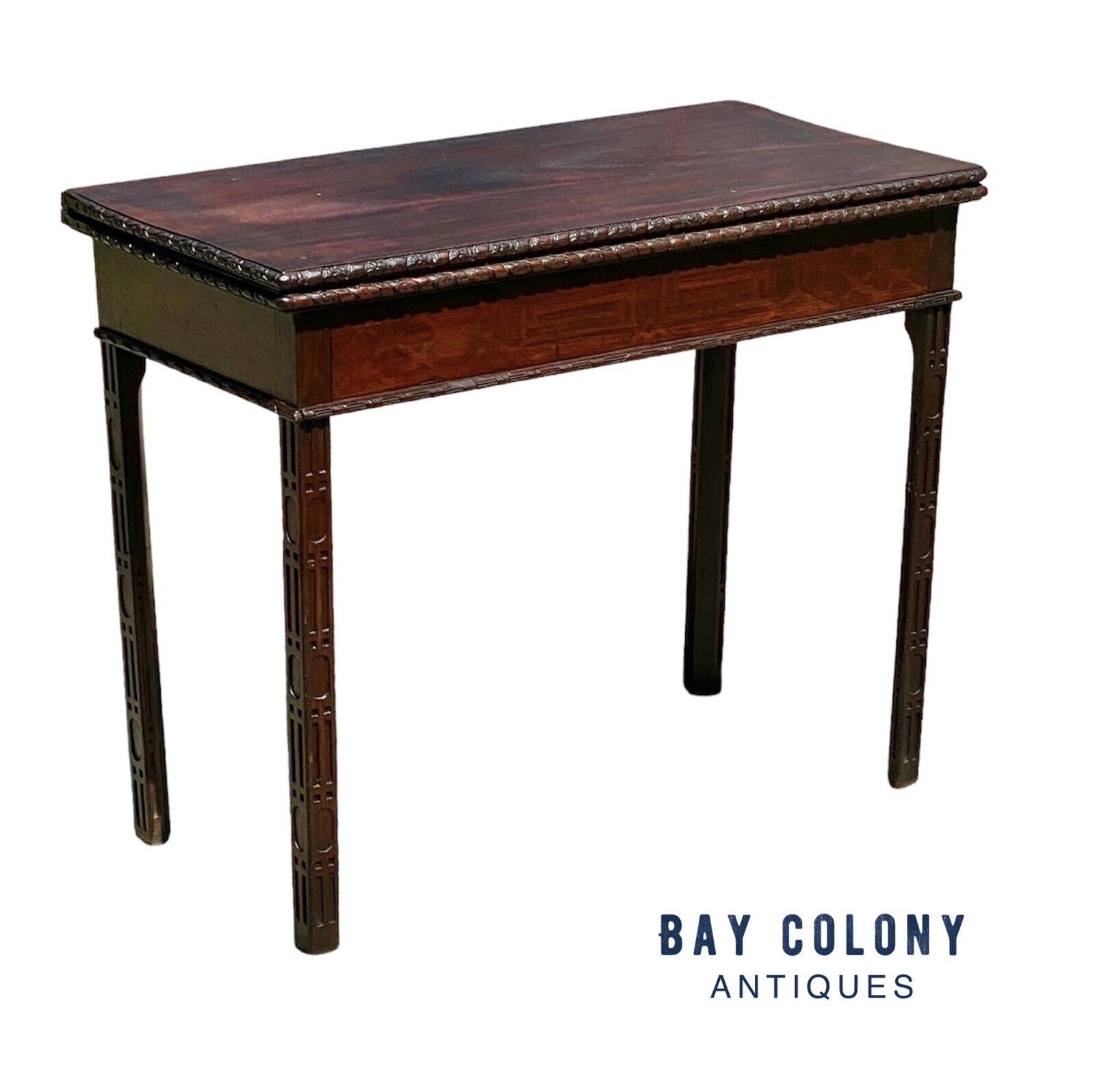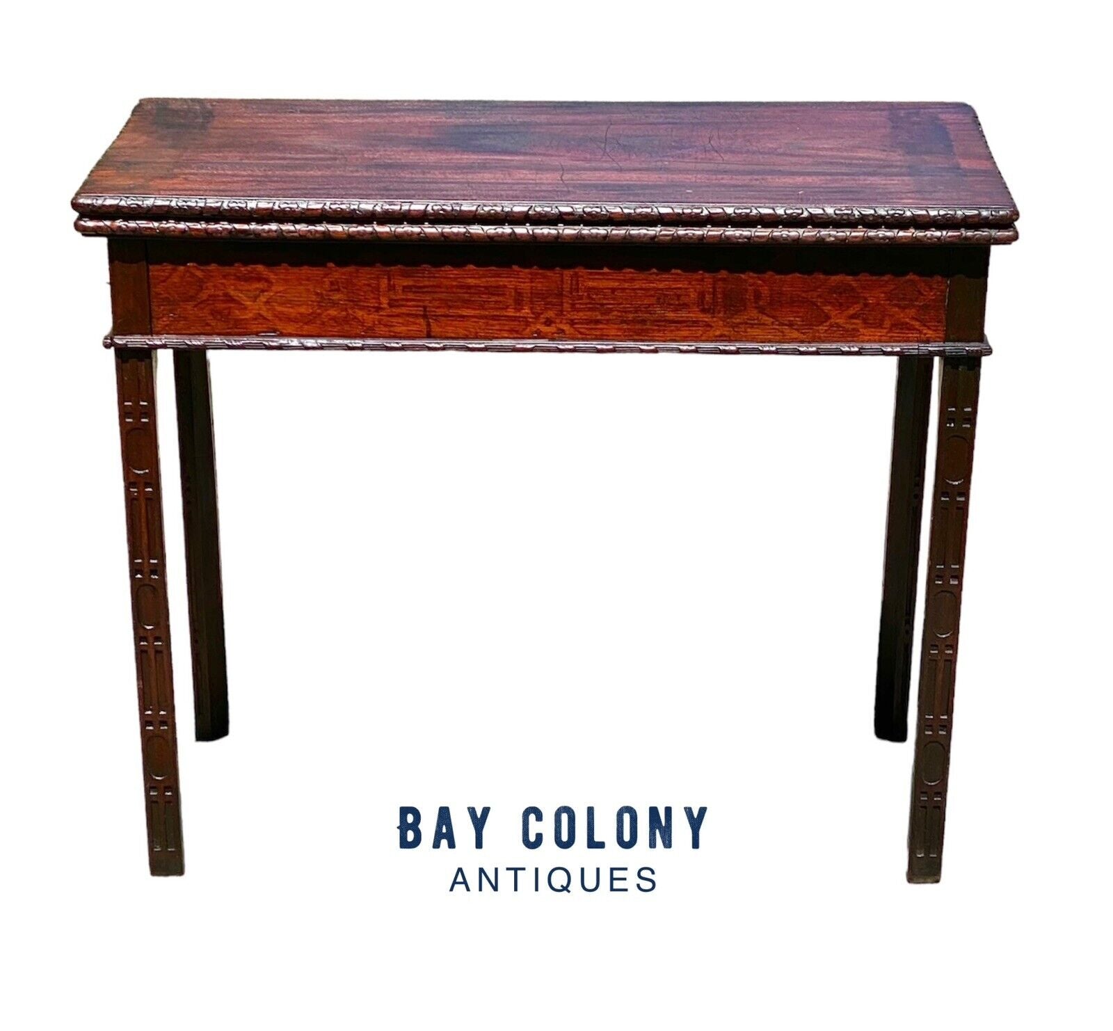 Bay Colony Antiques is extremely proud to offer for sale this exceptional 18th century antique Mahogany Chinese Chippendale card table. The table was likely made in England, but we are exploring the idea that it could have been made by a London trained cabinetmaker working in America in the traditional high English style. We feel that we have this priced very competitively, and if we can confidently attribute this to either a Virginia or South Carolina cabinetmaker, this extremely rare table would become even rarer, and easily double in value. The carvings on the legs are very unique and would probably be the easiest avenue to attribute a specific cabinetmaker. We’ve exhausted our reference library, but as always will amend the listing as we conclude any more information. Colonial Williamsburg has a similar table (item no. 1936-353) that they have dated between 1755-1765. We believe this table was made right around the same time and believe this is a superior table in just about every regard. We take great pride in being able to offer our clients museum grade antique furniture at a fraction of the cost of large auction houses like Sotheby's & Christies.