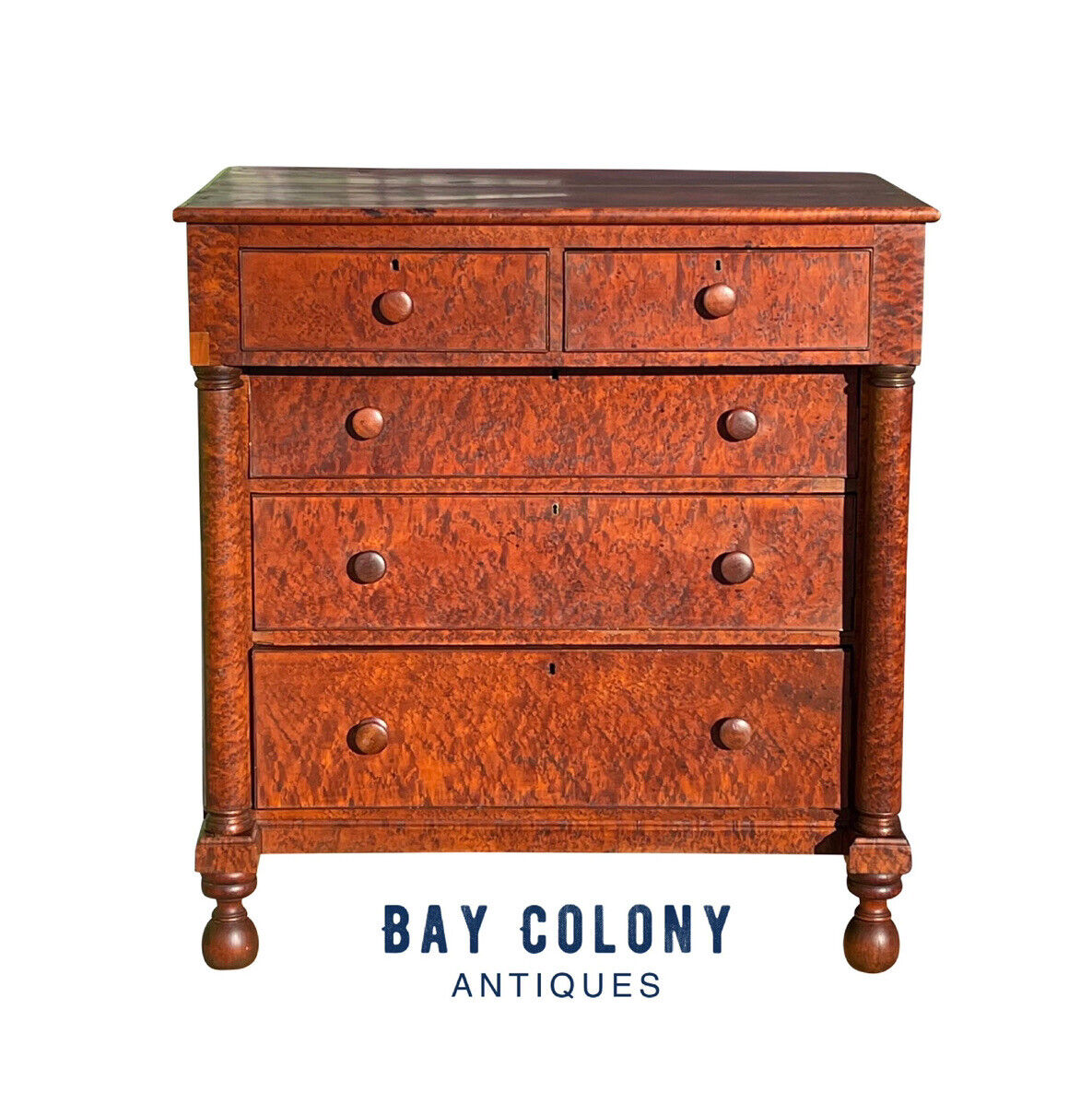 With our highest compliments Bay Colony Antiques takes the utmost pleasure in presenting for sale this magnificent and bold early American gentleman's chest of drawers. This chest was constructed in upper New England, likely Vermont or New Hampshire, sometime at the turn of 19th century circa 1800 - 1820. The patron who had commissioned this chest would have had some means in this era to afford to have a cabinetmaker construct such a commanding piece of furniture with only the finest native hardwoods as well as the boldest bird's eye maple solid wood stock and veneers available anywhere at the time. This old growth maple is significant to the treasury of early American design as the larger cities where the finest craftsman trained were dominated by exotic hardwoods such as mahogany with which the finest federal furniture was made. It is only in rare pockets of rural America at this time where bold and brilliant federal furniture constructed from centuries old maple trees have existed, and throughout two centuries have become among the rarest and most sought furniture of the federal era. This particular chest is among the finest ever produced from the upper New England region through the federal era. The cabinetmaker displays superiority in proportion and execution of design as the large form of the case is well presented through fine lines and a graduated case construction. The two upper drawers rest above the three increasing larger lower drawers which appear to flow evenly from one confluent design. The width and depth of the cabinet are exactly as proportional as they should be and the overhung top and turned feet and all masterfully crafted to size and scale. We take the time to note this as most chests made in rural communities are generally blocky and disproportional as most rural cabinetmakers lacked the refinement that master level furniture makers possessed. Each drawer has a fine cockbead molding which accents the edges and an original brass escutcheon. The chest features a frame and panel constructed side which allows the body of the chest to float throughout the centuries which gives the wood the ability to adapt to changes in humidity throughout seasons where woods expand and contract. The hand of a masterful wood turner was utilized to construct the fabulous twin pilaster columns as well as the exceptional cannonball formed feet. The cannonball feet are prized among fine federal furniture collectors and regular collectors alike for both the uniqueness of the design and the functionality of the heavy foot as the chest will be slid around from time to time without worry of damaging the legs. The chest measures 43 1/3" wide x 25" deep x 46 1/2" tall.