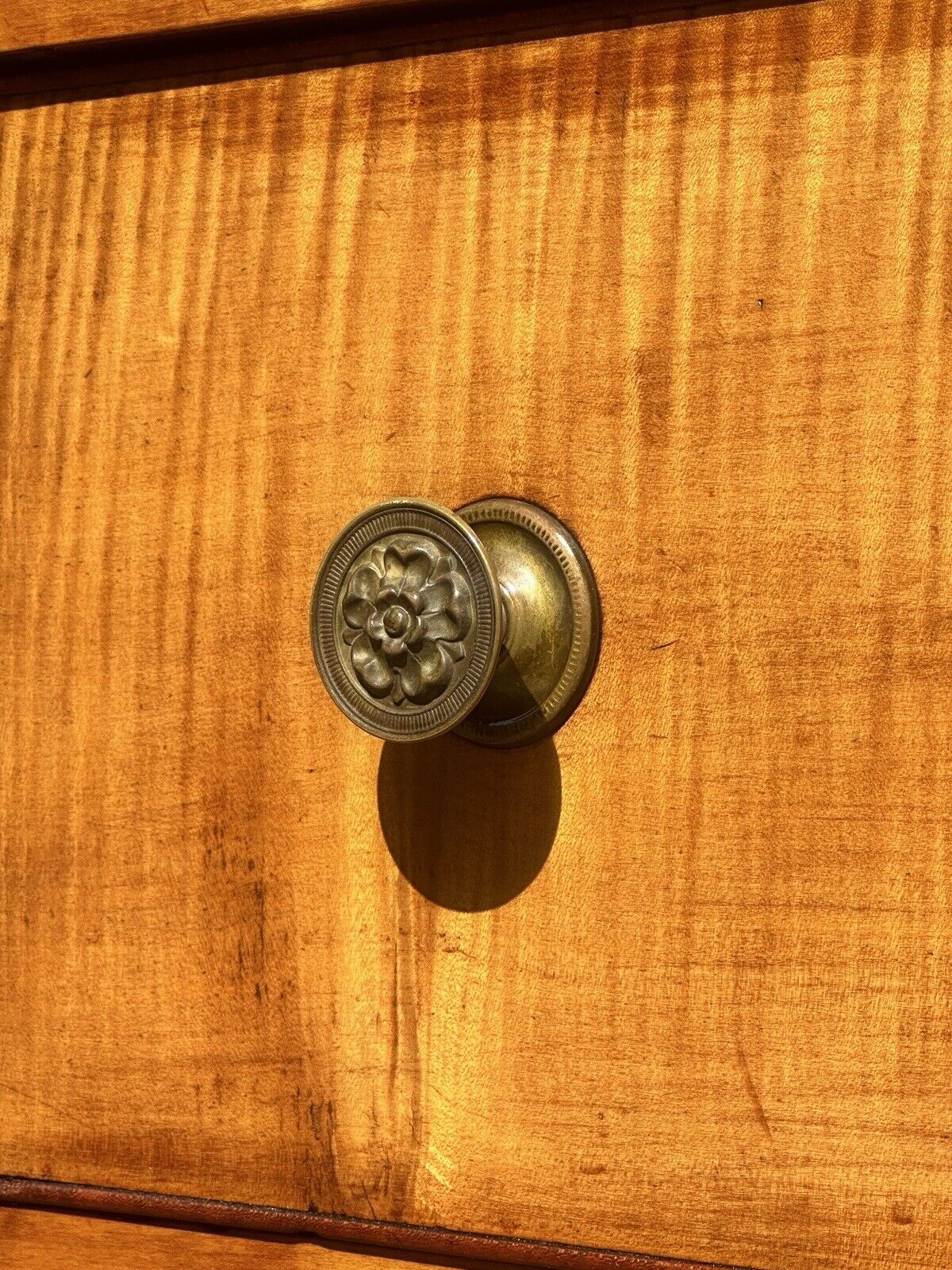This antique tall chest is in overall excellent condition with a beautiful color and patina that will only continue to enrich the appeal and character of the piece as time goes on. Each drawer is fitted with floral embossed brass drawer pulls, inset brass escutcheons on the three primary drawers, cockbead molding around the drawer frame, hand cut dovetailed drawer construction, and chamfered drawer panels. The lowest drawer panel received the most amount of oxidation and when it is removed from the case the centuries of age become apparent from glimpsing the underside of the drawer panel. The same exact matching oxidation and patina can be found on the backboards of the chest as well indicating centuries of age. The sides of the chest feature frame and panel construction which is beneficial in allowing the chest to acclimate to changes in humidity throughout the seasons. The tall chest stands on four finely turned legs in the Sheraton manner which end on ball feet. The chest measures 40 1/2" wide x 21" deep x 48 1/2" tall.