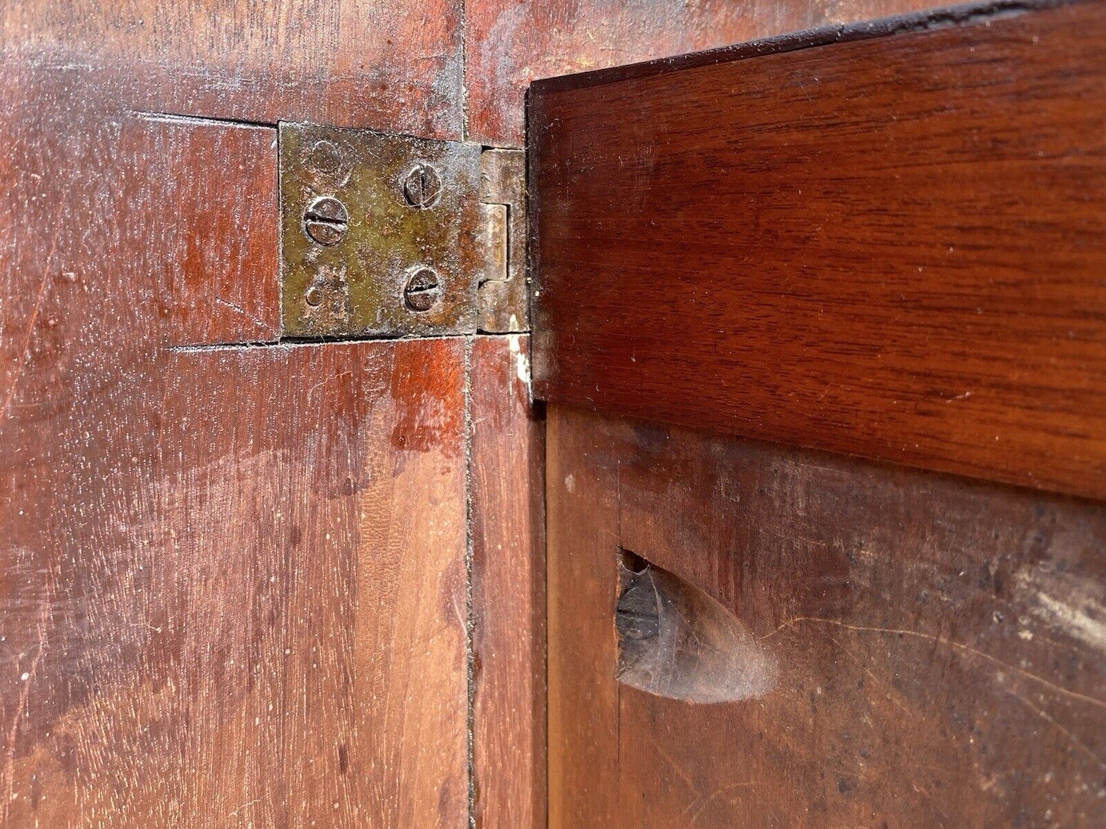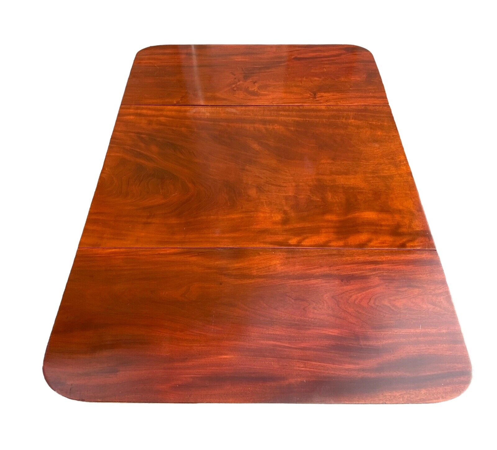 Bay Colony Antiques is proud to offer for sale this wonderful antique Sheraton Mahogany drop leaf dining table. The table was undoubtedly made in New York and is a fantastic example of the local style that dominated New York City in the early 19th century. We purchased this from a local Hampden County home from a woman in her 80’s who told us this was her grandmother's table. She was actually quite reluctant to let it go but because her and her husband were downsizing, they had no other choice but to part ways with it. If you value originality over all else when sourcing your antiques, you will not want to miss this table. Structurally the table is completely undisturbed, right down to its original glue blocks. The top is absolutely stunning & showcases 3 large solid Mahogany boards with an interesting grain pattern. Oftentimes boards of this size will split being in a foreign environment, but this table has withstood the test of time phenomenally. The Caribbean Mahogany used for the top would be close to impossible to source today as it was harvested to near extinction levels and the few remaining forests are thankfully protected today. The Mahogany has a bold grain pattern with nice dark striations and a light plum pudding figuring present.