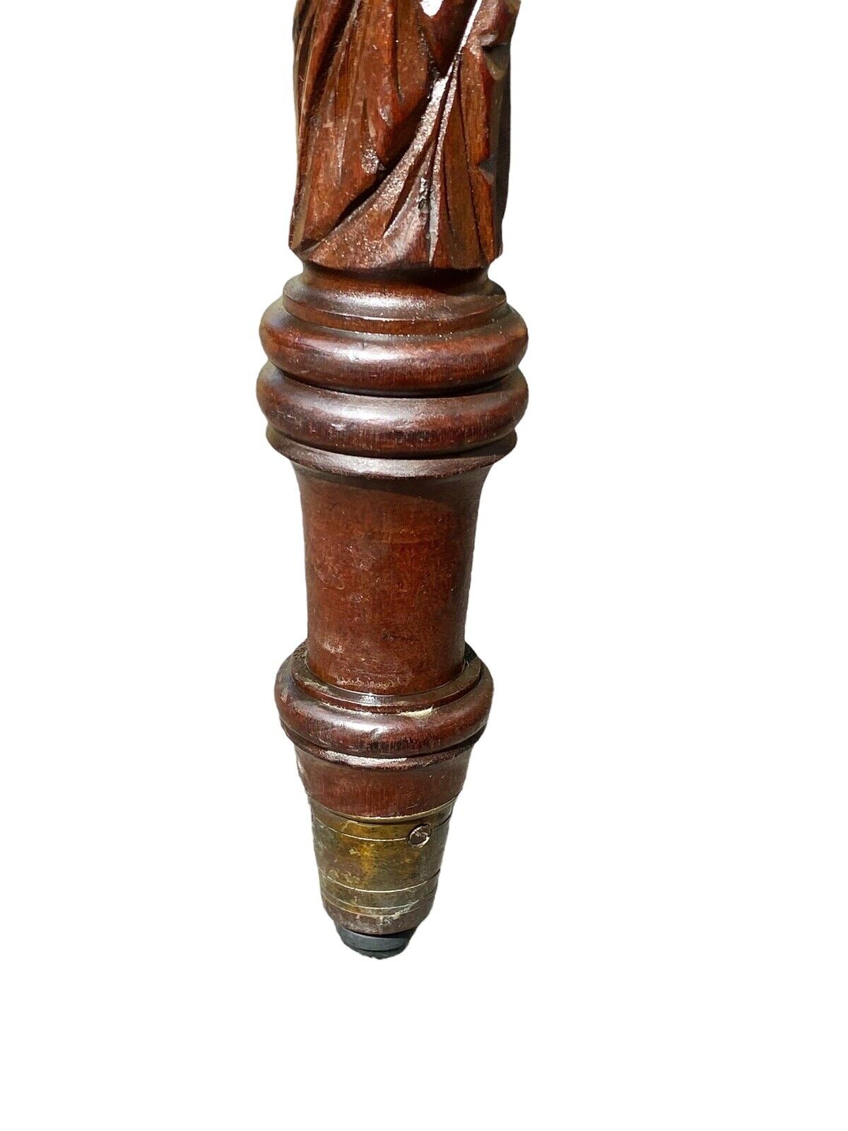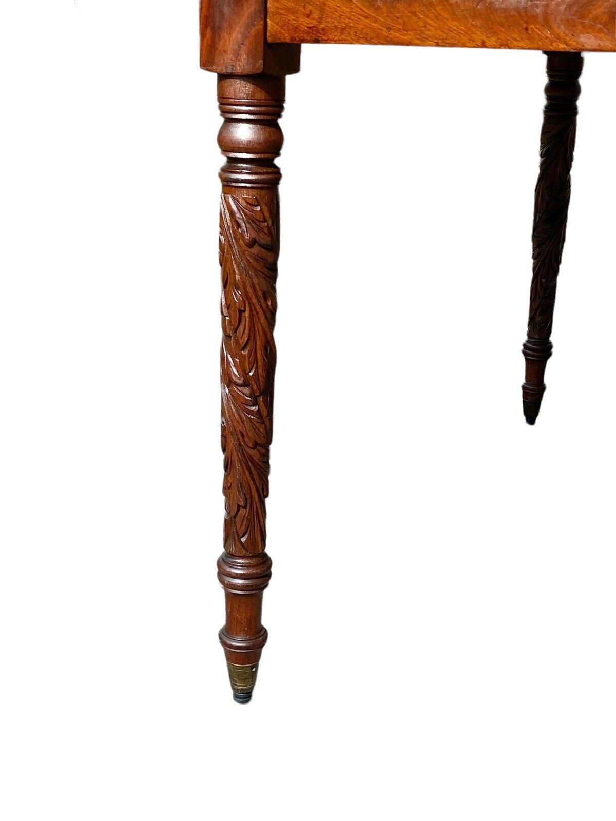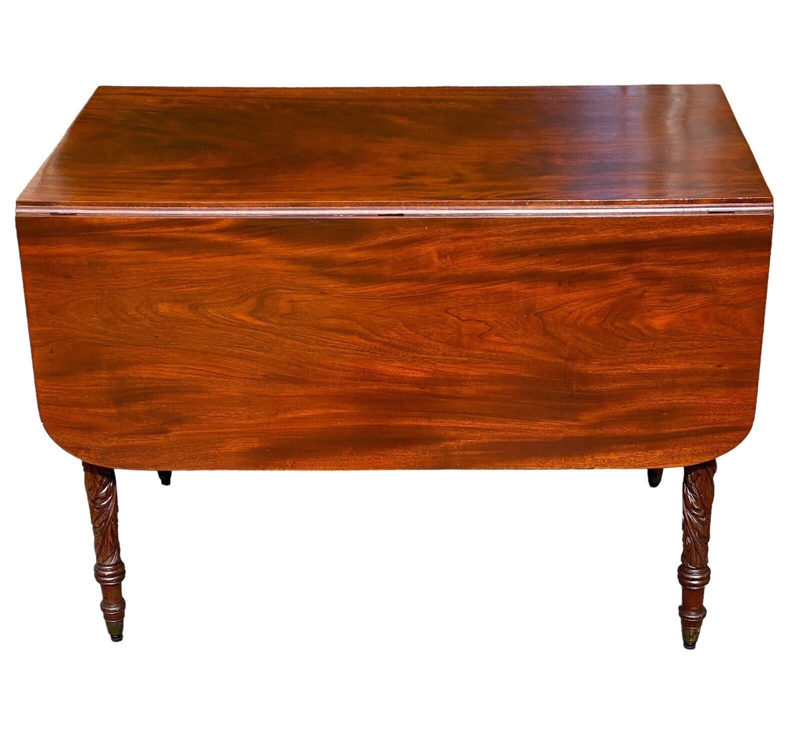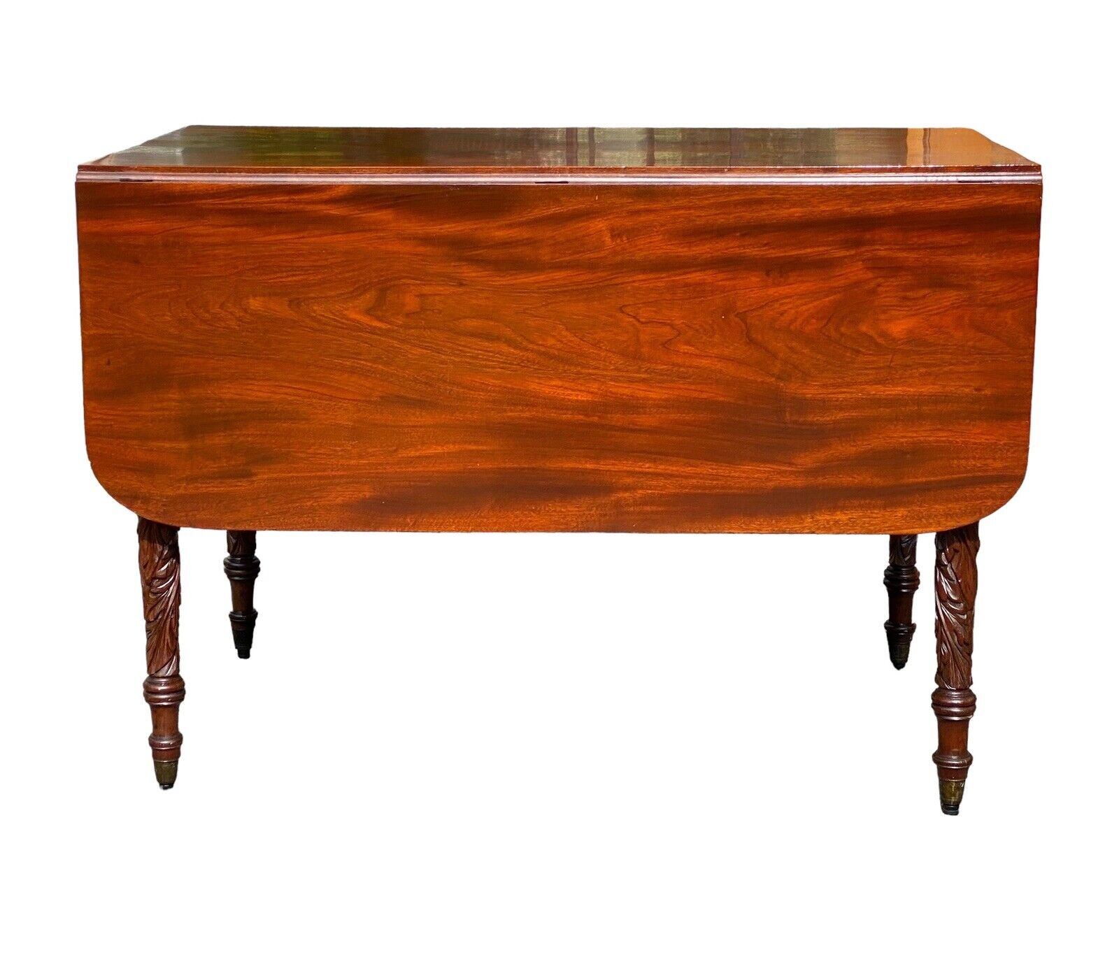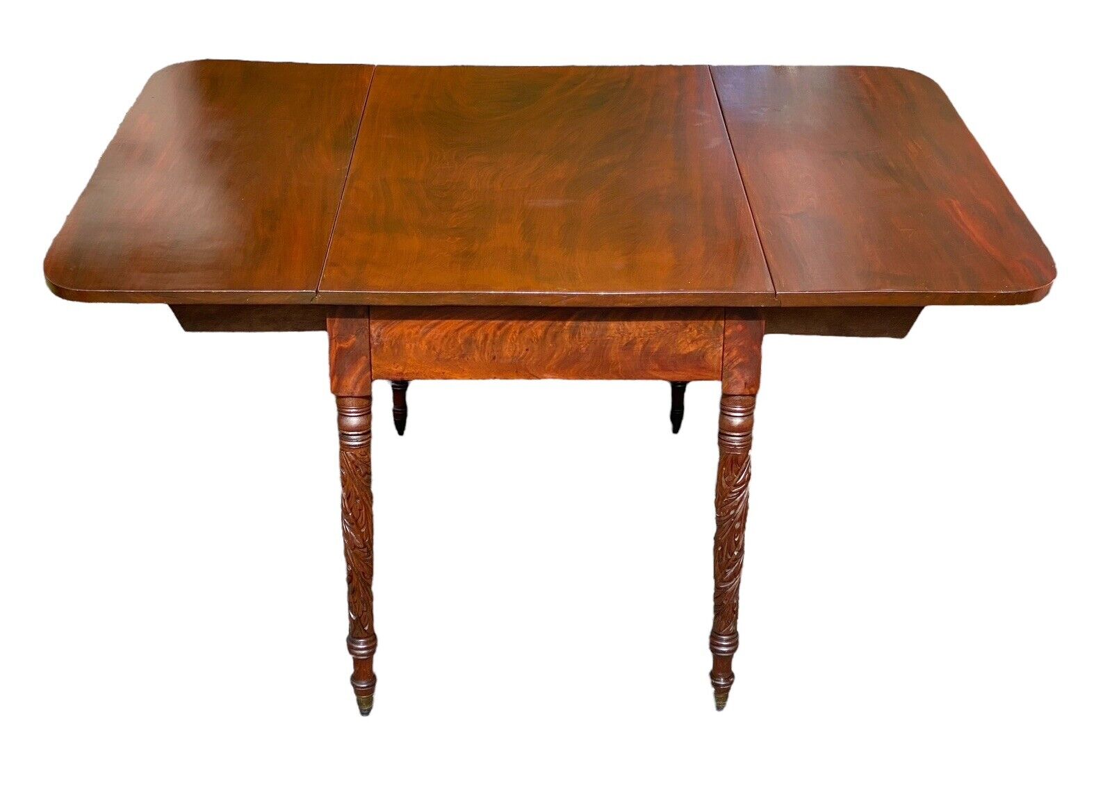 The leaves are supported by double shuttle supports built into the table box and we’d like to point out the triangular block between the supports which was commonplace in many New York City cabinet shops like Duncan Phyfe’s & Michael Allison’s shops. The Acanthus leaf carvings on the legs are crisp and highly detailed. We’d also like to point out that the legs oppose each other adding to the symmetry of the table and congruity of the design. Being from New York City this isn’t too surprising because NYC was home to a number of skilled carvers and cabinet makers during the early 1800’s. In more rural areas you’ll sometimes find all of the leg carvings facing the same way because they weren’t specifically made for the table they were carved in major cities and traded their way into rural cabinet makers hands who didn’t have a skilled carver at their disposal. The legs retain their original brass caps, but the caster wheels have been replaced with rubber stoppers. The table is in fantastic condition with our only notes being minor surface wear and some light scratches on the leaf in our first photo. The tabletop measures 53 1/4” wide x 39 3/4” deep with the leaves locked up. When the leaves are down the table measures 24 1/2” wide x 39 3/4” tall x 28” tall.