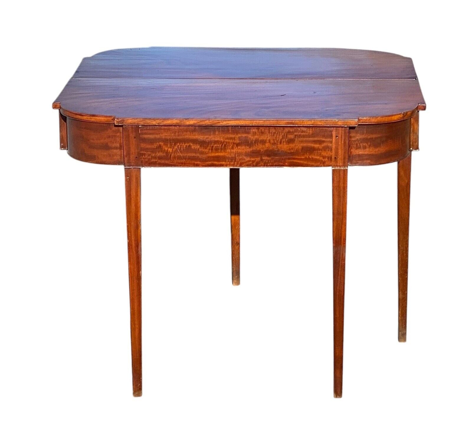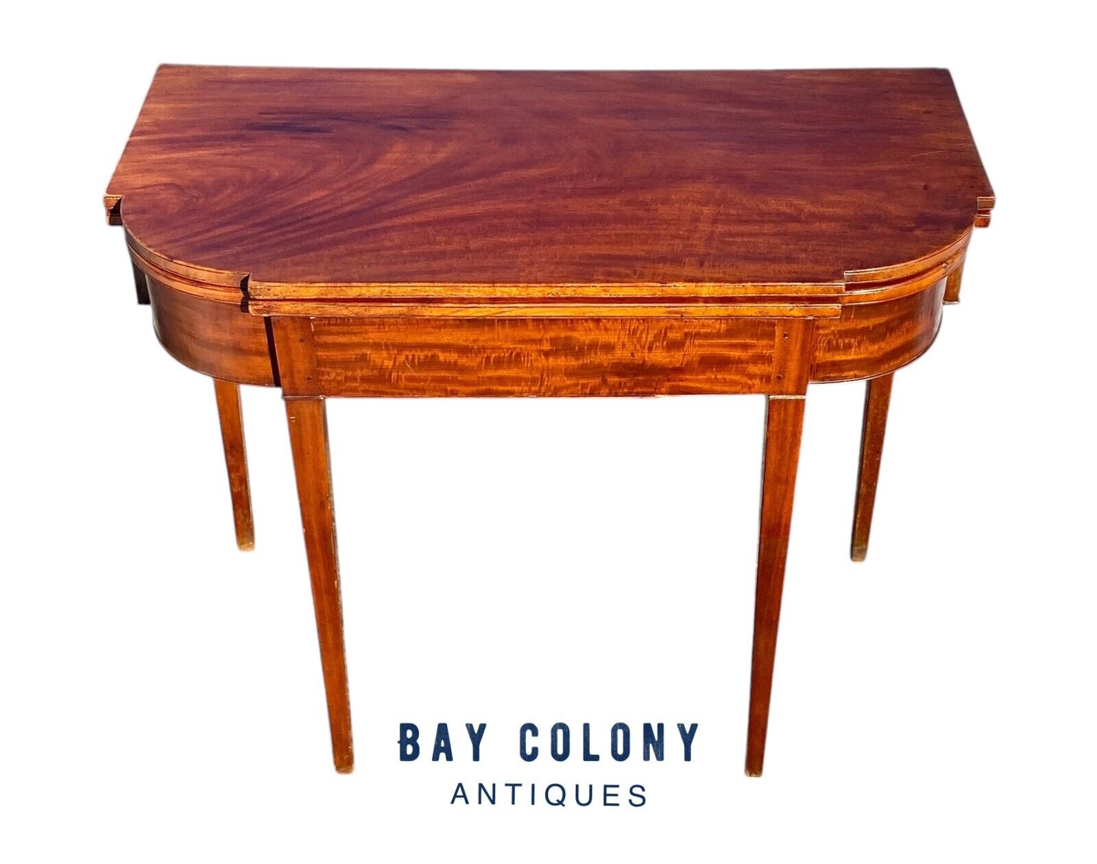 Bay Colony Antiques is proud to offer for sale this wonderful early 19th century antique Massachusetts Mahogany card table / game table. The table has an ovolo top with and an incised line carving along the edge. The top and fold out leaf feature superb cuts of solid Santo Domingan Mahogany with large arches, dark striations, and a nice chatoyancy. Santo Domingan Mahogany was among the most sought-after species of wood for 18th & 19th century cabinet makers. The dark striations were caused by mineral deposits in the soil in which it grew, and its signature sheen is due to the natural oil density of the wood. The back left leg is a gate leg which swivels on finger joints and supports the leaf when in the gaming position. The apron showcases beautiful Mahogany veneers & mirrors the shape of the top. The table is in fantastic condition with our only notes condition notes being minor surface wear and a tiny bit of trim molding at the bottom of the apron missing. The table measures 35” wide x 17 1/4” deep x 28 1/2” tall. When the top is flipped open the table is 34 3/8” deep.
