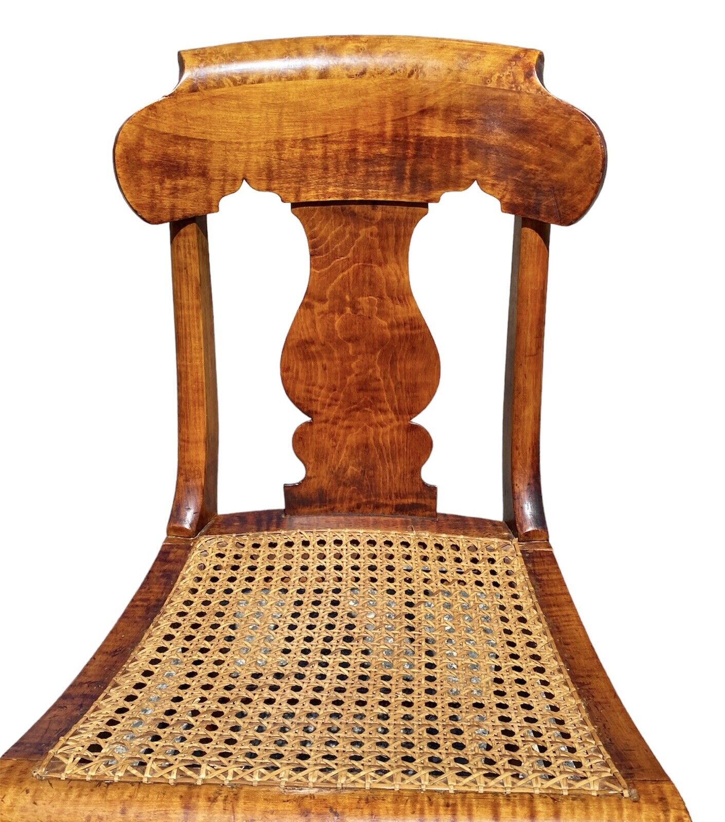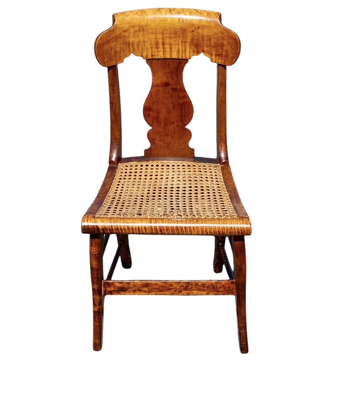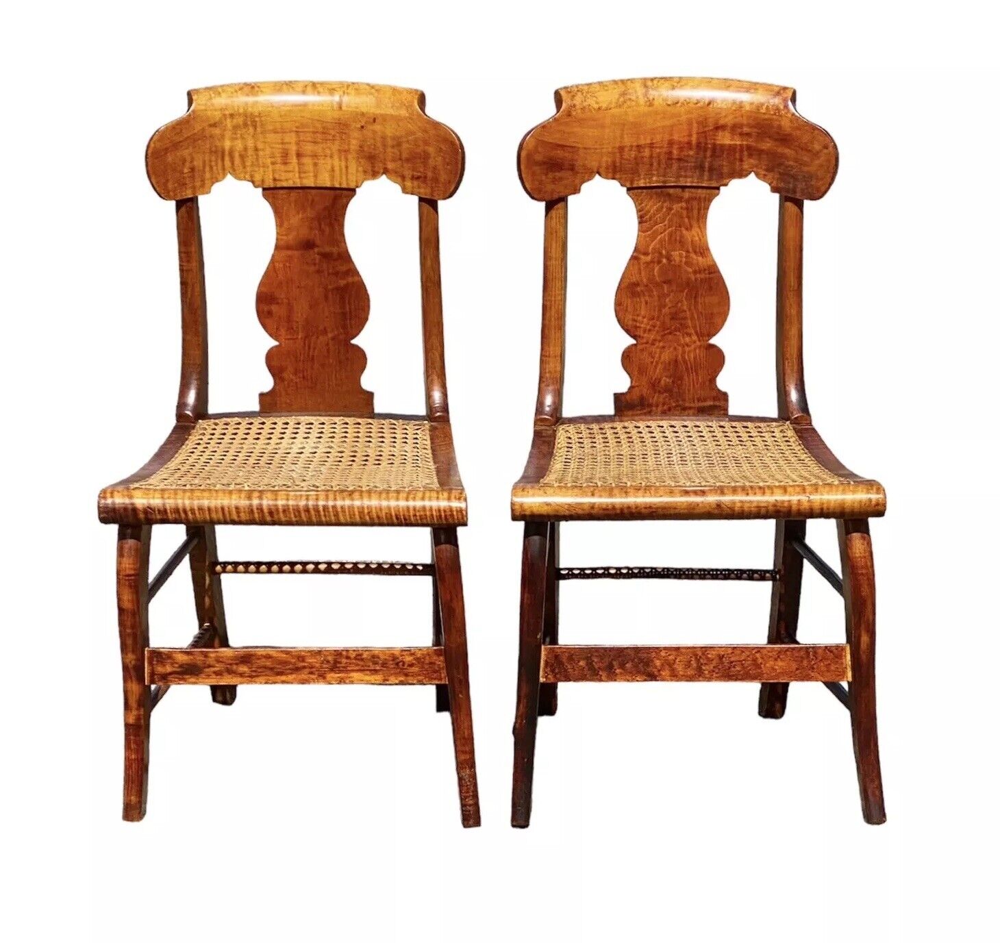 Bay Colony Antiques is pleased to offer for sale this fantastic pair of antique Tiger Maple & Bird’s Eye Maple side chairs. The chairs have solid Tiger Maple seat boxes & the majority of the crests are curly maple with the exception of the rolled tops which are Bird’s Eye Maple. The crests have wonderful gothic cutouts, and the splat is well formed and pretty generously proportioned for smaller scale chairs. The front flat stretchers are also Bird’s Eye Maple, and each chair has an additional 6 round stretchers making the pair nice & sturdy. The round stretchers, front legs, rear stiles, & splats also appear to be Maple. The cane seat on the chair on the right is in perfect condition. The cane seat on the chair on the left has a few cracks in the caning, but nothing that compromises its structural integrity and would require having the seat done over. The seats had no problem supporting my weight at close to 200 pounds, but we still strongly recommend buying cushions or having a couple made to prolong the longevity of the seats by evenly distributing the weight across the cane. The chairs measure 18” wide x 18” deep x 34” tall with a 17” seat height.