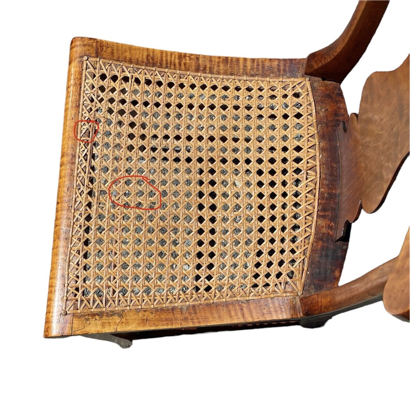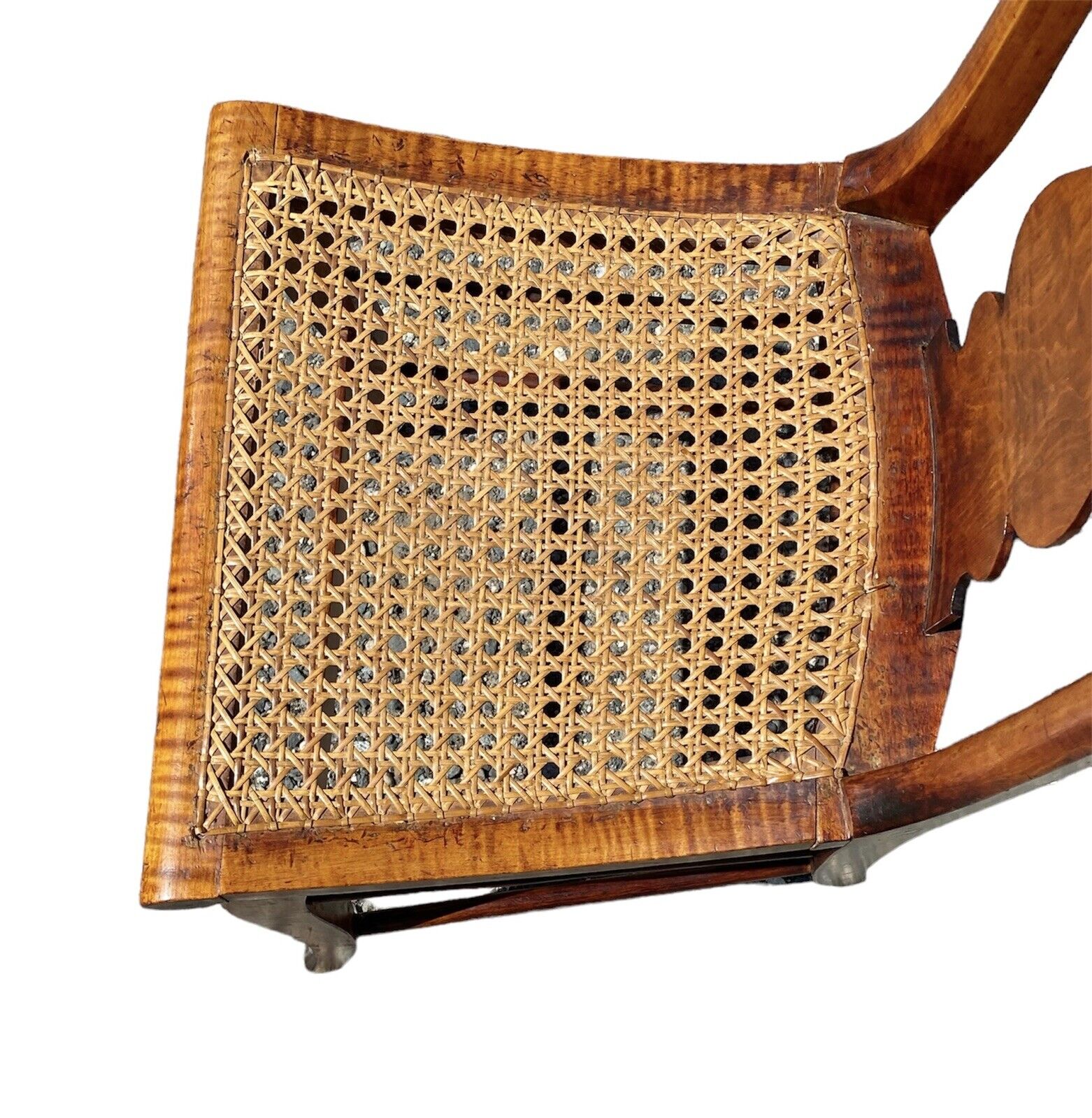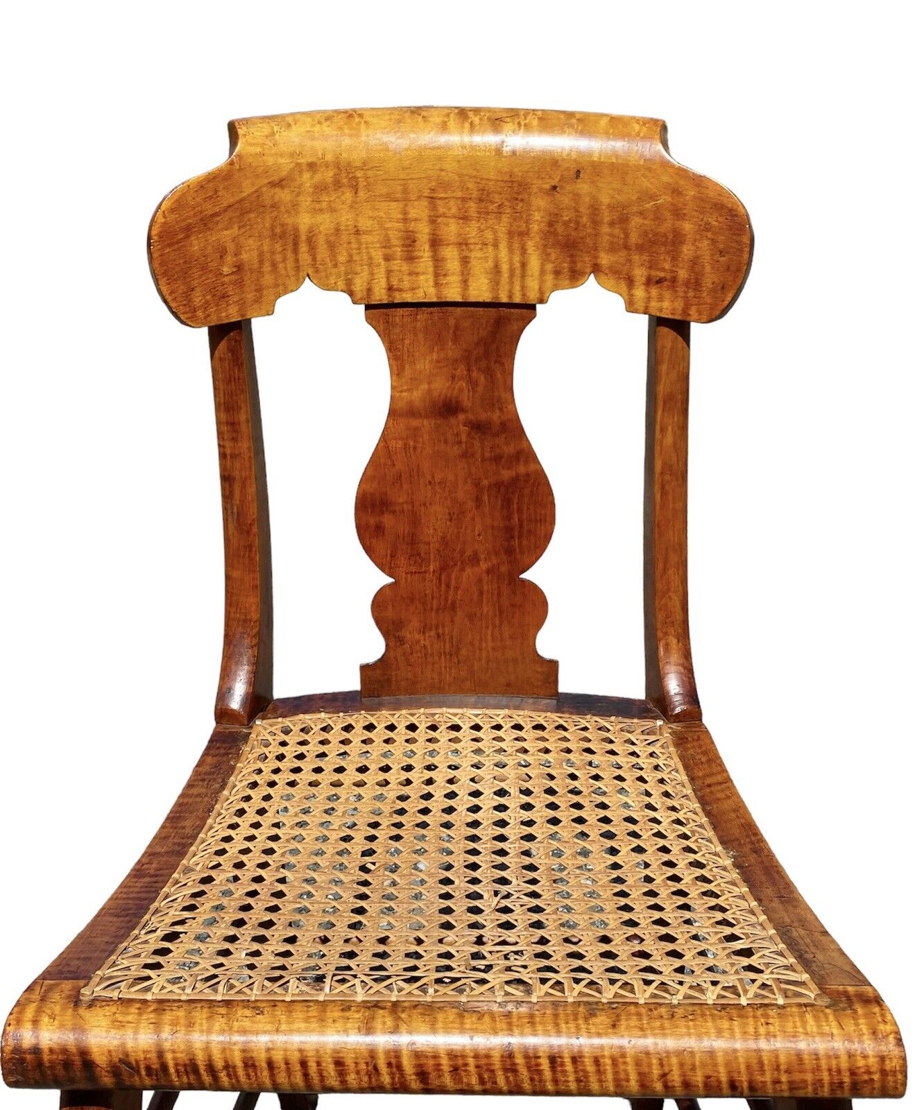 Bay Colony Antiques is pleased to offer for sale this fantastic pair of antique Tiger Maple & Bird’s Eye Maple side chairs. The chairs have solid Tiger Maple seat boxes & the majority of the crests are curly maple with the exception of the rolled tops which are Bird’s Eye Maple. The crests have wonderful gothic cutouts, and the splat is well formed and pretty generously proportioned for smaller scale chairs. The front flat stretchers are also Bird’s Eye Maple, and each chair has an additional 6 round stretchers making the pair nice & sturdy. The round stretchers, front legs, rear stiles, & splats also appear to be Maple. The cane seat on the chair on the right is in perfect condition. The cane seat on the chair on the left has a few cracks in the caning, but nothing that compromises its structural integrity and would require having the seat done over. The seats had no problem supporting my weight at close to 200 pounds, but we still strongly recommend buying cushions or having a couple made to prolong the longevity of the seats by evenly distributing the weight across the cane. The chairs measure 18” wide x 18” deep x 34” tall with a 17” seat height.