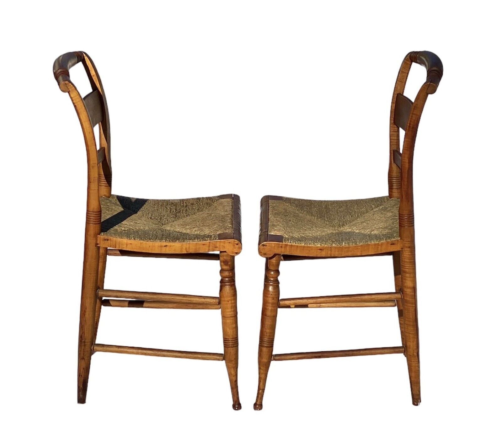 Antique Pair of Tiger Maple Side Chairs with Rush Seats