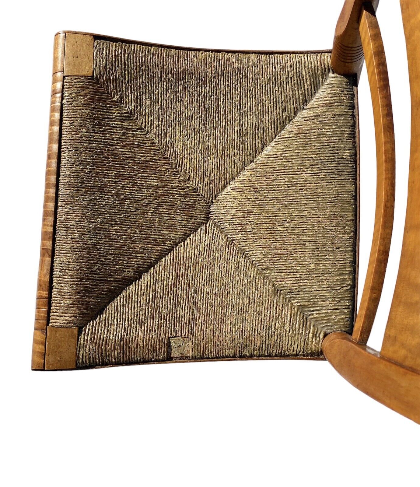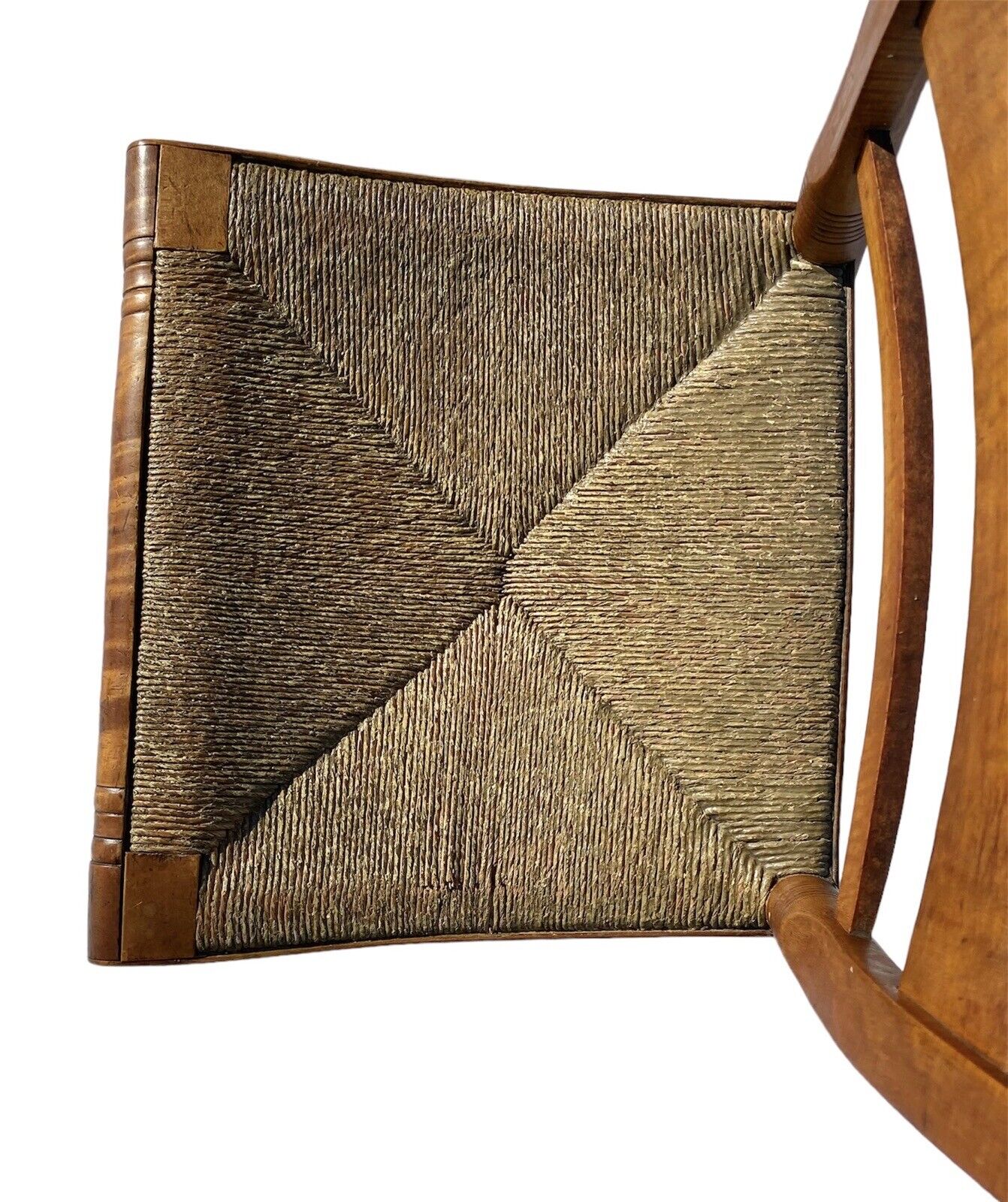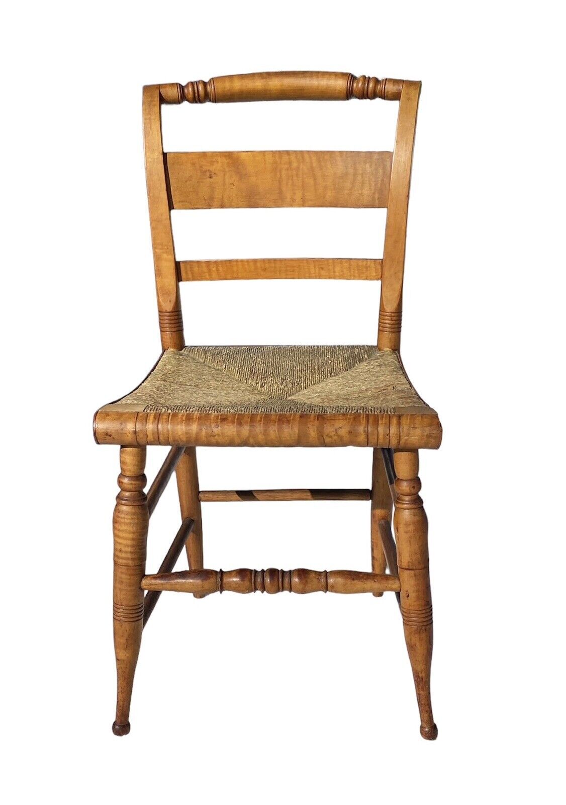 We’re always in the market for quality Antique Tiger Maple furniture, especially pairs of chairs. The legs have a ton of character with a ball & ringlet turning at the top, and we wanted to point out an easy to miss design choice which is the slight taper about 1/3 of the way down on the leg. The diameter tapers in ever so slightly with a purposeful shoulder and is commonly referred to as a bell turning. There’s a series of tight ringlets right above the splayed feet and the legs terminate with ball feet. The chairs are in very good condition with our only notes being minor surface wear, a slight color variation between the two, & a small 1" x 1" square of rush missing on one chair. The rush seats appear to be original and were sealed with either a hide glue or shellac to extend their longevity. We pass up on a lot of chairs that are too fragile to sit on, but even with the small square missing, the seats are structurally sound. A custom pair of cushions would be a relatively inexpensive solution to hiding the small rush loss without altering the chairs. The chairs measure 16 1/2” wide x 18 1/4” deep x 33” tall with an 18” seat height.