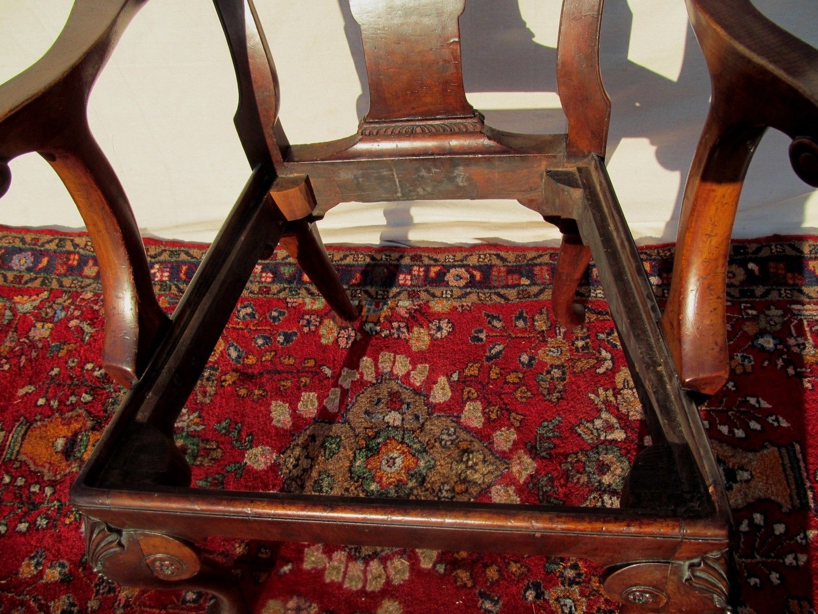 With our highest possible compliments we are delighted to offer you the very best Queen Anne 19th Century carved arm chair we have ever had the pleasure of handling. First off, this is a remarkable Centennial copy of the early 18th Century, Queen Anne masterpiece. There are only perhaps two or three known examples of the period version of this chair in existence. We just brought in a major collection of the very finest period Queen Anne American furniture and decorative art. We are starting the offerings with this remarkable piece. We are without explanation for this chair. We never knew there was a 19th Century, Centennial version of this American treasure. The form on this signed chair made by "Morrow" is remarkable. The heart formed chamfered back splat in burled walnut is simply a wonder. The form of the back rail crest of the chair is equally as fascinating. It has carved rolled arms, extravagantly fan carved cabriole knees, fully formed legs with four carved rosettes, superbly executed rear legs all flowing into stunning slipper carved feet. This chair is structurally wonderful having been professionally maintained with an important American furniture collection. The only flaw is a burled veneer chip of no significance. The two or three period copies of these chairs are all in important American furniture collections of the Peabody Essex, MFA Boston and the Winterthur. They all realized tens of thousands of dollars at sale. This is your chance to own a Centennial copy of the rarest Queen Anne arm chair there is for pennies against the cost of its period cousin. It is accurate in all respects. It is 24" wide from arm to arm, 22" in seat width, 17 1/2" in seat depth, 41" tall overall and has an 18" high seat. We certainly have a lot more expensive Queen Anne period chairs to offer you, but this one has been the most exciting to sell.