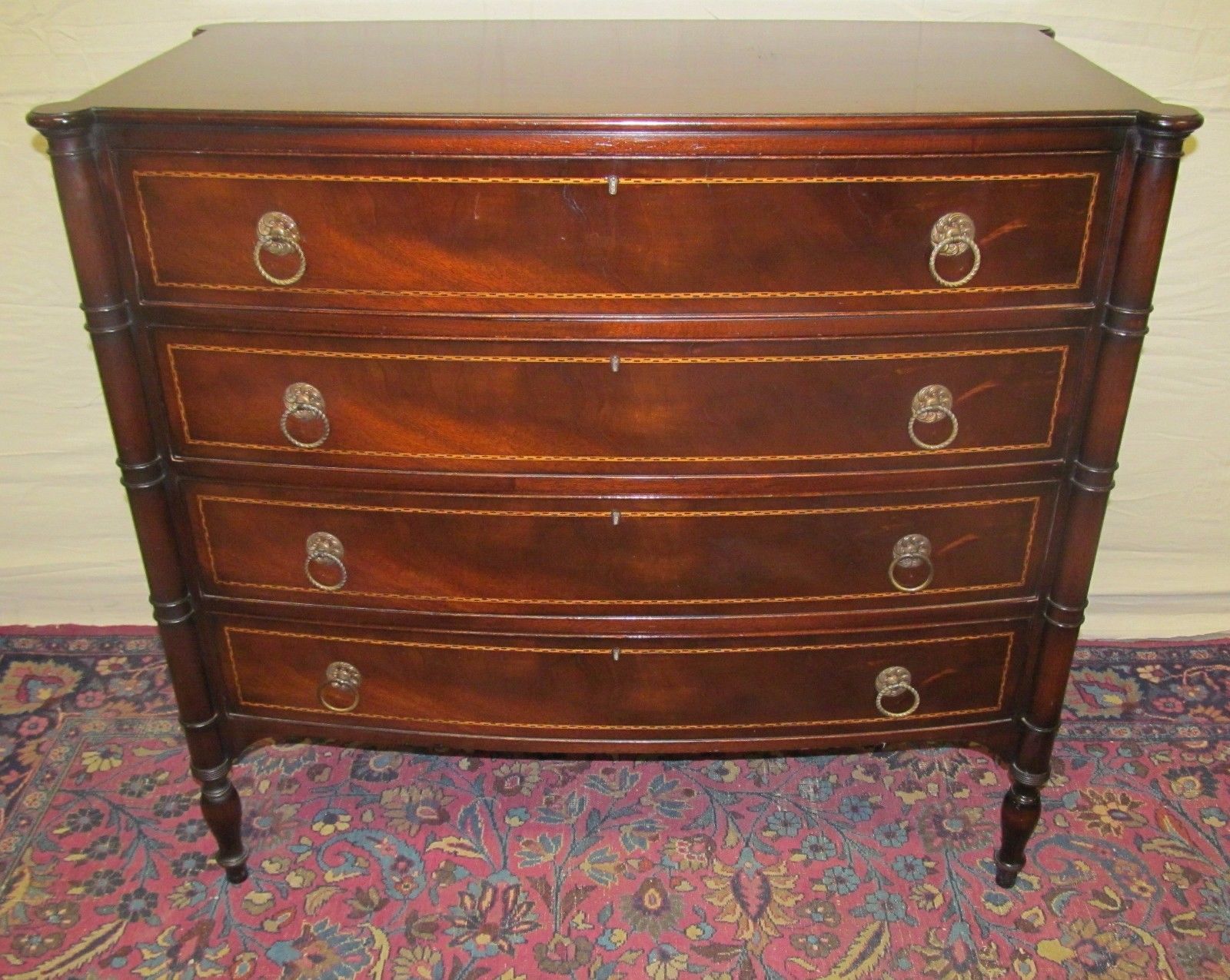 We are honored to offer you this outstanding Circa 1920 custom made solid mahogany Salem chest with checkered inlays and bow front format attributed to the Mayflower Furniture Company of Boston. This is an estate fresh piece from an impeccably clean home furnished exclusively with the finest Boston custom furniture from the early 20th century. It is defined by turret cookie corners, bamboo carved columns and ring turned legs. Its secondary panels are all mahogany and the drawers possess blind dovetail sets attesting to its phenomenal quality. It has four drawers with highly figured facings and excellent original brasses with rosettes and bails. We highly regard our custom furniture from Boston which stands alone as America's very best. Without close second this is one of the best Salem chests we have had the pleasure of offering in several years now. It is 42" long, 22" wide and 38 1/2" tall.