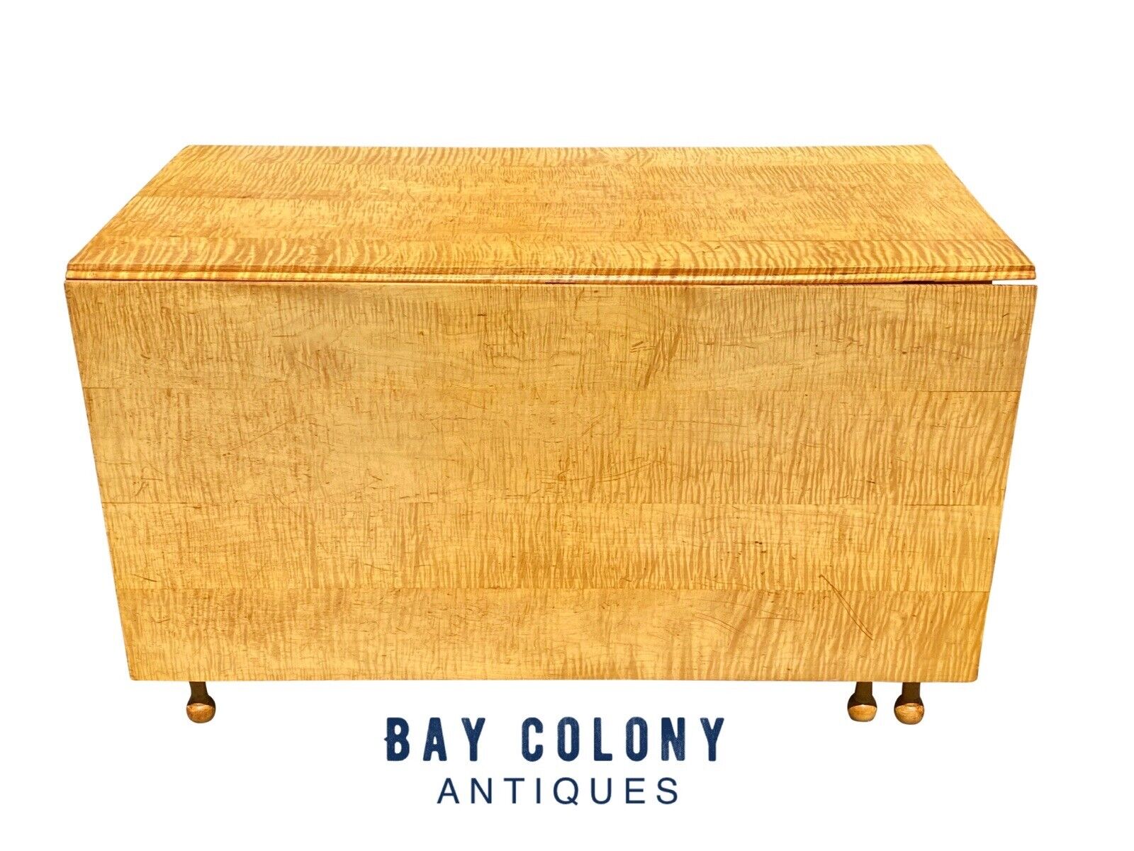 With our absolute highest compliments Bay Colony Antiques takes the utmost pleasure in presenting this spectacular tiger maple dropleaf dining table. We had the privilege of recently purchasing a collection of solid tiger maple furniture from a west coast family who received a household of incredible custom made furnishings from their father. The gentleman was a master craftsman quite familiar with early American furniture and he build each piece as a labor of love for his children forty years ago. We feel fortunate to have been able to meet this family and purchase the exceptional collection which they owned as they had no further need for the furniture after deciding to downsize their household. The dining table has a commanding presence and is boldly figured with the choicest solid tiger maple hardwood available at the time it was built. Two large dropleaf ends are hinged to the table and fold upward when supported by the robust swinging gatelegs from underneath. This table was constructed to larger than normal size proportions to provide continued use to their growing family. Typically federal style dropleaf tables are built to smaller size specifications which makes this particular table one of the finest and rarest to be brought to market anywhere. When the leaves are down the table measures 24 1/2" wide x 48" deep x 29" tall. When the leaves are locked up the tabletop measures an impressive 70 1/4" wide.