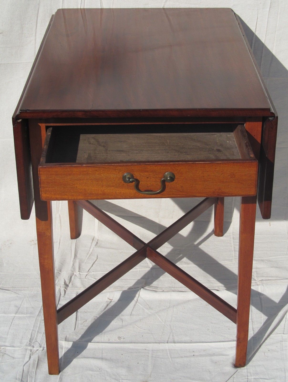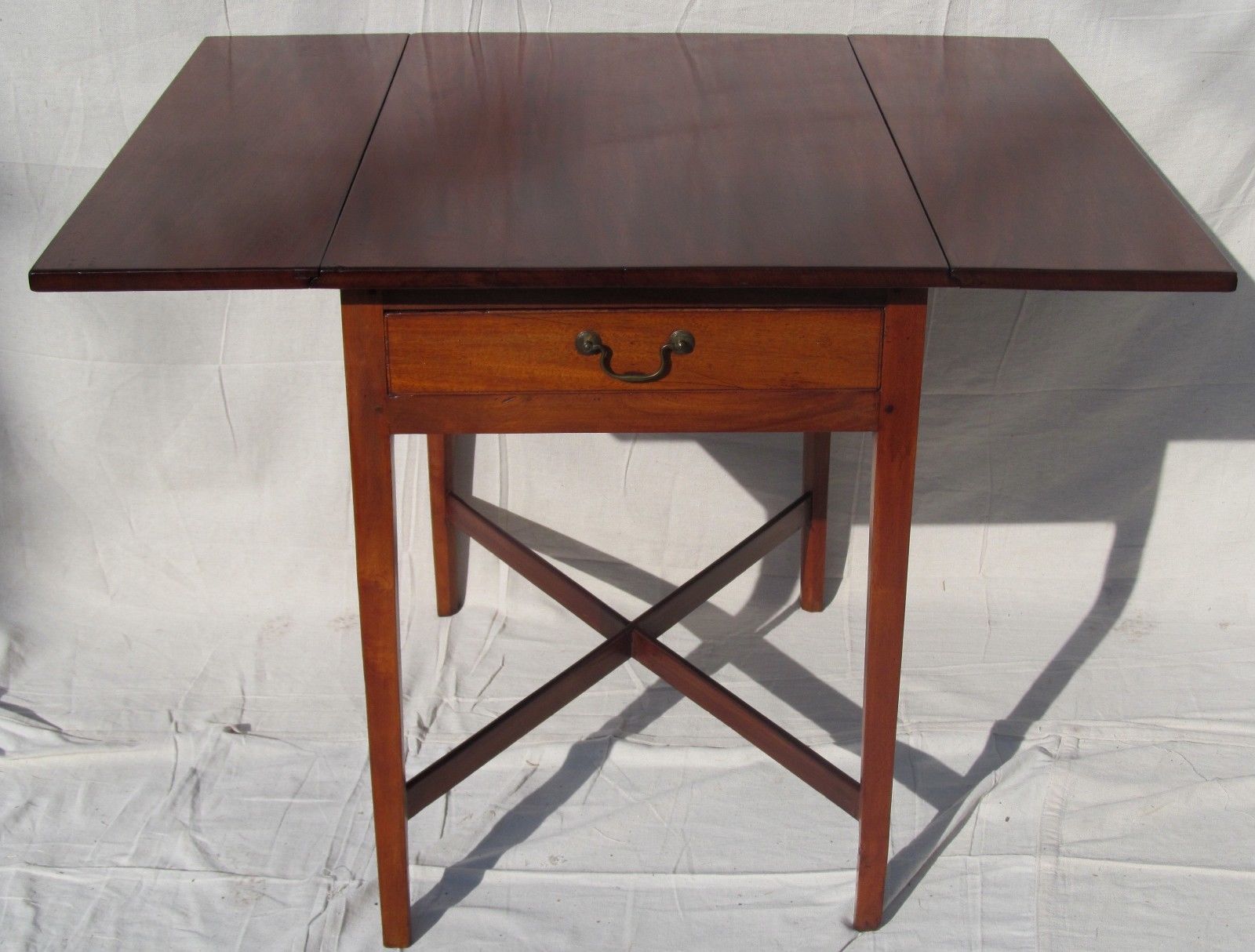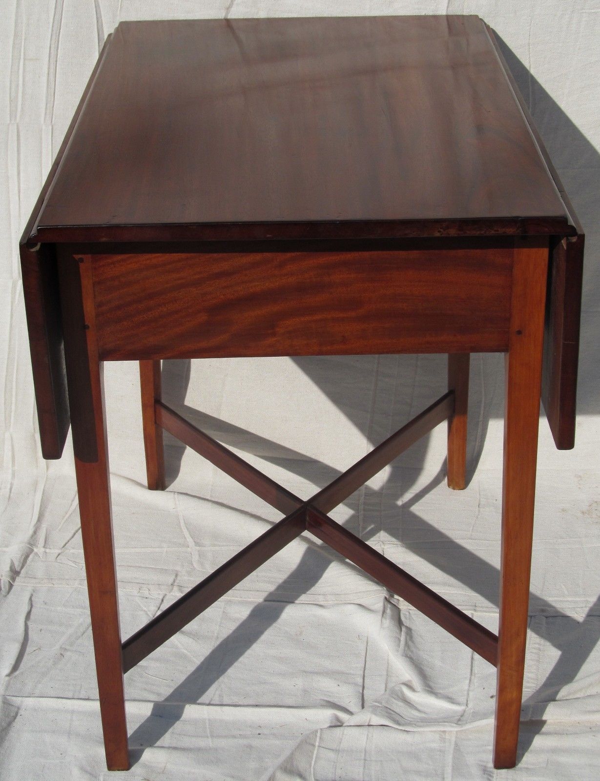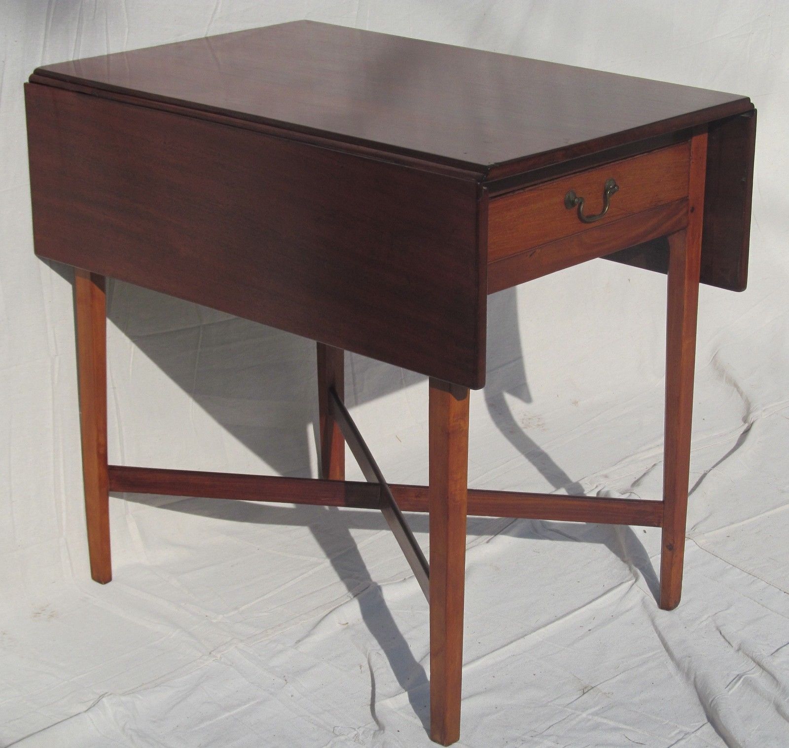 With our compliments we are pleased to offer you this fine 18th century New England Chippendale Pembroke table with a cross X stretcher in an amber stained mahogany frame and a darker stained solid figured mahogany single plank top and drop leafs. This is a superb specimen in amazing condition with a dovetailed table box and pegged joinery. These particular pieces are hard to place a regionalism on as to where exactly they were crafted in the 18th century New England. We believe it to be from the South Shore of Massachusetts. It has original brasses and pure structural integrity with a molded drawer face. This is an extremely choice period Chippendale pembroke table. The only thing we can see is a previous owner placed some picture hanging wires to pull out its leaves support braces that telescope out of the table's frame. We'll replace these with some more attractive pulls befitting this superior piece. It is 31" long, 21" wide, 38 1/2" with its leaves locked up and its 28 1/4" tall.