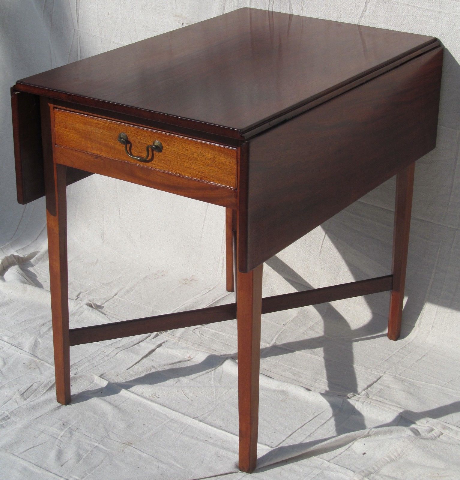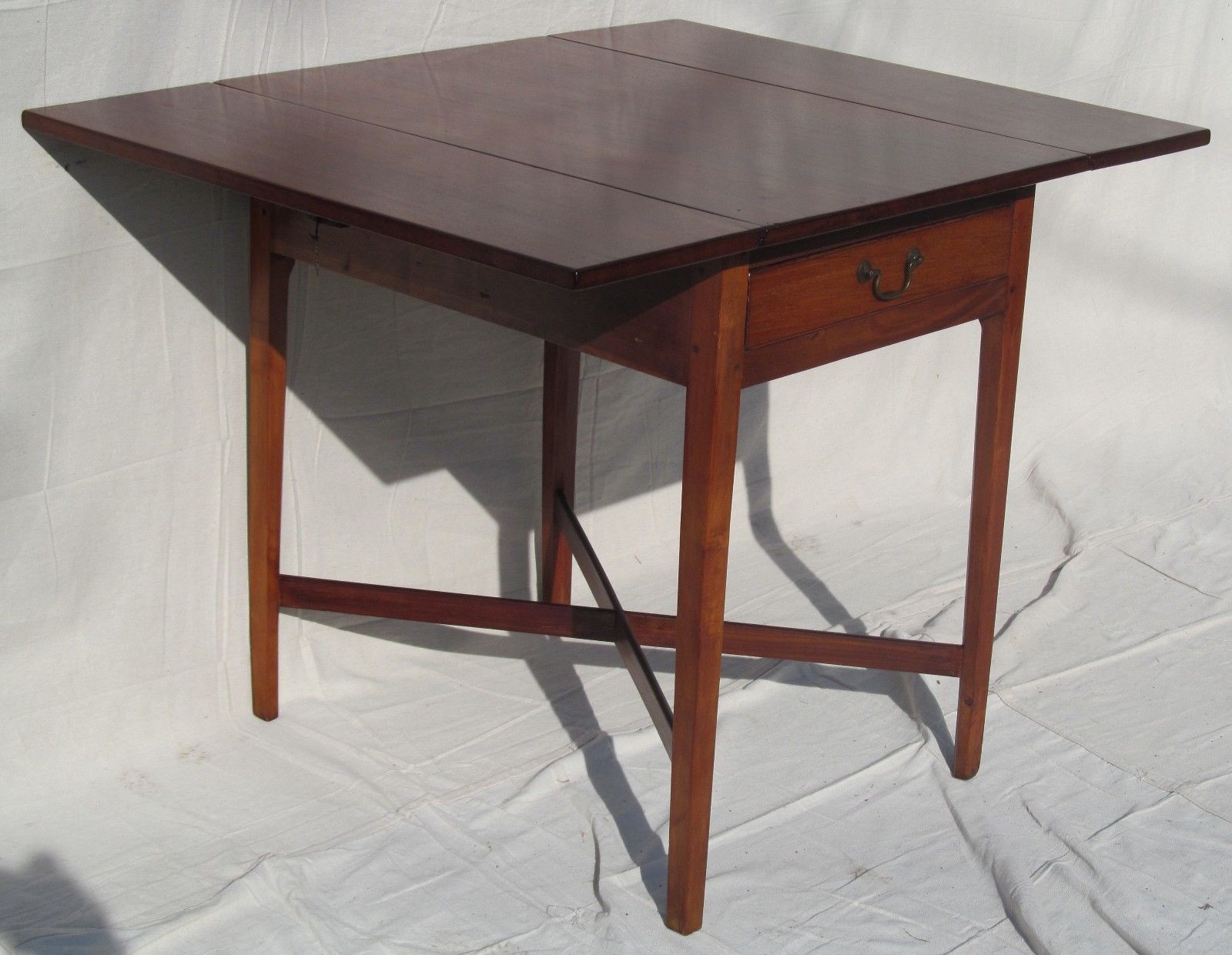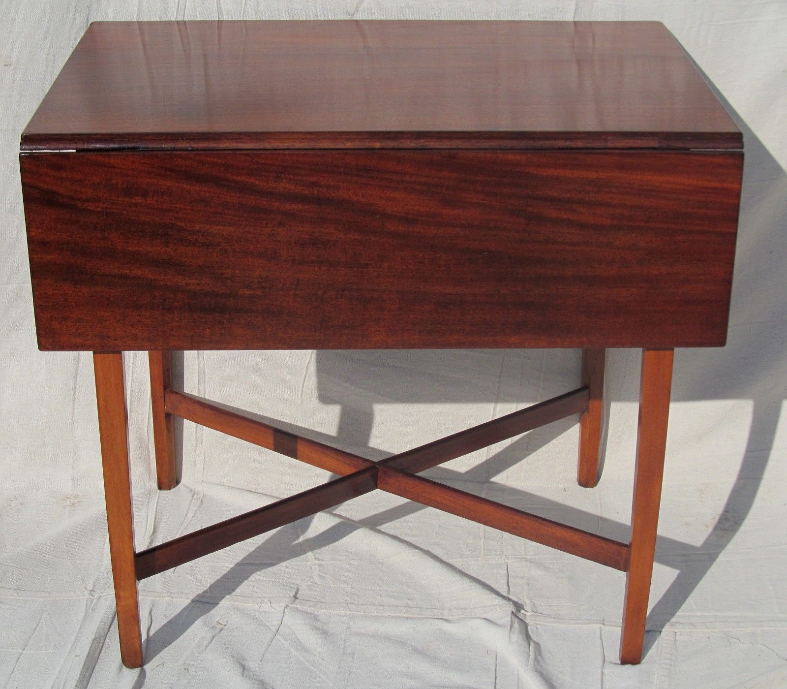 With our compliments we are pleased to offer you this fine 18th century New England Chippendale Pembroke table with a cross X stretcher in an amber stained mahogany frame and a darker stained solid figured mahogany single plank top and drop leafs. This is a superb specimen in amazing condition with a dovetailed table box and pegged joinery. These particular pieces are hard to place a regionalism on as to where exactly they were crafted in the 18th century New England. We believe it to be from the South Shore of Massachusetts. It has original brasses and pure structural integrity with a molded drawer face. This is an extremely choice period Chippendale pembroke table. The only thing we can see is a previous owner placed some picture hanging wires to pull out its leaves support braces that telescope out of the table's frame. We'll replace these with some more attractive pulls befitting this superior piece. It is 31" long, 21" wide, 38 1/2" with its leaves locked up and its 28 1/4" tall.