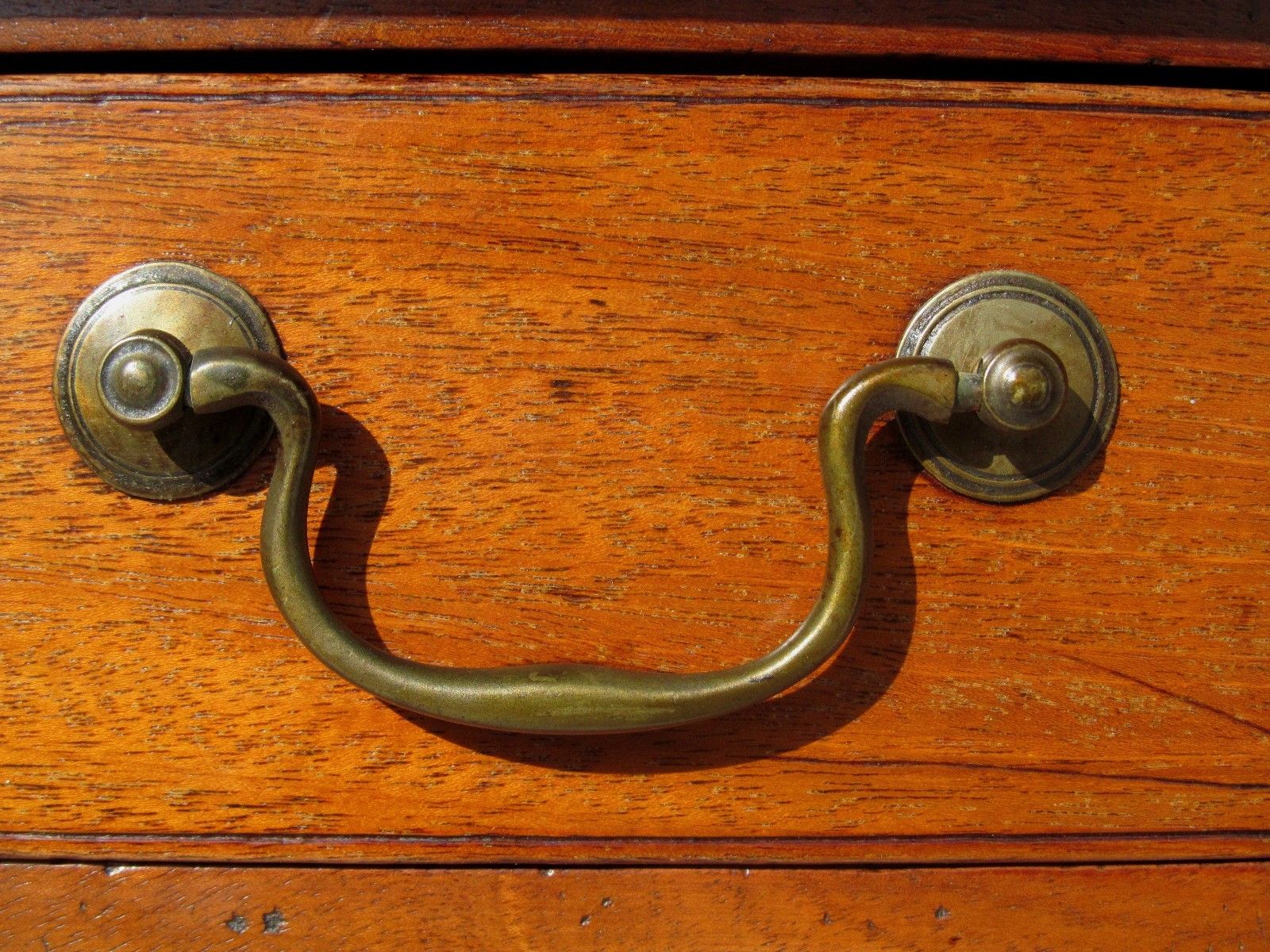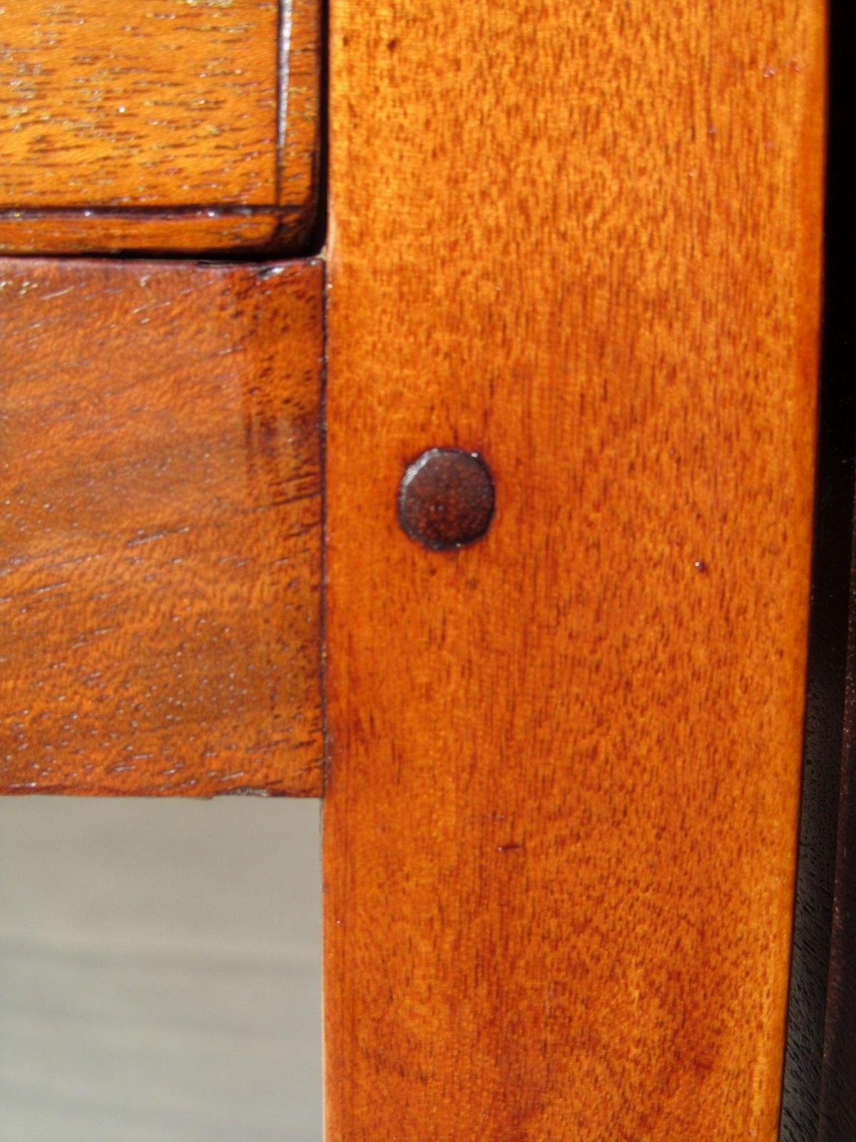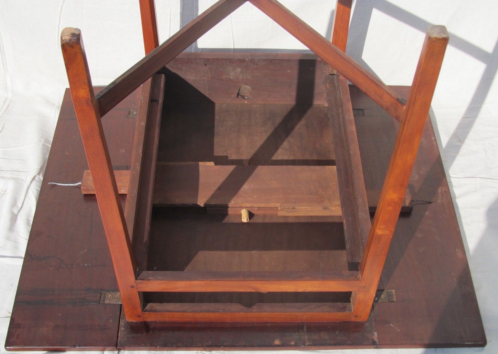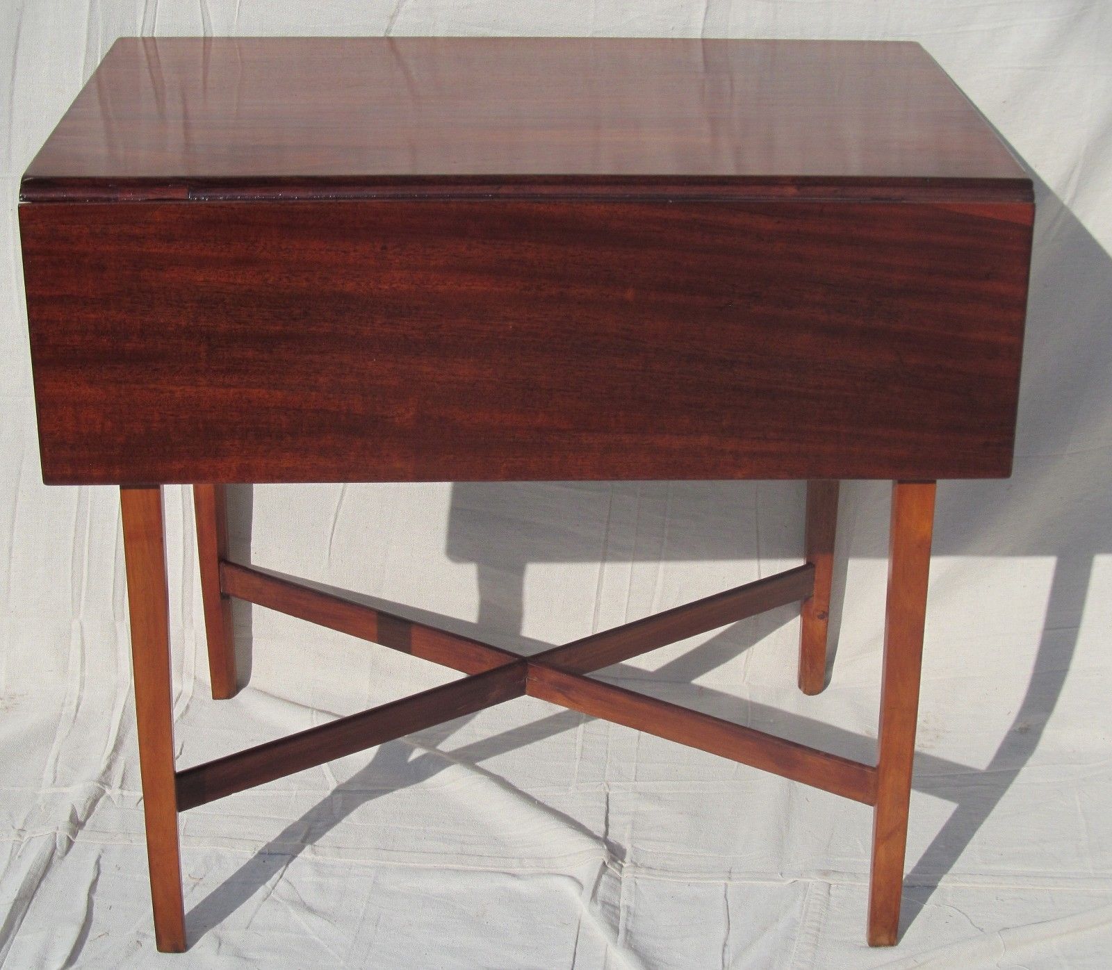 With our compliments we are pleased to offer you this fine 18th century New England Chippendale Pembroke table with a cross X stretcher in an amber stained mahogany frame and a darker stained solid figured mahogany single plank top and drop leafs. This is a superb specimen in amazing condition with a dovetailed table box and pegged joinery. These particular pieces are hard to place a regionalism on as to where exactly they were crafted in the 18th century New England. We believe it to be from the South Shore of Massachusetts. It has original brasses and pure structural integrity with a molded drawer face. This is an extremely choice period Chippendale pembroke table. The only thing we can see is a previous owner placed some picture hanging wires to pull out its leaves support braces that telescope out of the table's frame. We'll replace these with some more attractive pulls befitting this superior piece. It is 31" long, 21" wide, 38 1/2" with its leaves locked up and its 28 1/4" tall.