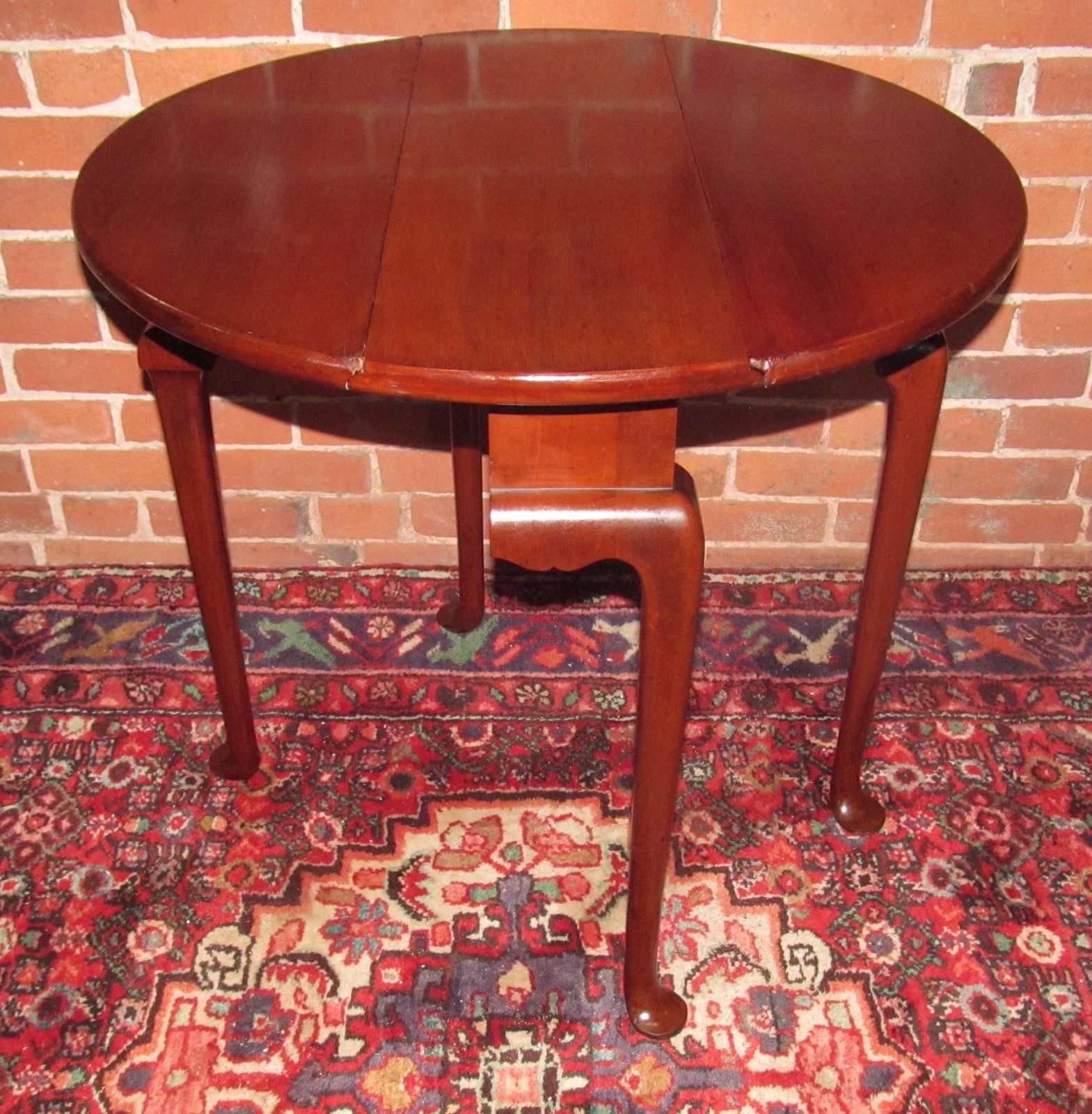 We are delighted to offer you this wonderfully crafted and very high quality Queen Anne styled solid Cherry, Tea Table. We purchased this out of an estate where all the furniture was Eldred Wheeler and DR Dimes, but we can not find a makers mark on this little gem. It's priced accordingly. It has finely formed drop-leaves with tall gracefully carved gatelegs that terminate into pad feet. It measures 27" long, 10" wide, 26" tall and 27 1/2" when fully opened.
