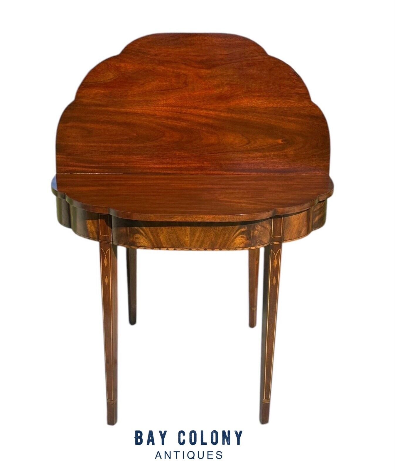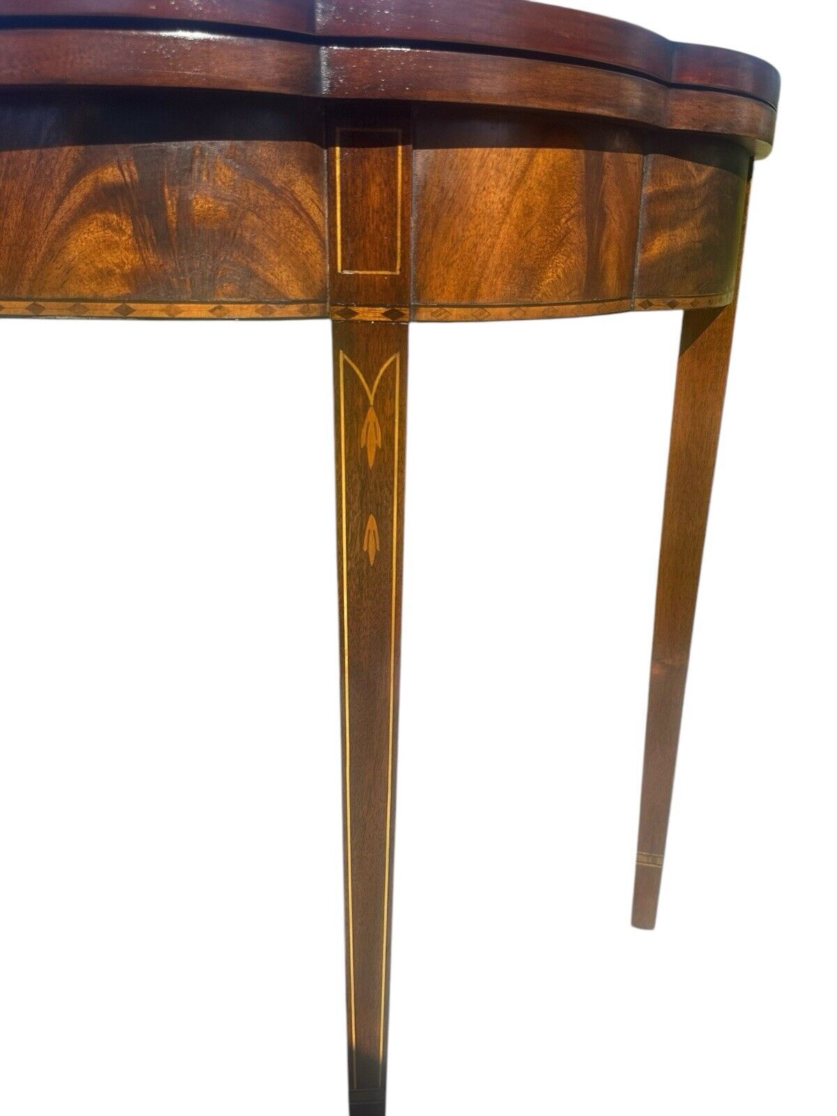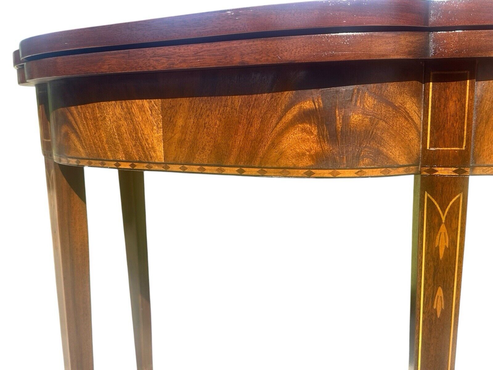 The table is constructed from the finest grade of Honduran mahogany available at the time of production. The game table features a folding top that is supported by a rear leg which swings out 90 degrees. The top is shaped and curved along with the apron of the table which displays a bold crotched mahogany grain as well as rectangular panel inlays on either end. The apron also has a wonderful band of diamond inlay spanning the entire length of the table. The table has four tapered legs which are inlaid with bellflowers and string patterns. This game table measures 36" wide x 18" deep x 30" tall and expands to 36" deep when the top is folded outward.