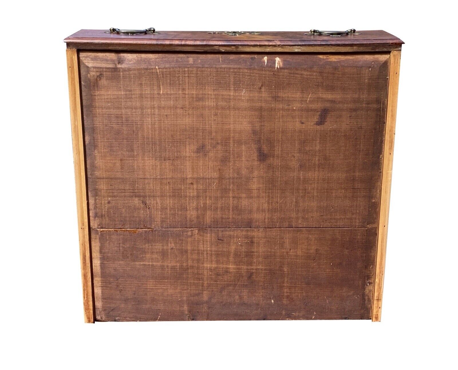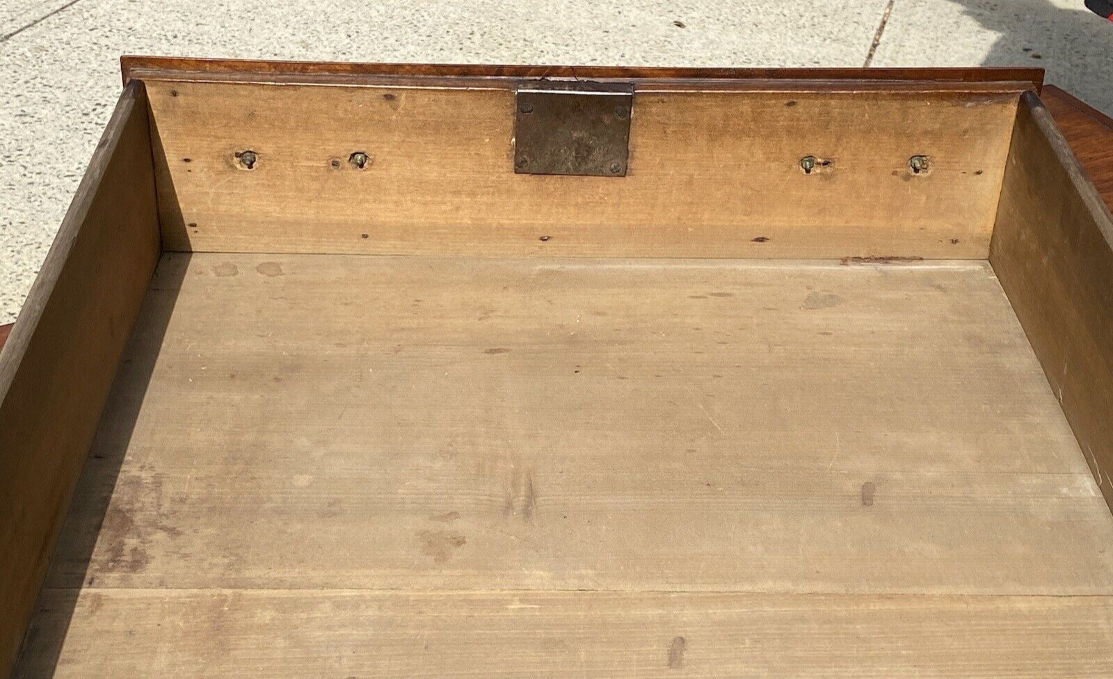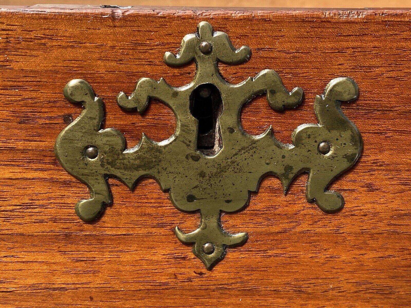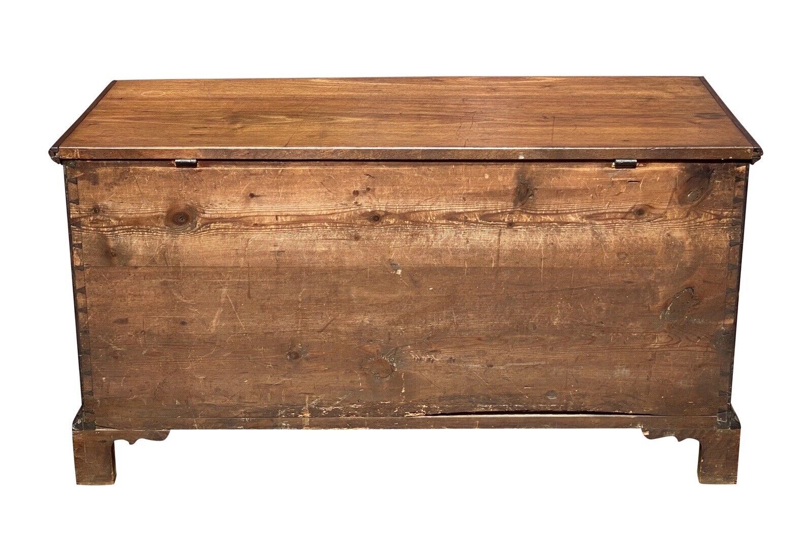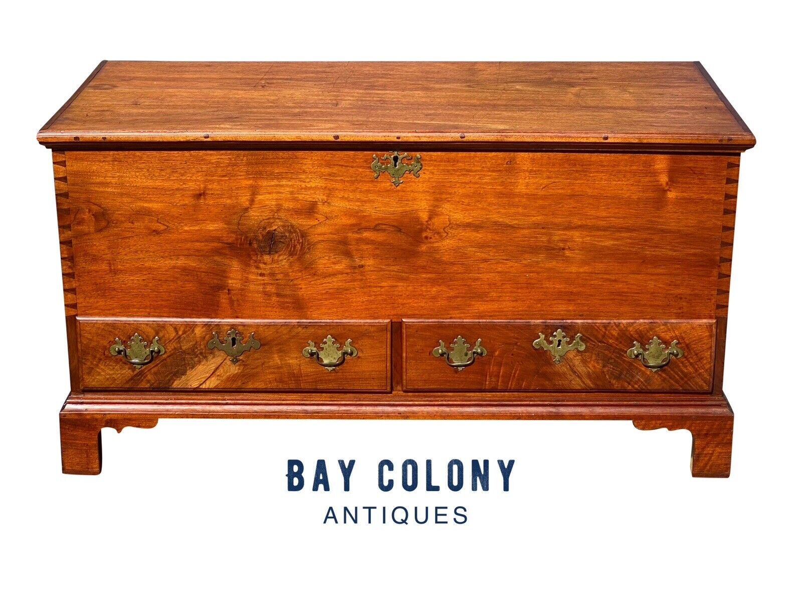 With our absolute highest compliments Bay Colony Antiques takes the utmost pleasure in offering perhaps one of the finest Queen Anne blanket chests that we have ever had the privilege of owning. Our passion for important Queen Anne period furniture from Pennsylvania and the mid-atlantic states comes from decades of wonderful experiences dealing with passionate collectors of the most significant regional antiques associated with their respective communities. We routinely furnish homes throughout Pennsylvania and the neighboring states and always try to maintain a collection of appropriate 18th century household furniture and antique objects so that even the most discerning of collectors may look through our catalogue and enjoy what they see. In our studies of the market and localized histories of Pennsylvania we have come to love anything associated with the area and we see ourselves as equal parts dealers and collectors of this treasured history. This Pennsylvania walnut Queen Anne blanket chest is perhaps one of the finest that we have ever owned. In the past we have owned significant chests associated with Adams County, Berks County, Chester County, York County just to name several historical counties of Pennsylvania and we fondly look at this blanket chest as one of the finest to ever come into our possession. The entire piece is constructed from a premium grade of walnut which is very indicative of case furniture built in the eastern Pennsylvania region with characteristics of grain quality and a warmth brought on from a rich patina that other regional chests simply do not possess. One of the strongest attributes of case furniture manufactured in this region of Pennsylvania is what we refer to as "over engineered" case construction which means that not only did the cabinet maker use masterful hand cut joinery techniques to construct the cabinet but the individual went to the extreme of intricately dovetailing the entire case with large pronounced and exuberant dovetails while also employing brilliant mortise and tenon joints to the molded edges of the walnut top which have kept this chest straight and true throughout the centuries. Proudly formed pegs can be found all around the perimeter of the top which add rich character to this masterfully joined chest. The top is fastened by two exceptional iron strap hinges which when shaped in this fashion are referred to as "rat-tail" style based on the shape and design pattern. The interior reveals a generous storage cavity and an additional candle till which has a hinged top that allows the owner to prop open the top of the entire chest by allowing the walnut top to lean onto the candle till top for support. We note a few professional "butterfly keys" or "dutchmen" as they were once referred to were installed underneath the top which counteracts the seasonal changes in humidity which can cause an antique to warp or develop age related splits. This is what we consider maintenance and it is far more beneficial for the prolonged life of this chest to have them there as they will prevent any chance of humidity related changes from occurring for the indefinite future. Below the storage cavity are two well functioning dovetailed drawers that are each fitted with original hand cut stylized Chippendale bat-wing patterned brasses which hardly ever survive. The chest is supported on four finely scrolled bracket feet and the underside and back of the blanket chest demonstrate considerable age with the secondary wood developing beautiful oxidation and character throughout this chests considerable lifespan. We have no doubt that this exceptional antique will one day be cherished in a deserving home and until then it will remain our privilege to own and enjoy this masterpiece of early American history. The chest measures 49 1/4" wide x 23 1/4" deep x 26 1/4" tall. The inner cavity measures 45 1/2" wide x 20" deep x 12 1/2" tall, and when the lid is fully open the height is 48" tall.