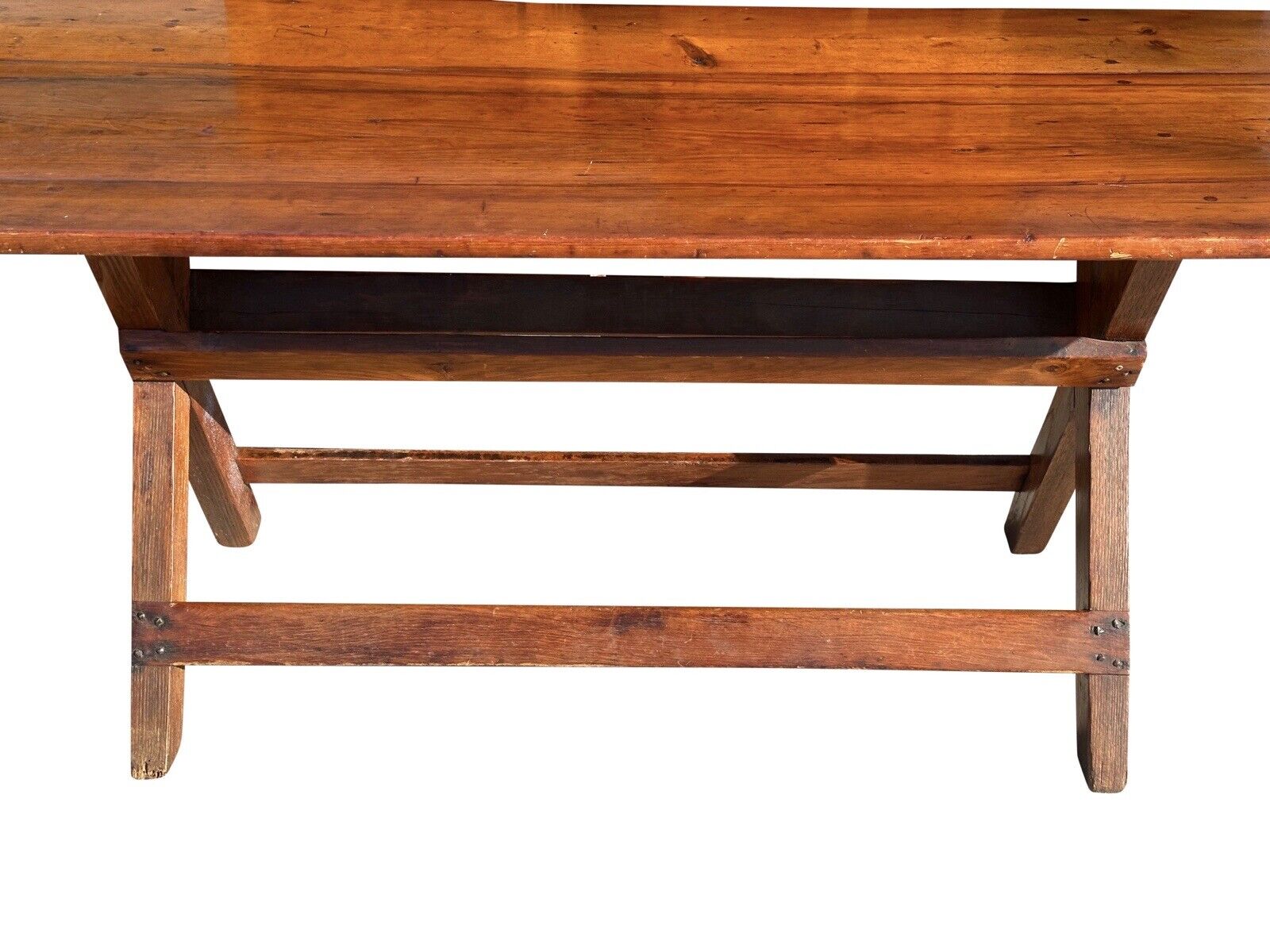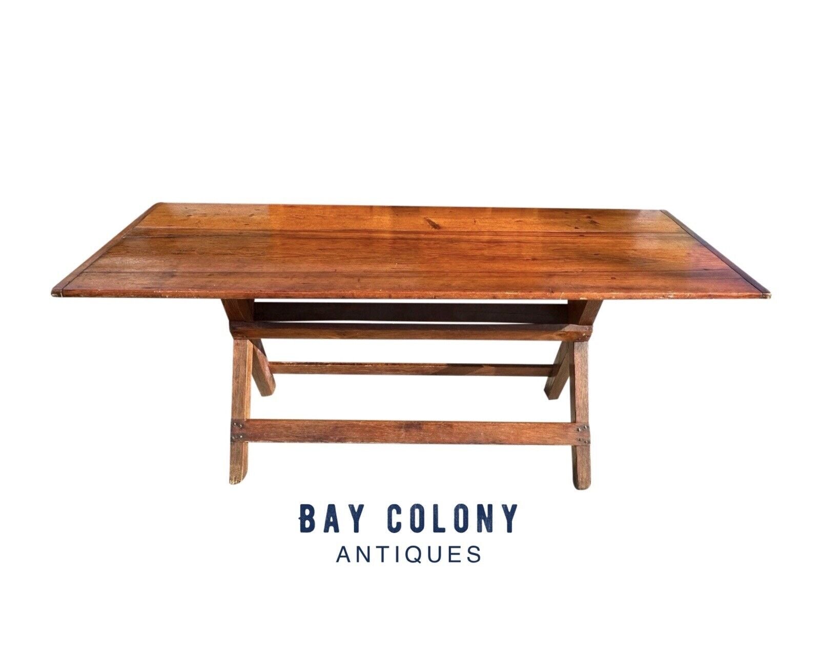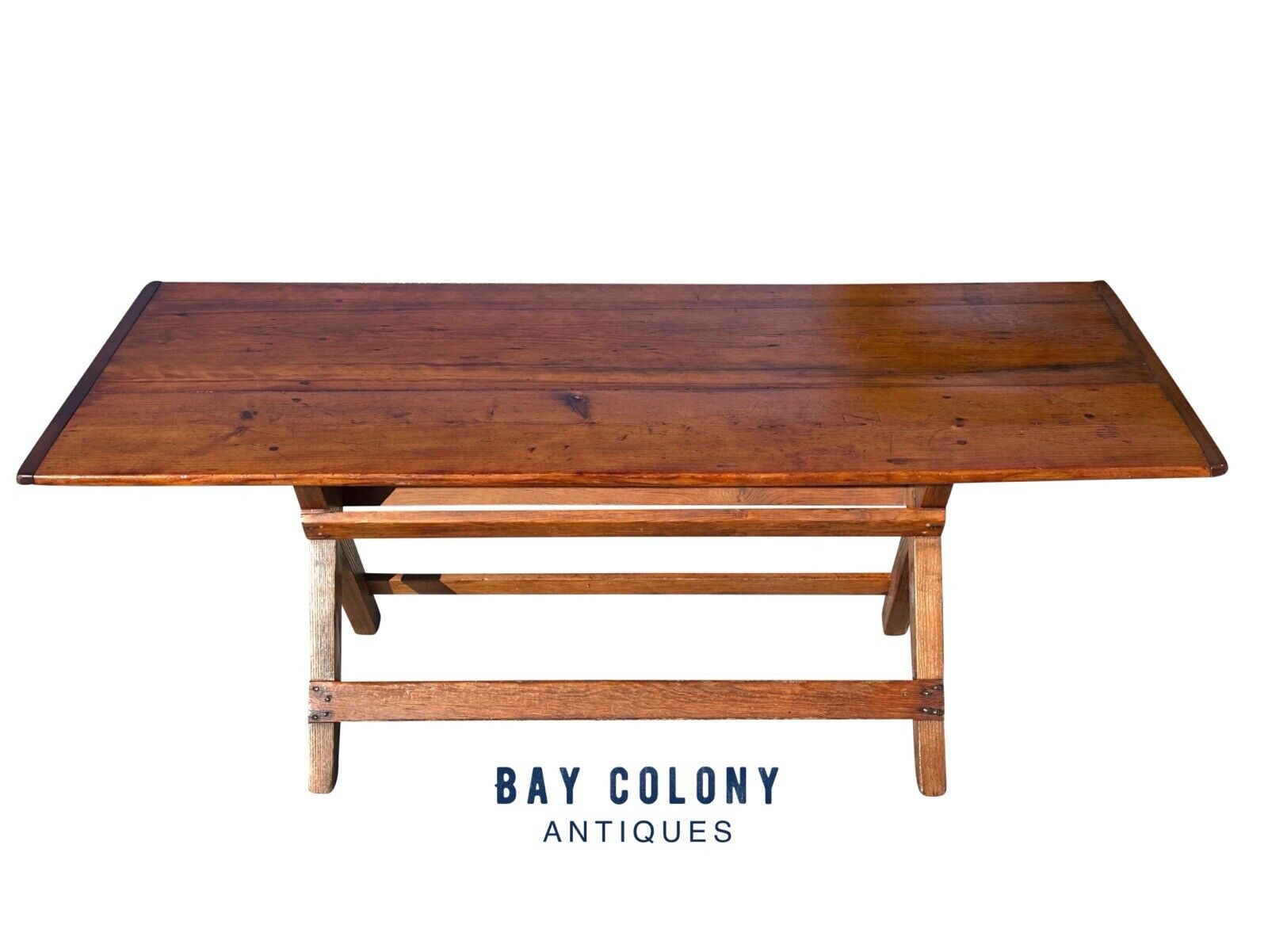 With our highest compliments Bay Colony Antiques takes the utmost pleasure in offering this remarkable late 19th century antique sawbuck dining table. We are constantly in pursuit of high quality primitive form dining tables for our clients with rustic interiors across the country and with respect to our current offering we feel that few if any examples currently on the market can contend with this table. Sawbuck tables are considered among the rarest forms of antique dining tables from rural settings and generally they do not exceed four feet in length as most early homes lack an abundance of interior space. Antique primitive tables designed to seat a large family gathering are regarded as farm tables in the five to six foot range or harvest tables as they approach six to eight feet in length. The largest antique harvest tables command a premium in the antiques market with the average price generally hovering around $5,000. Most of what we encounter today are contemporary reproductions made with antique floor boards for the tops and sit on turned legs. The true antique tables built for antique farmhouses were quite often left outside in barns for years and disregarded to the point of being beyond restoration. The understated brilliance of the sawbuck table form is the "X" shape stretcher which transfers stress through the table towards the ground and along with the continual stretcher spanning across the table length hardly any structural maintenance is ever required. Tables with turnings, stretchers, or common form leg bases always need attention from antique restorers every generation and those which are neglected typically fall into disrepair and are thrown away.