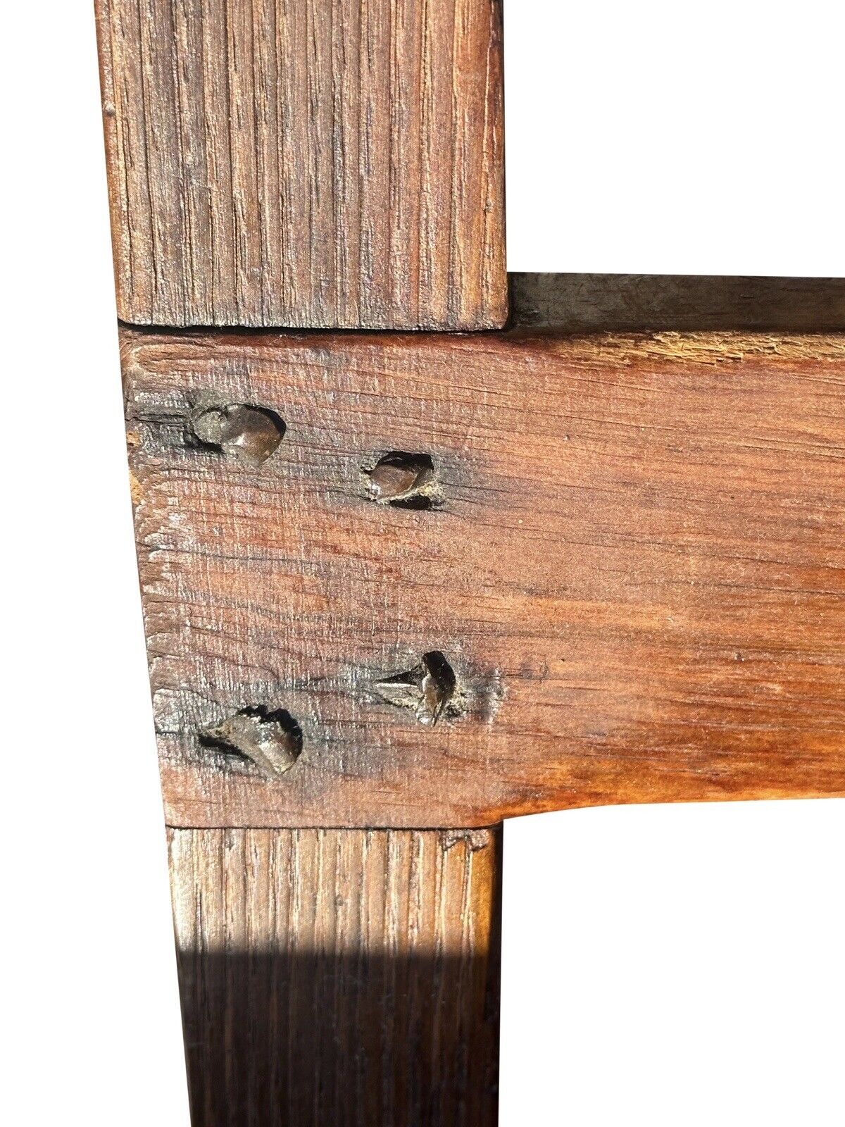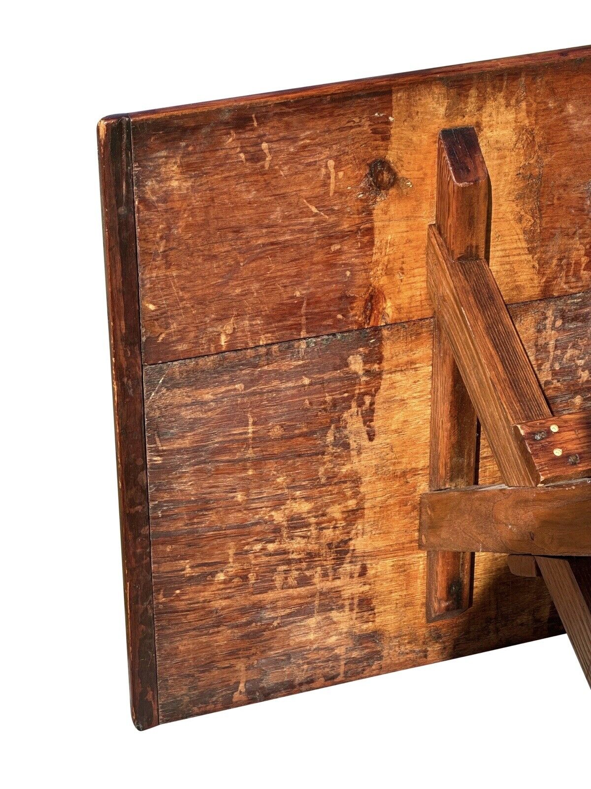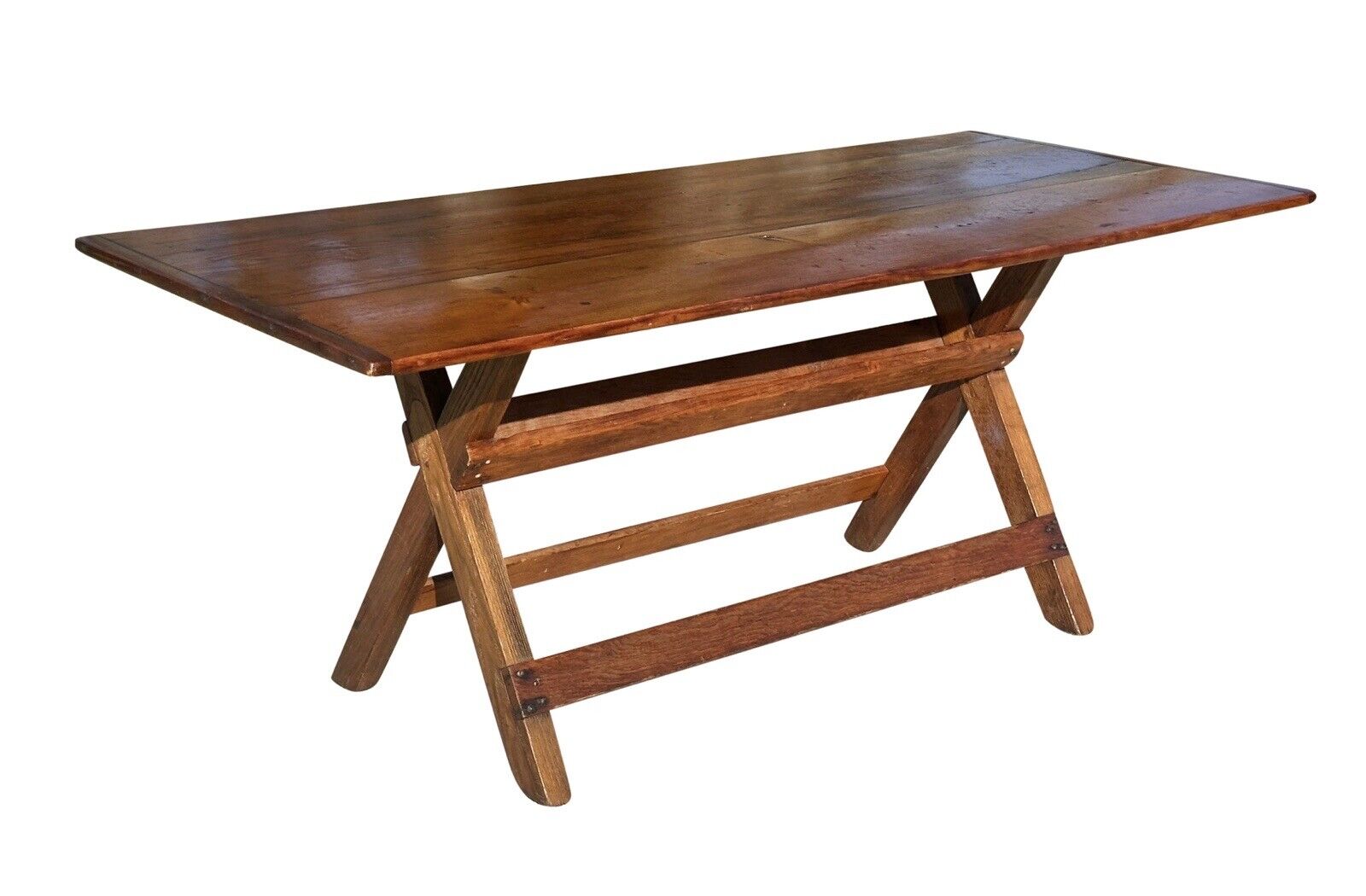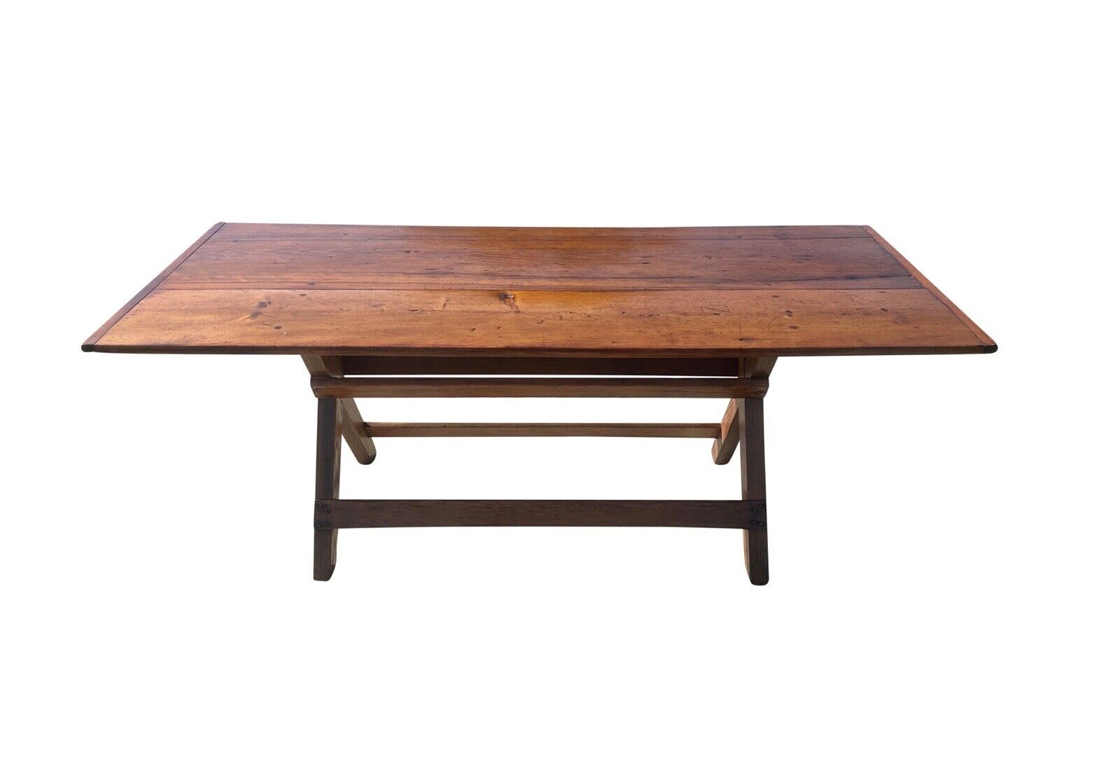With our highest compliments Bay Colony Antiques takes the utmost pleasure in offering this remarkable late 19th century antique sawbuck dining table. We are constantly in pursuit of high quality primitive form dining tables for our clients with rustic interiors across the country and with respect to our current offering we feel that few if any examples currently on the market can contend with this table. Sawbuck tables are considered among the rarest forms of antique dining tables from rural settings and generally they do not exceed four feet in length as most early homes lack an abundance of interior space. Antique primitive tables designed to seat a large family gathering are regarded as farm tables in the five to six foot range or harvest tables as they approach six to eight feet in length. The largest antique harvest tables command a premium in the antiques market with the average price generally hovering around $5,000. Most of what we encounter today are contemporary reproductions made with antique floor boards for the tops and sit on turned legs. The true antique tables built for antique farmhouses were quite often left outside in barns for years and disregarded to the point of being beyond restoration. The understated brilliance of the sawbuck table form is the "X" shape stretcher which transfers stress through the table towards the ground and along with the continual stretcher spanning across the table length hardly any structural maintenance is ever required. Tables with turnings, stretchers, or common form leg bases always need attention from antique restorers every generation and those which are neglected typically fall into disrepair and are thrown away.