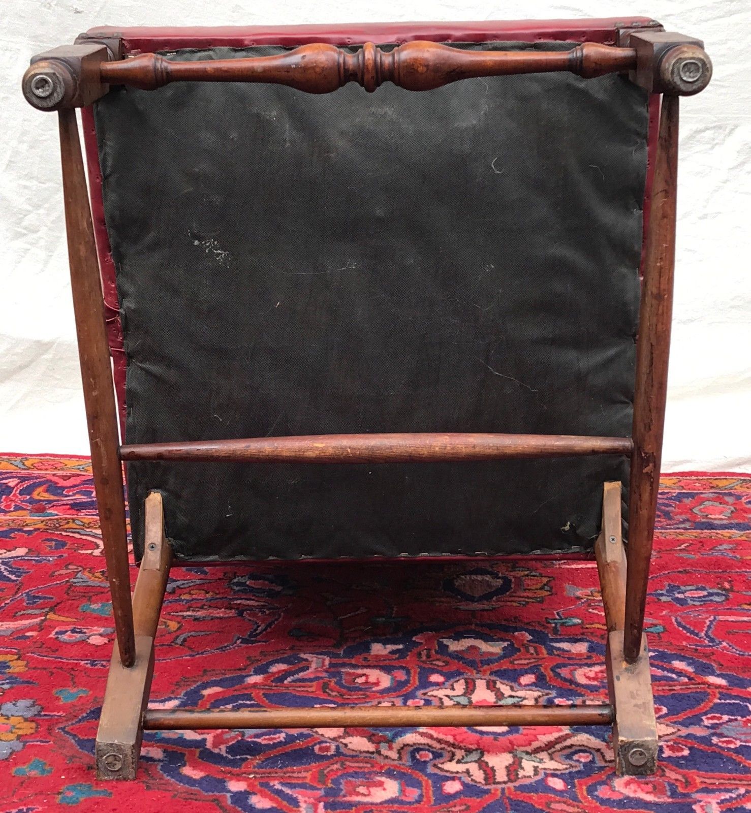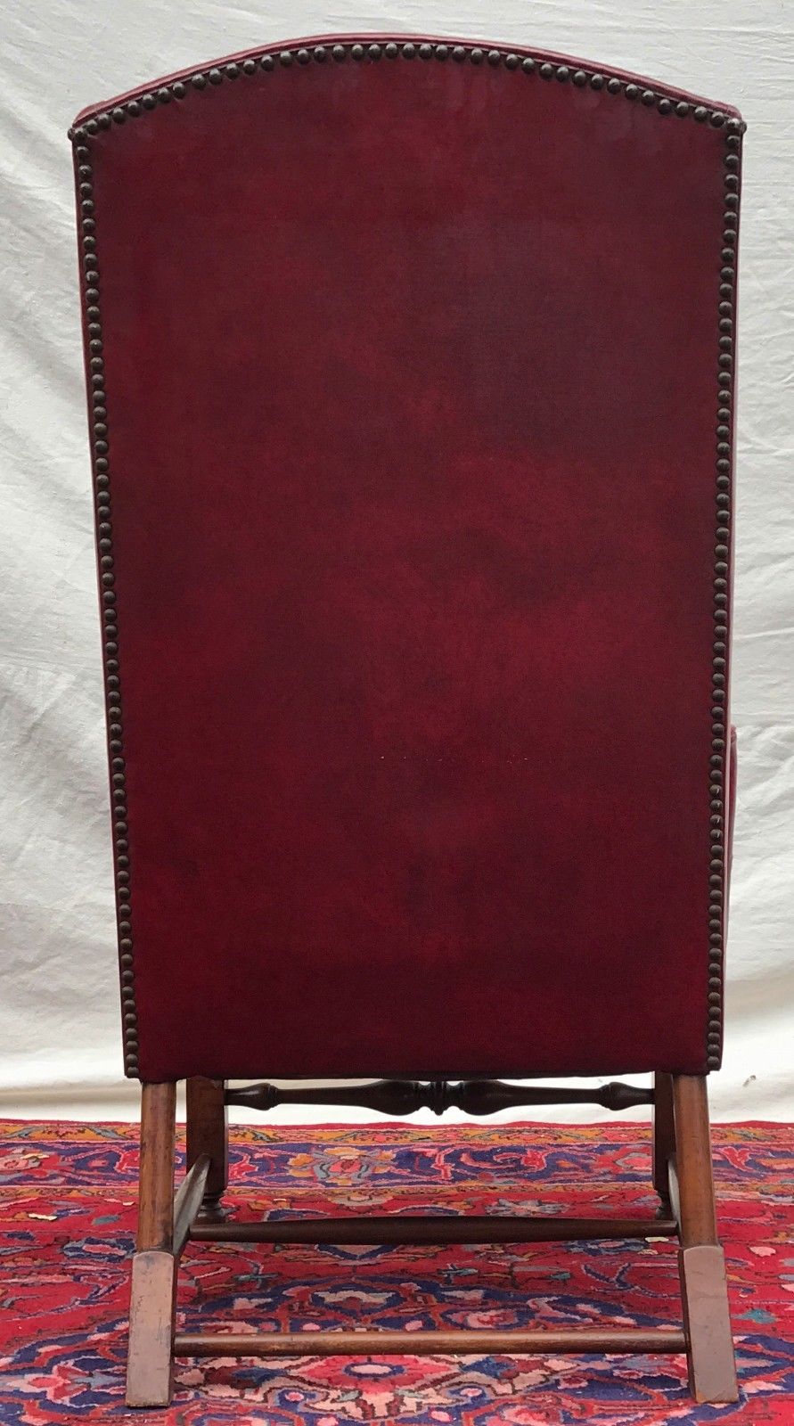 With our compliments we are pleased to offer you this very high quality William & Mary styled red leather wing chair. It employs a well executed stretcher base with bulbous turned front horizontal stretcher, nicely turned front feet, splayed rear legs decorative brass tacts and smartly appointed rolled arms. It is 26" wide from arm to arm, 27" deep, 46" tall with a 21" high seat.