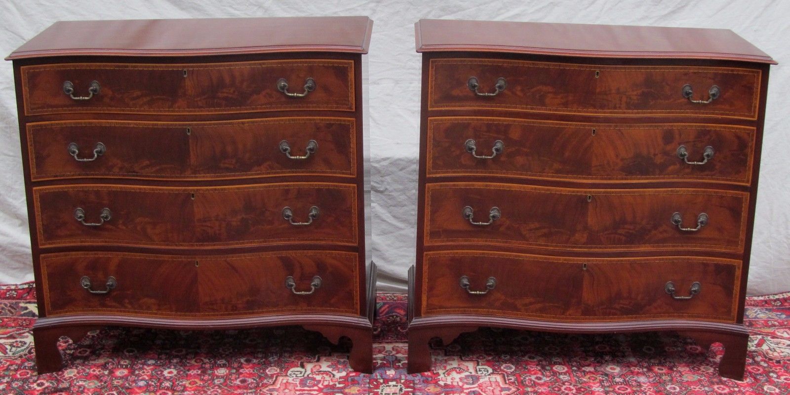 PAIR OF CHIPPENDALE SERPENTINE INLAID MAHOGANY BACHELORS DRESSERS BY J. GERTE