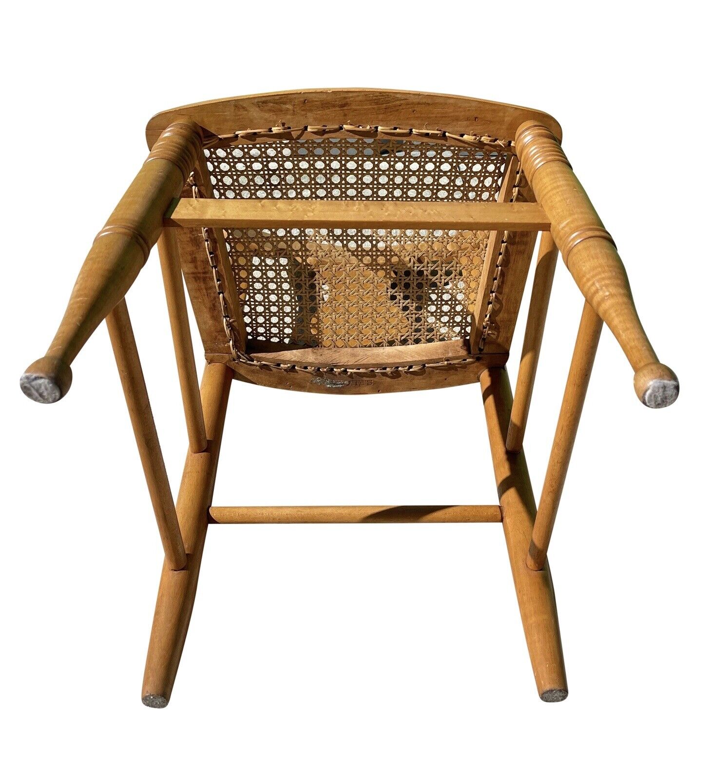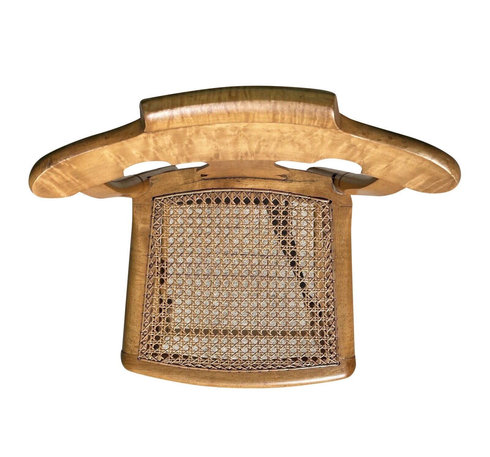 Each chair is constructed of the highest grade of figured bird's eye maple and feature contoured crest rails and back splats which provide the sitter with a higher degree of comfort as compared to an ordinary chair made in the early part of the 19th century. The chairs have rolled crests, a sophisticated Grecian urn formed back splat and a firm caned seat. The turned legs are strengthened by double stretcher supports and a curved front stretcher rail. The seats are rolled to provide comfort at the back of the sitters knees and the chairs terminate on wonderful ball feet turned in the Sheraton manner. These chairs are sturdy and perfectly suited for everyday use despite being over two centuries old.