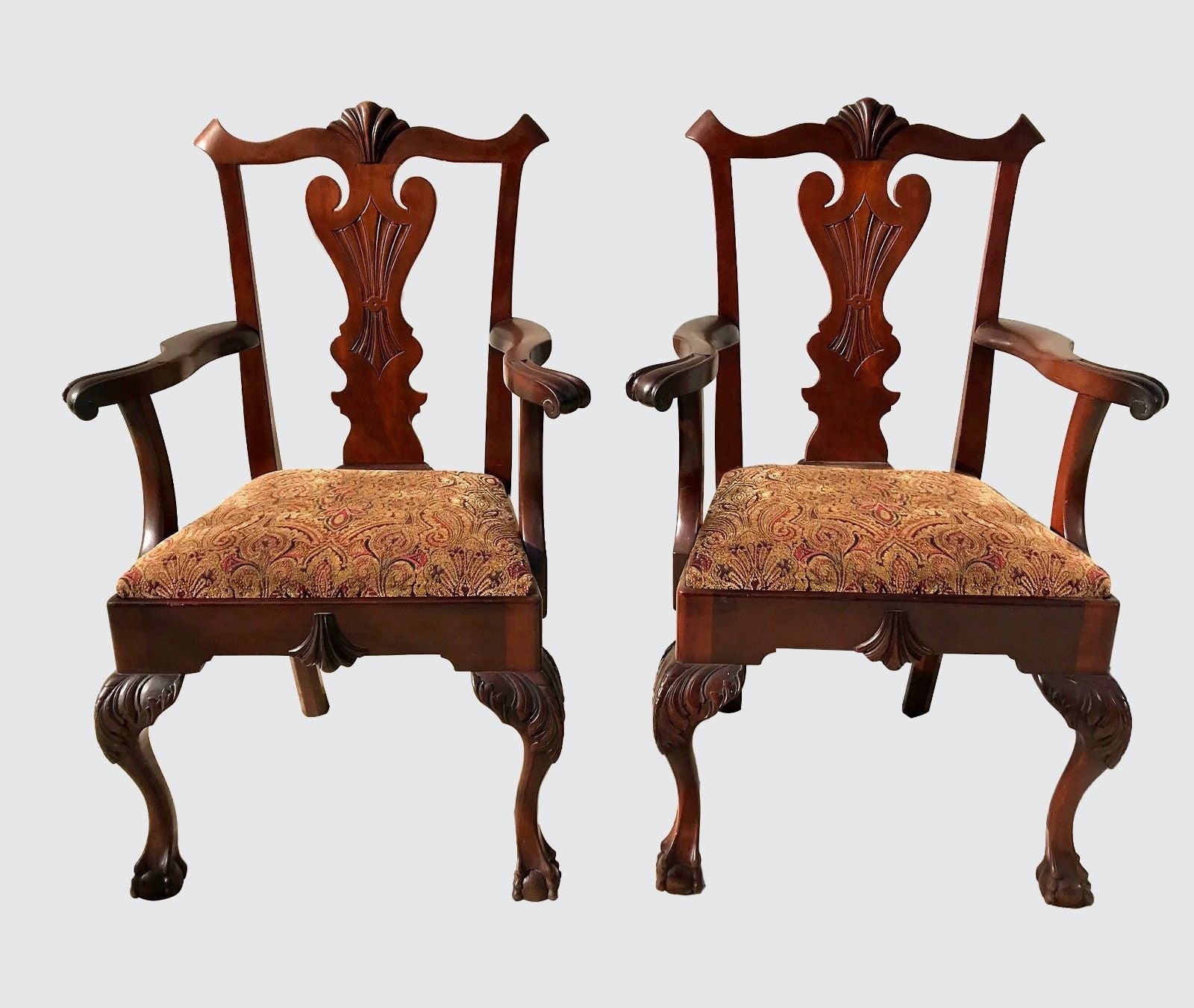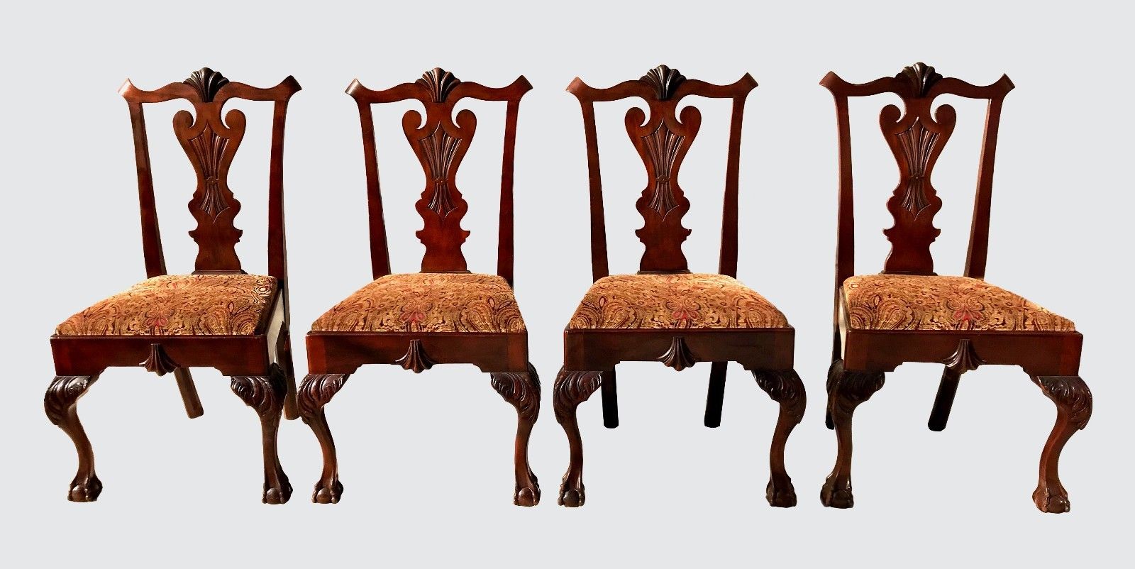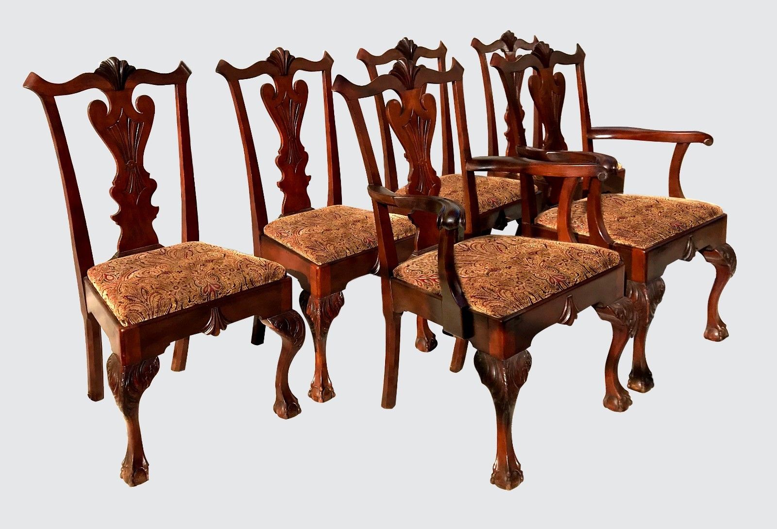 We are honored to offer you this wonderfully crafted set of six antique Chippendale styled mahogany ball & claw dining room chairs. Influenced by the Pennsylvanian to Virginian interpretation of Gothic Chippendale form. Each chair possesses rolled top rail ears with carved center shells over large heart shaped back splats again embellished with additional carvings. These completely unique set of chairs have excellent scale with rake and splayed back hexagonal carved rear legs and front flaring carved knee cabriolet legs over ball & claw feet. The chairs have large robust seat boxes that hold their drop in slip cover seats. The moment you lift these chairs their weight alone tell you that these are very high quality solid mahogany antique Chippendale dining room chairs. These are not Beech or white wood chairs so often passed off as mahogany. The set consists of 2 arm chair and 4 side chairs. The arm chairs have huge rolling carved arms that are 27" long from arm to arm, 19" wide, 40" tall with 19" high seats. They have a very nice original finish is original with some desirable wear in the stain that give them a rich patina.