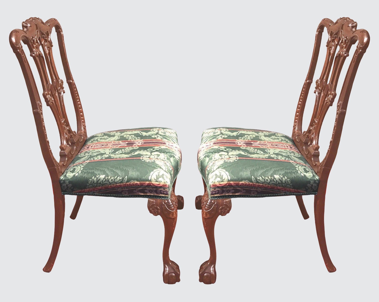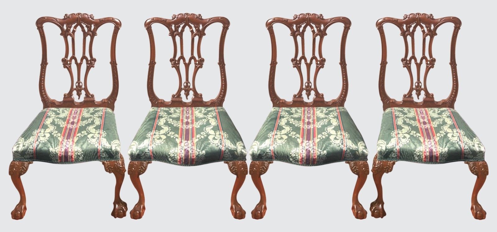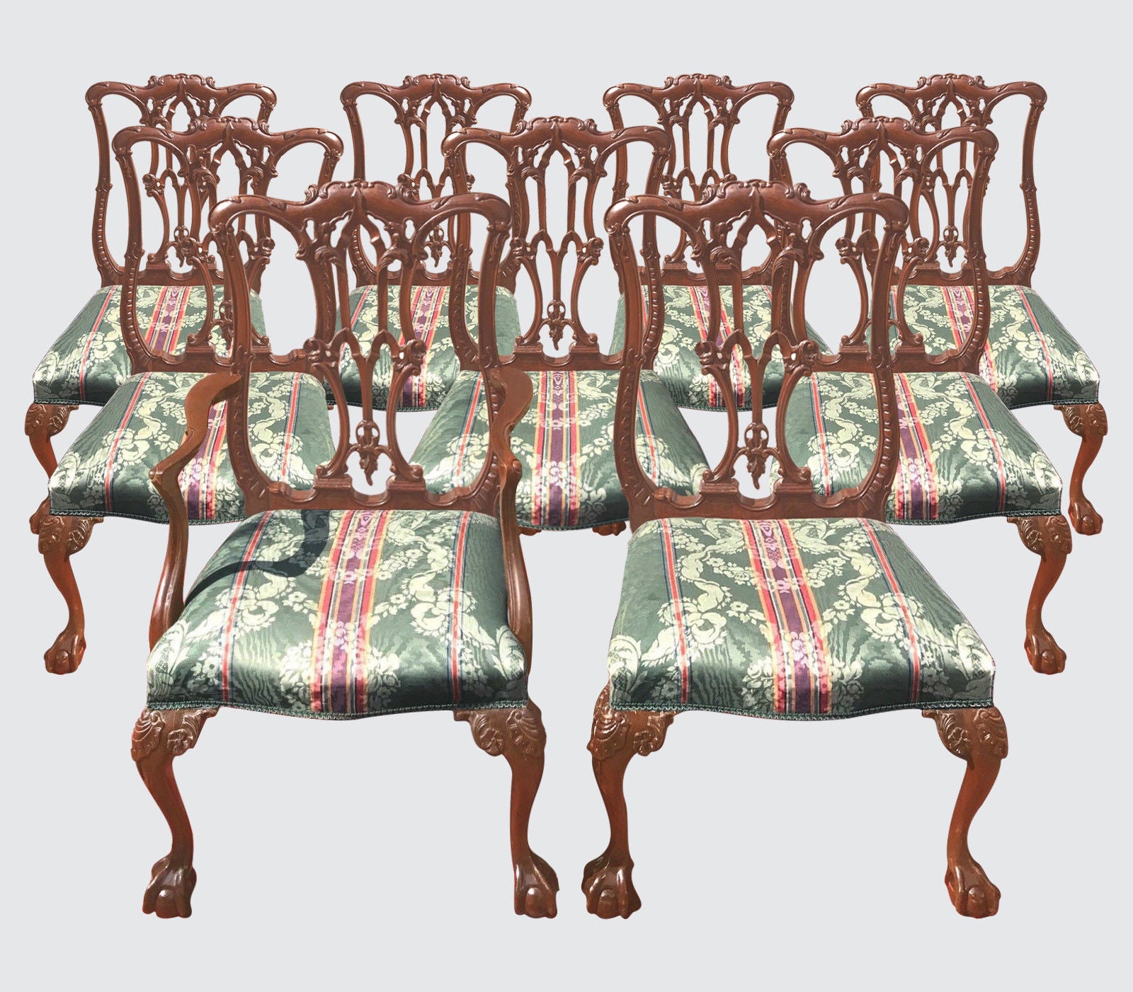 We are delighted to offer you this exceptionally fine set of nine antique Chinese Chippendale style mahogany dining room chairs. We are selling these as a set of 8 with a 9th chair thrown in. The set consists of one arm chair and 8 side chairs. Fine sets of antique mahogany dining room chairs are one of our specialties. We routinely sell the finest sets in America on consistent basis and this set is something unique and of ultra high quality. Sets of true Chinese Chippendale dining room chairs are very tough finds. These are big comfortable chairs standing 41" tall, 19" deep with 23" wide seats that are 18" high. They are highly embellished with ball & claw feet, splayed pad rear legs with graceful rakes, serpentine seat rails and highly adorned by carved rosettes and decorated all over. They were professionally re-upholstered about 5 years ago employing top quality workmanship. The fabric is in fairly good condition with our noting some small staining and one having a small back tear. You are buying from photographs so we do our absolute best to give you the most subjective inspections of all our offerings.