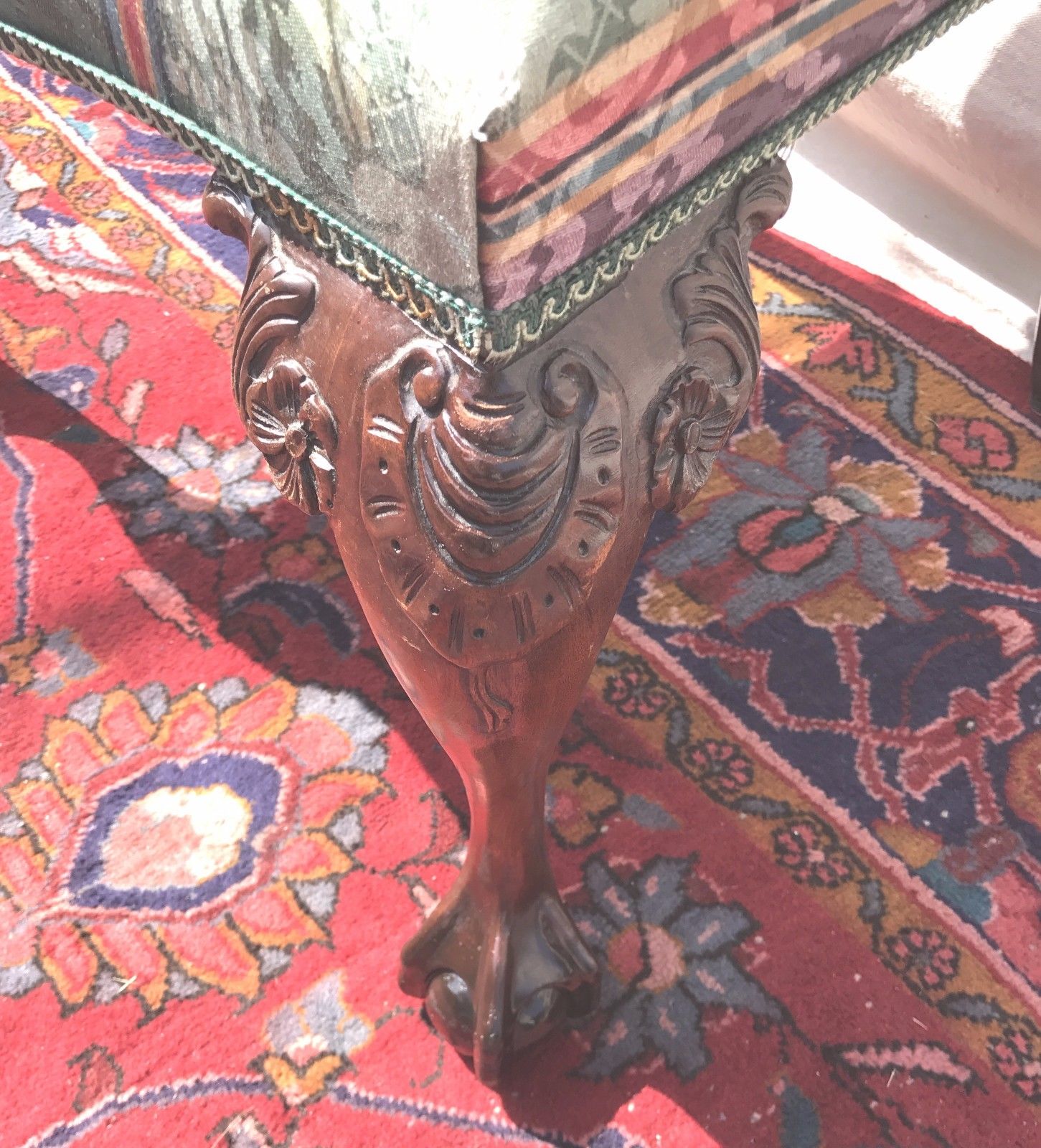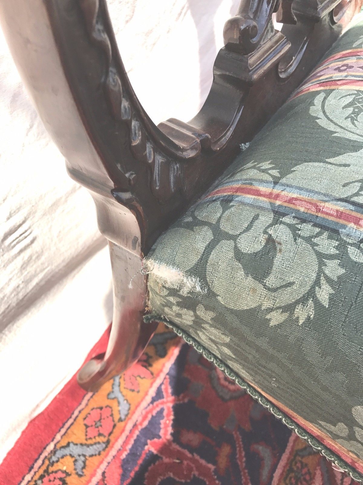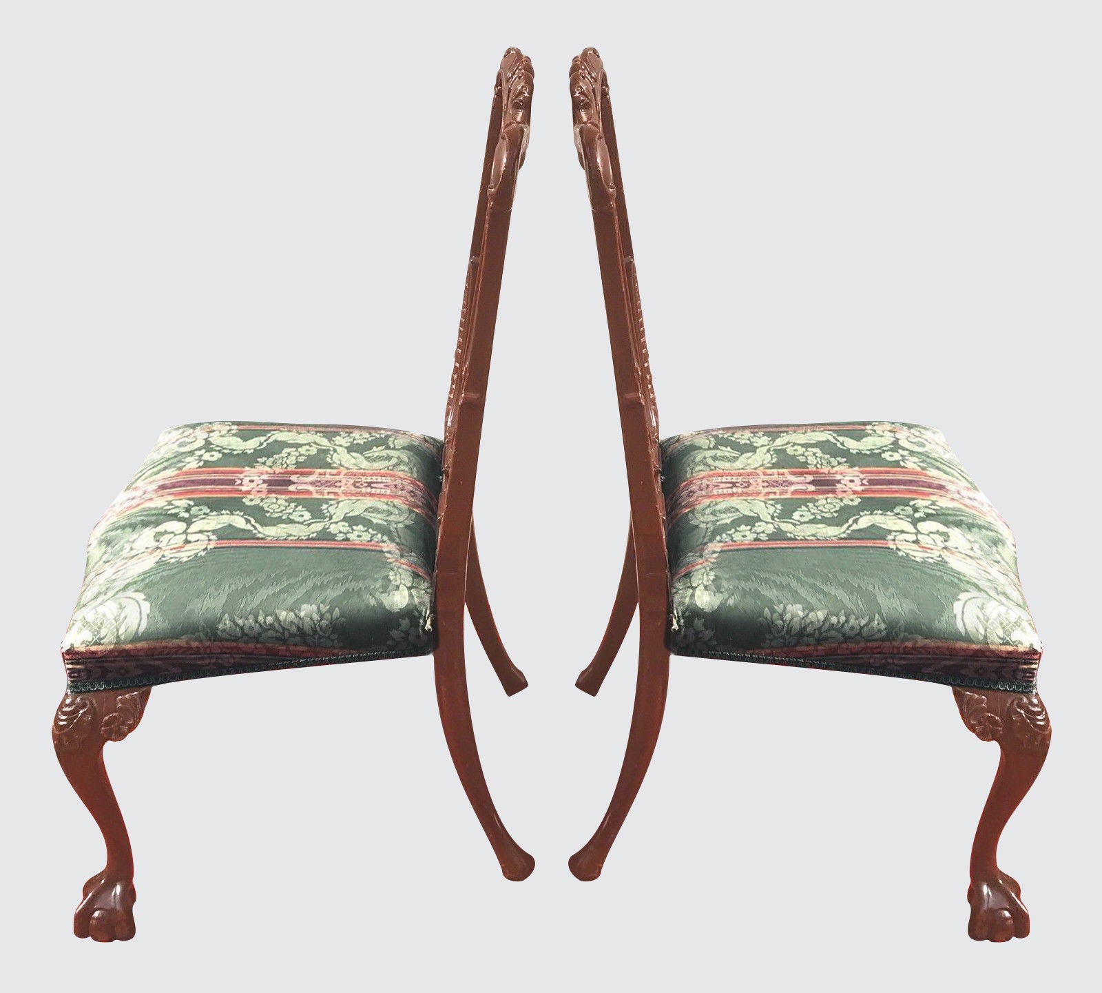 We are delighted to offer you this exceptionally fine set of nine antique Chinese Chippendale style mahogany dining room chairs. We are selling these as a set of 8 with a 9th chair thrown in. The set consists of one arm chair and 8 side chairs. Fine sets of antique mahogany dining room chairs are one of our specialties. We routinely sell the finest sets in America on consistent basis and this set is something unique and of ultra high quality. Sets of true Chinese Chippendale dining room chairs are very tough finds. These are big comfortable chairs standing 41" tall, 19" deep with 23" wide seats that are 18" high. They are highly embellished with ball & claw feet, splayed pad rear legs with graceful rakes, serpentine seat rails and highly adorned by carved rosettes and decorated all over. They were professionally re-upholstered about 5 years ago employing top quality workmanship. The fabric is in fairly good condition with our noting some small staining and one having a small back tear. You are buying from photographs so we do our absolute best to give you the most subjective inspections of all our offerings.